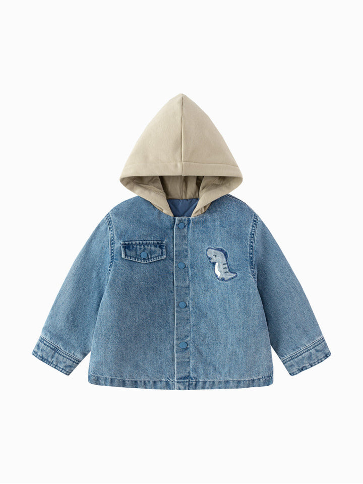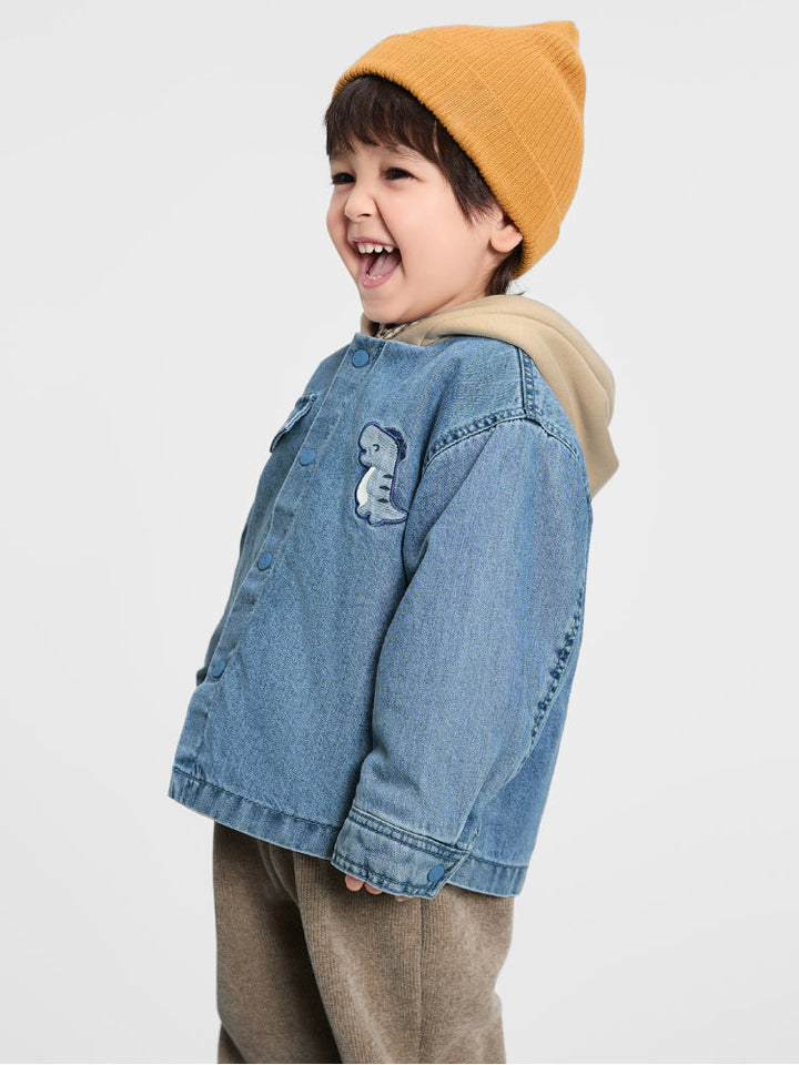 A casual denim jacket for kids, designed with a soft hood for extra comfort. Features snap button closure, a chest pocket, and a playful front patch detail. Perfect for layering on cooler days.