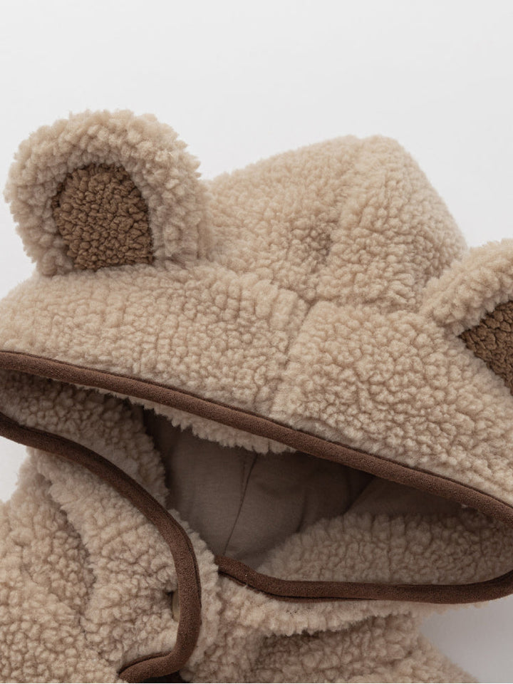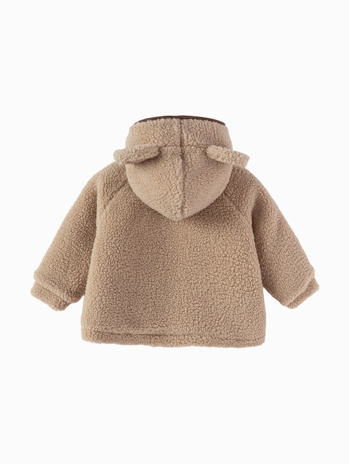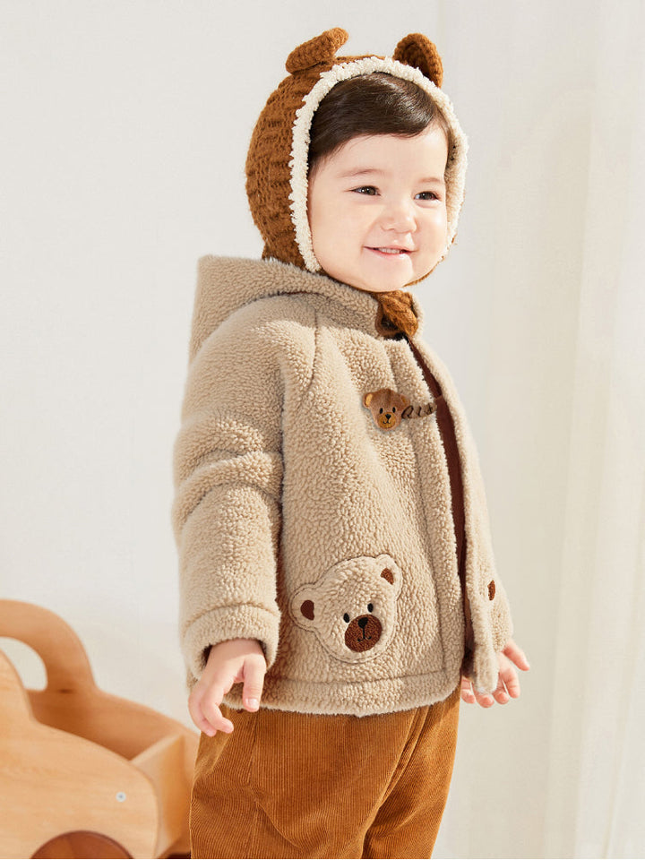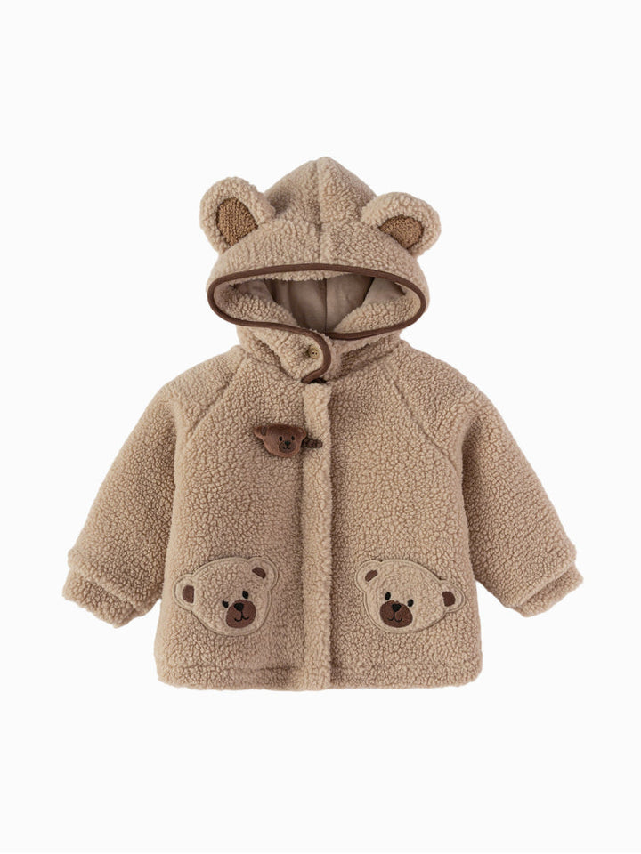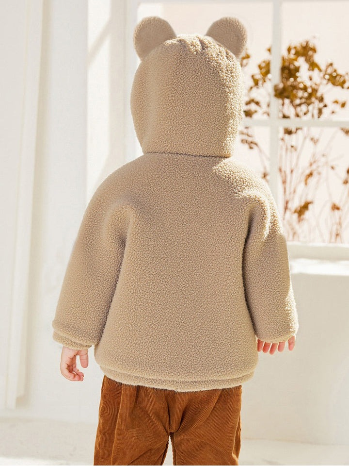 A cozy fleece jacket for kids, designed with a soft hood featuring cute ear details. Includes playful front pockets and a secure closure to keep little ones warm and comfortable during cold days.