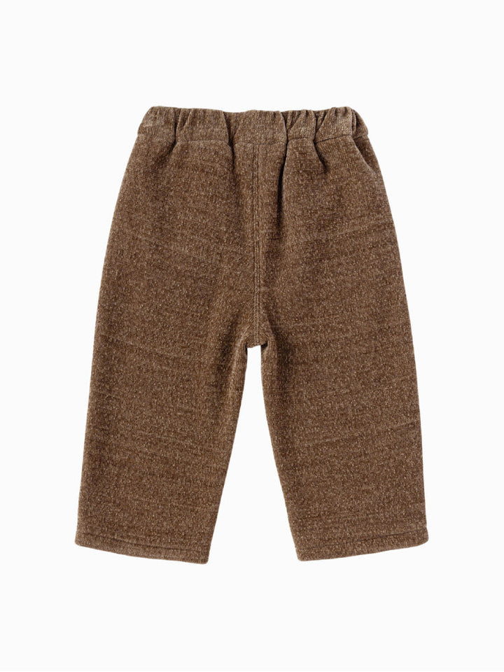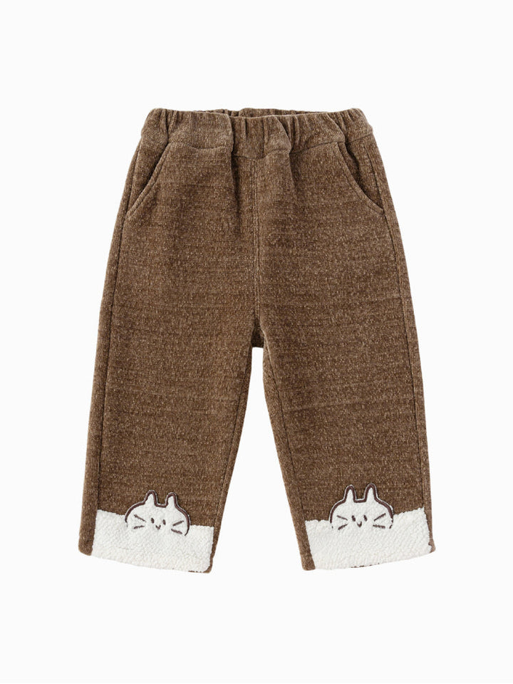 Warm and cozy fleece pants for kids, featuring an elastic waistband for comfort and side pockets for practicality. The hems are decorated with playful cat patches and soft sherpa-style trims, adding a cute and snug finish. Perfect for colder days and casual wear.