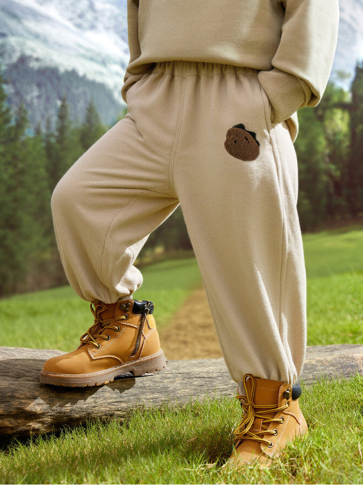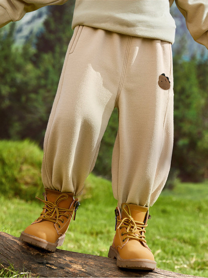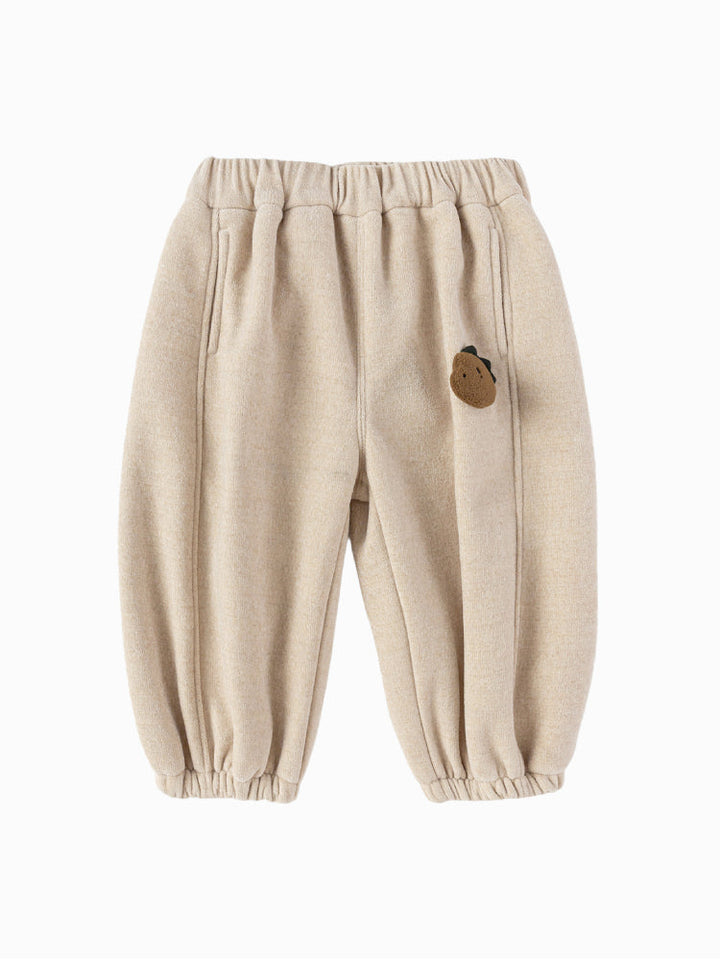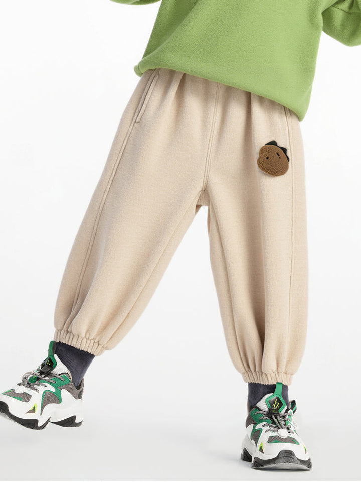Comfortable jogger pants designed with an elastic waistband and gathered cuffs for a snug fit. Features a playful side patch that adds a fun touch to the casual style.