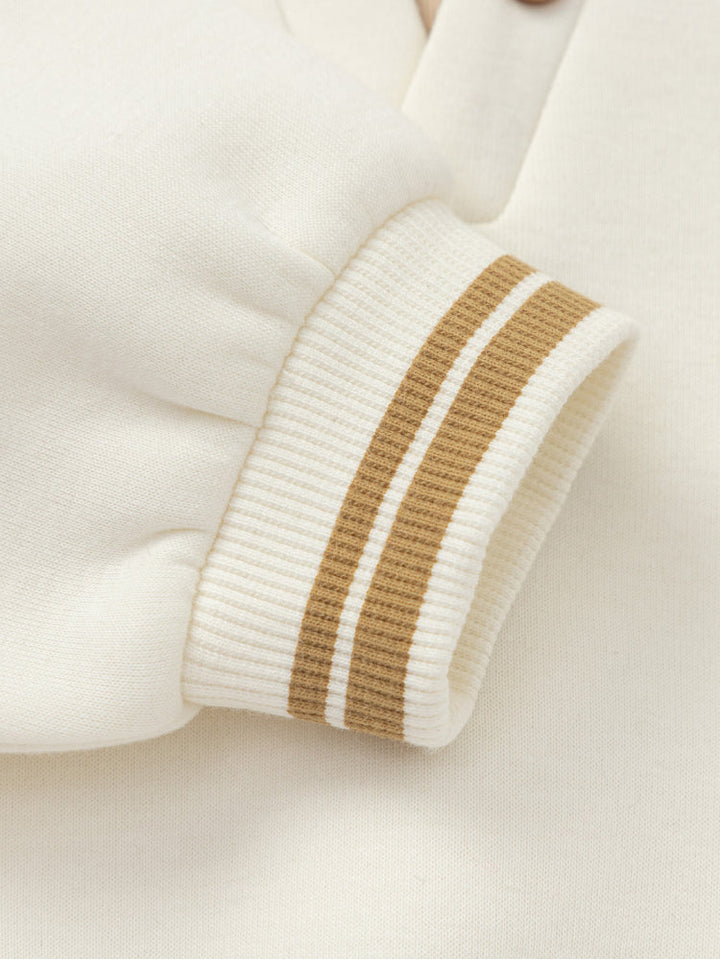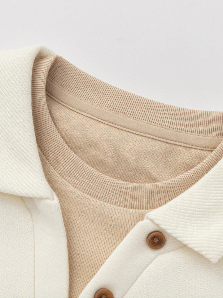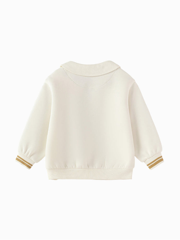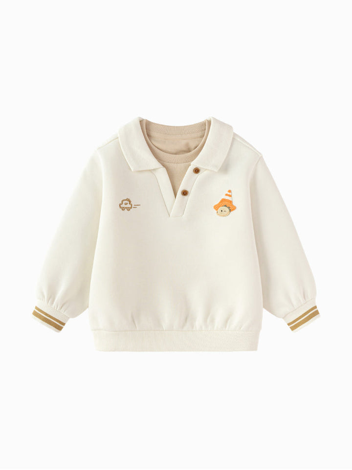 Casual kids sweatshirt designed with a classic polo collar and front button closure. Features playful embroidered details for a fun touch. Long sleeves with ribbed cuffs provide comfort and a snug fit, making it perfect for everyday wear.