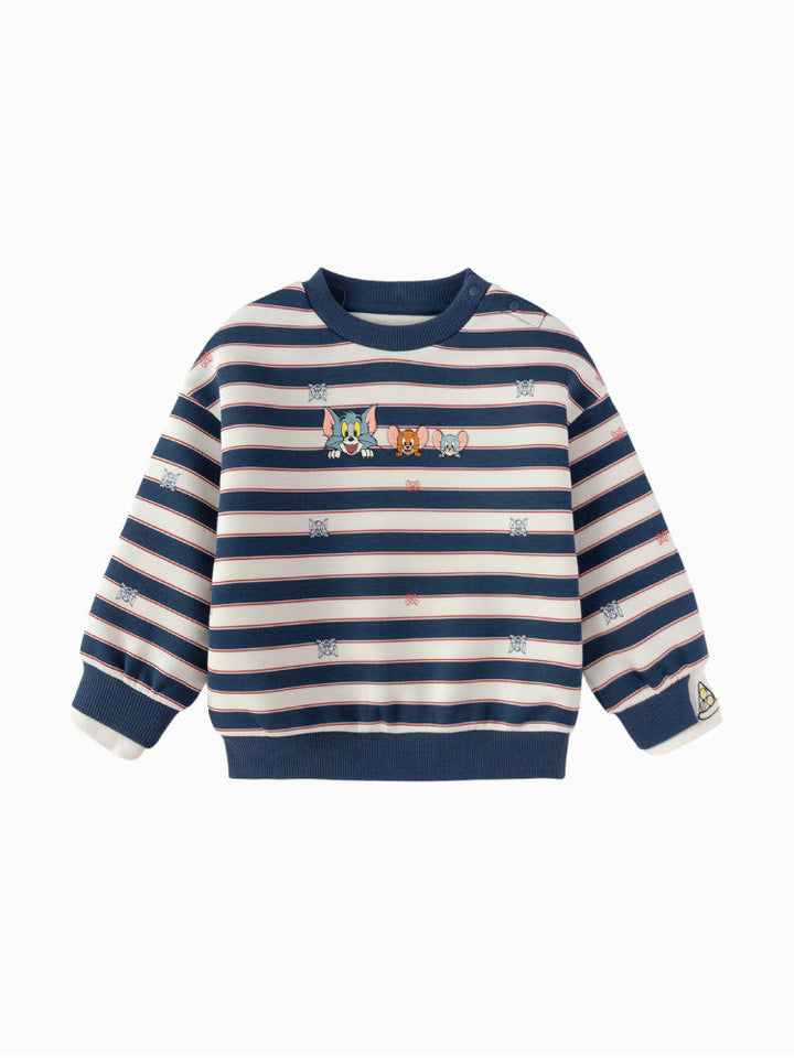 Playful kids sweatshirt with a striped pattern, featuring Tom & Jerry character prints at the front. Made from soft fabric with ribbed cuffs and hem for a cozy fit, perfect for casual daily wear.