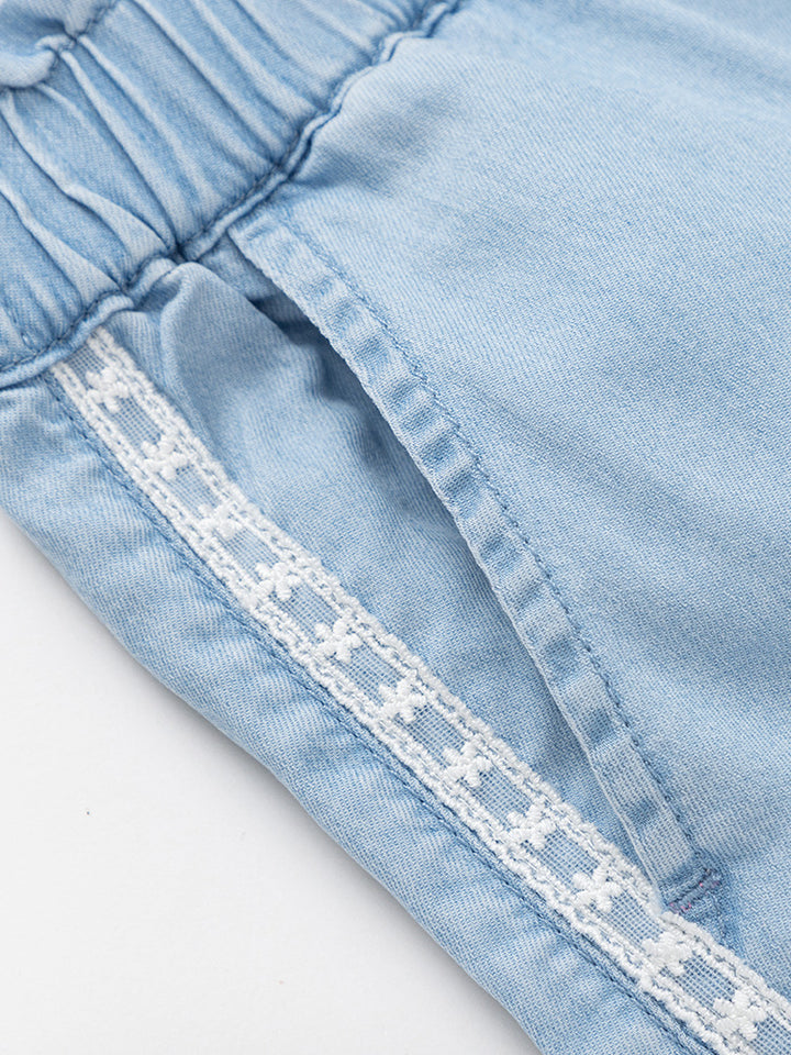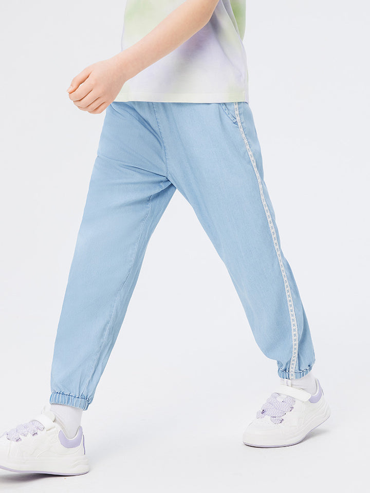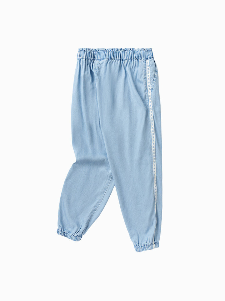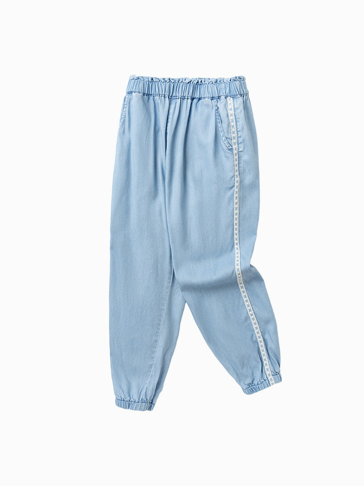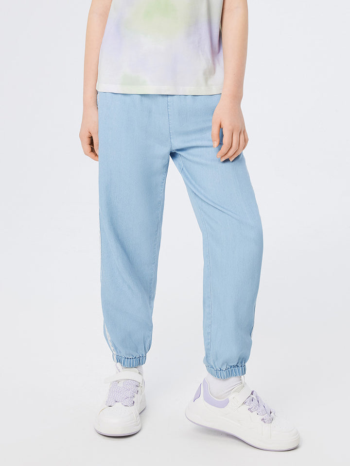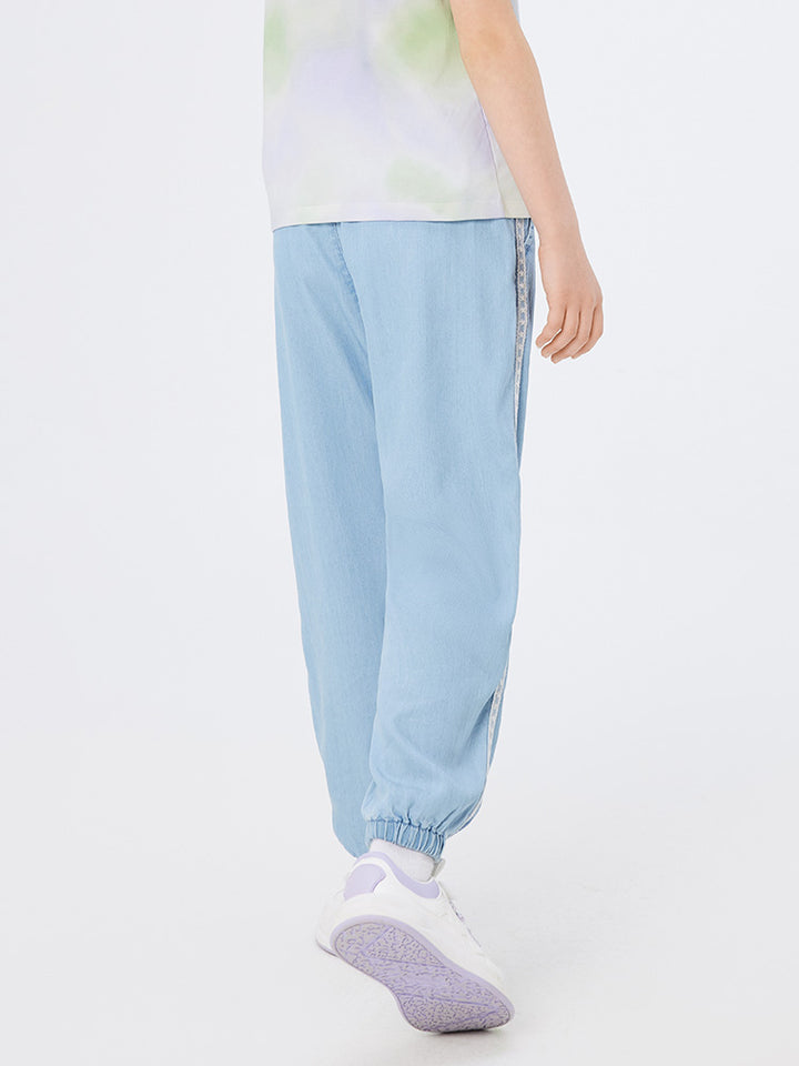 casual denim pants decorated with lining details on the sides of both legs, comes with pockets on the front side and with elasticated anklets and waistband