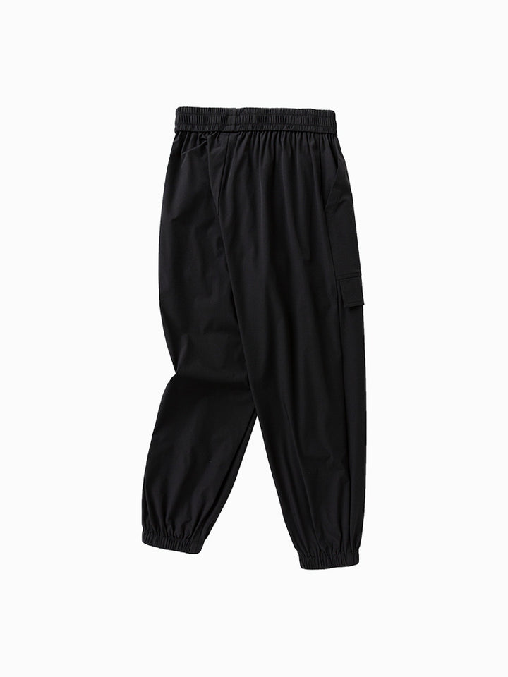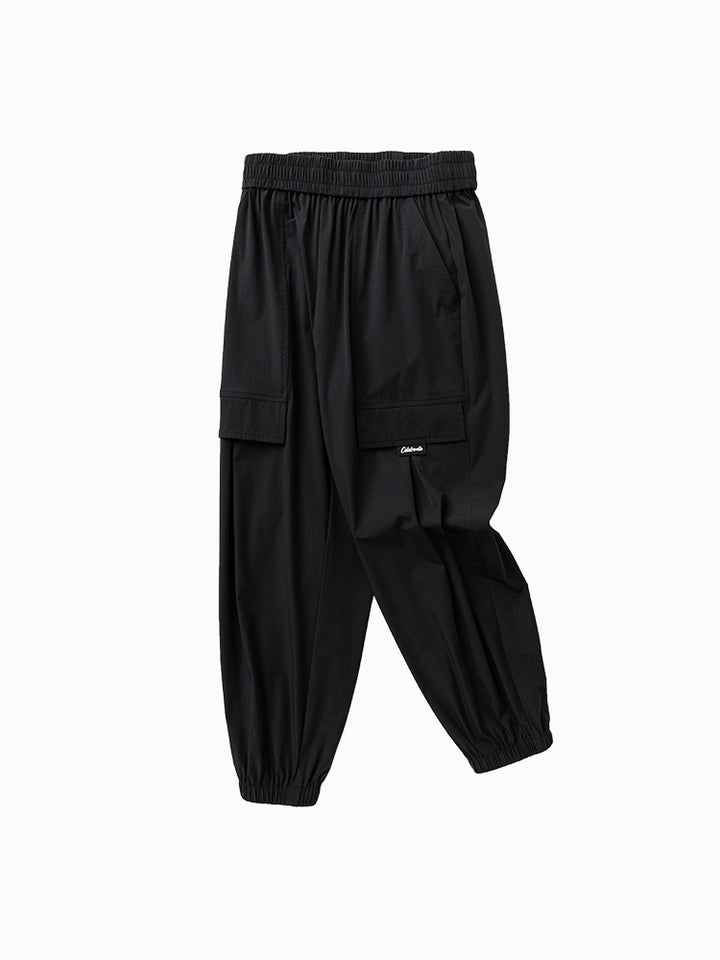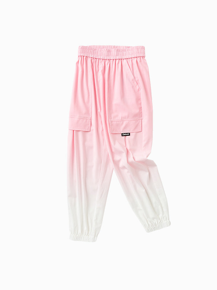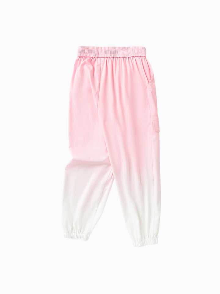 casual pants in a flowy style design, decorated with a gradient contrast colored pattern, comes with pockets on the front side and with elasticated anklets and waistband