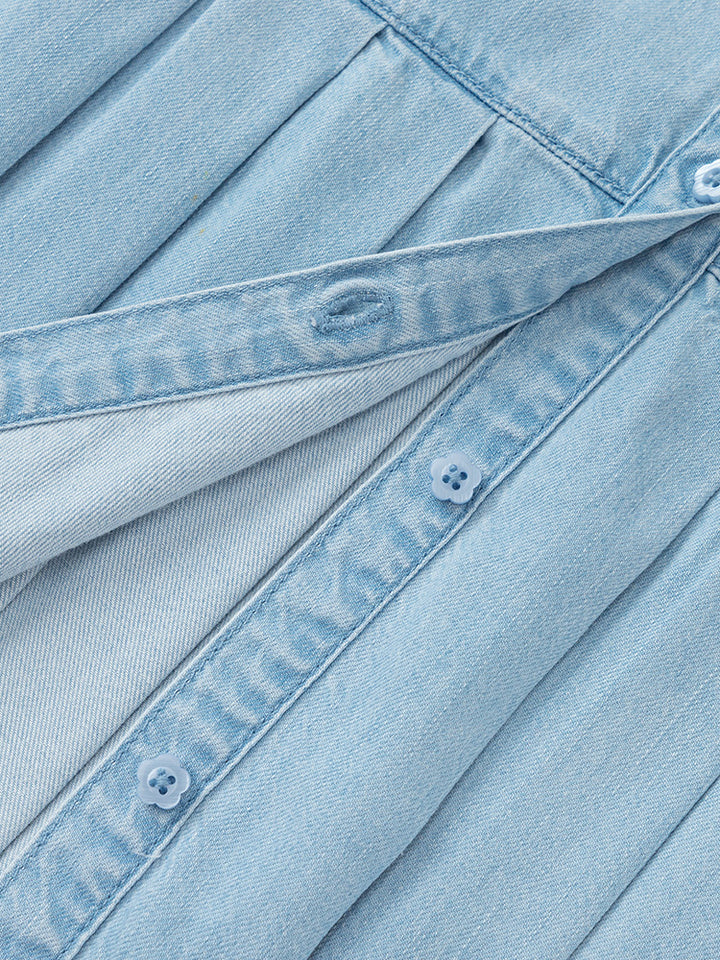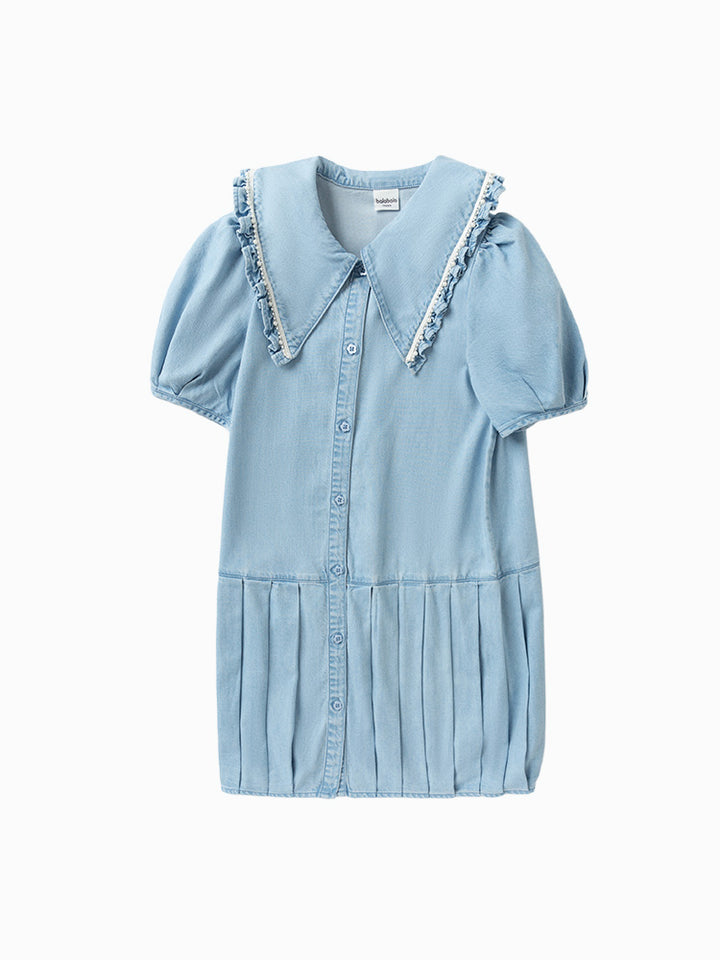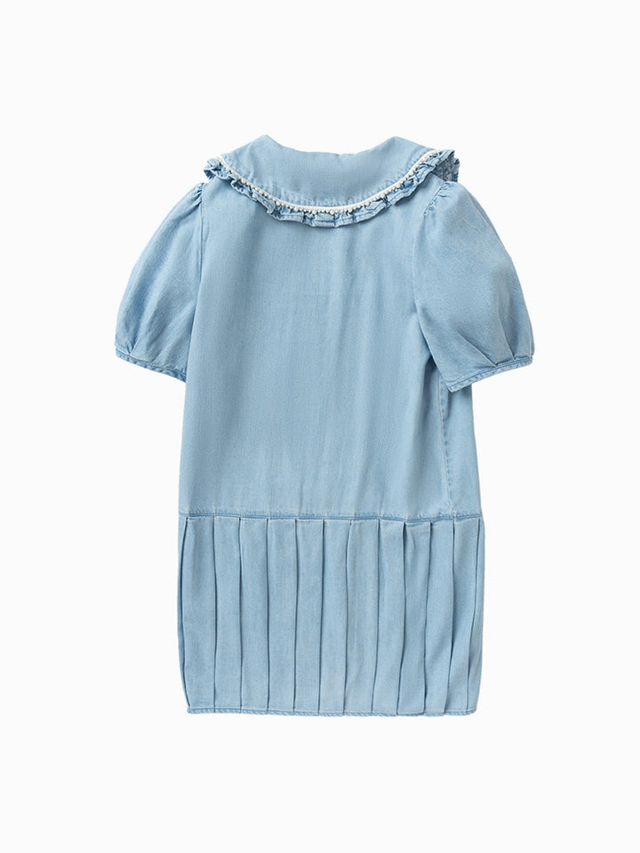 short sleeves denim dress in shirt style design and a plain mono colored pattern, decorated with pleated details on lower side, comes with buttons for closure on the front side and with a ruffled wide cut collar