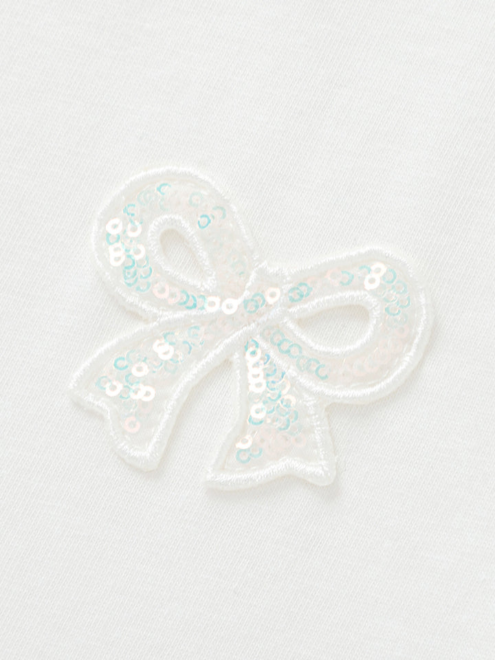 short sleeves t-shirt in a solid mono colored pattern, comes with a chiffon puffed style sleeves, decorated with sequinned embroidery detail on chest front side, comes with a crew cut neck