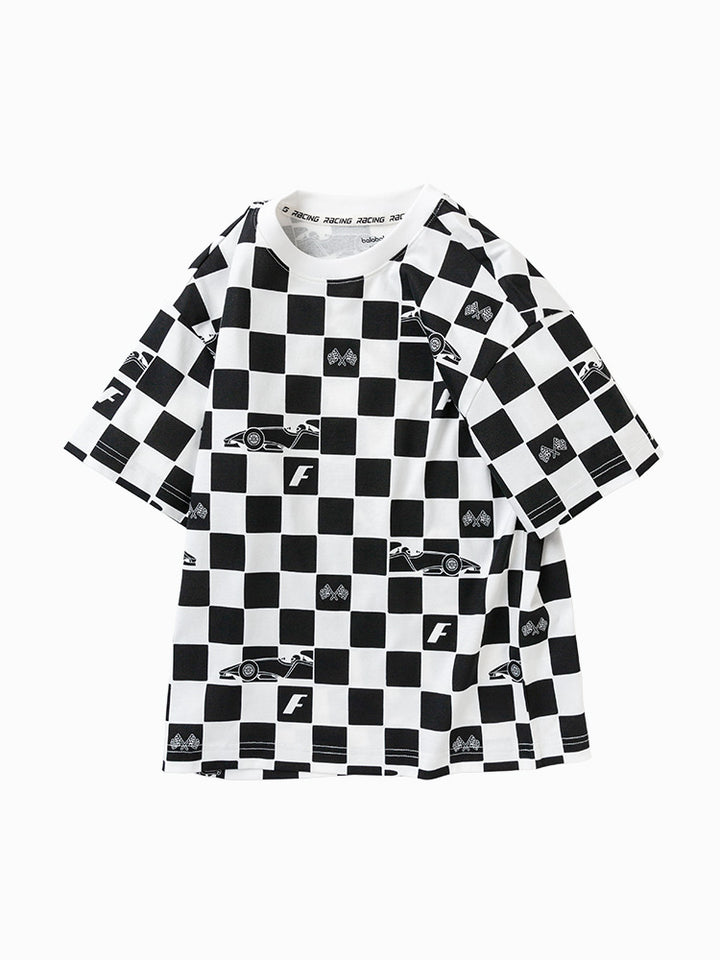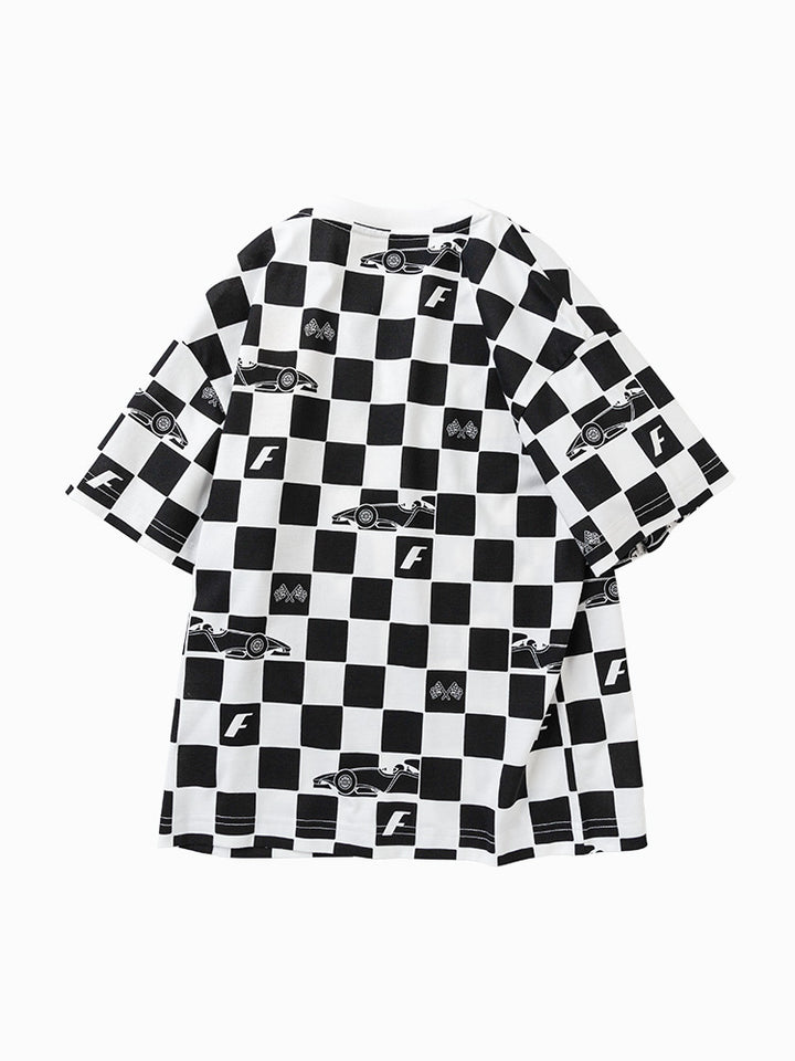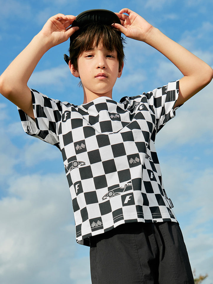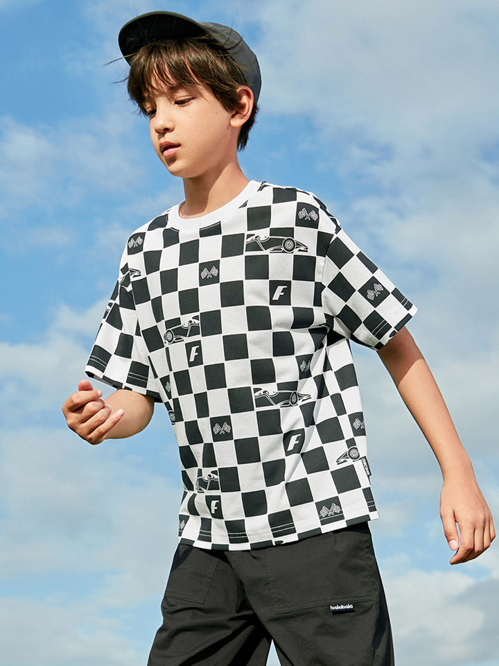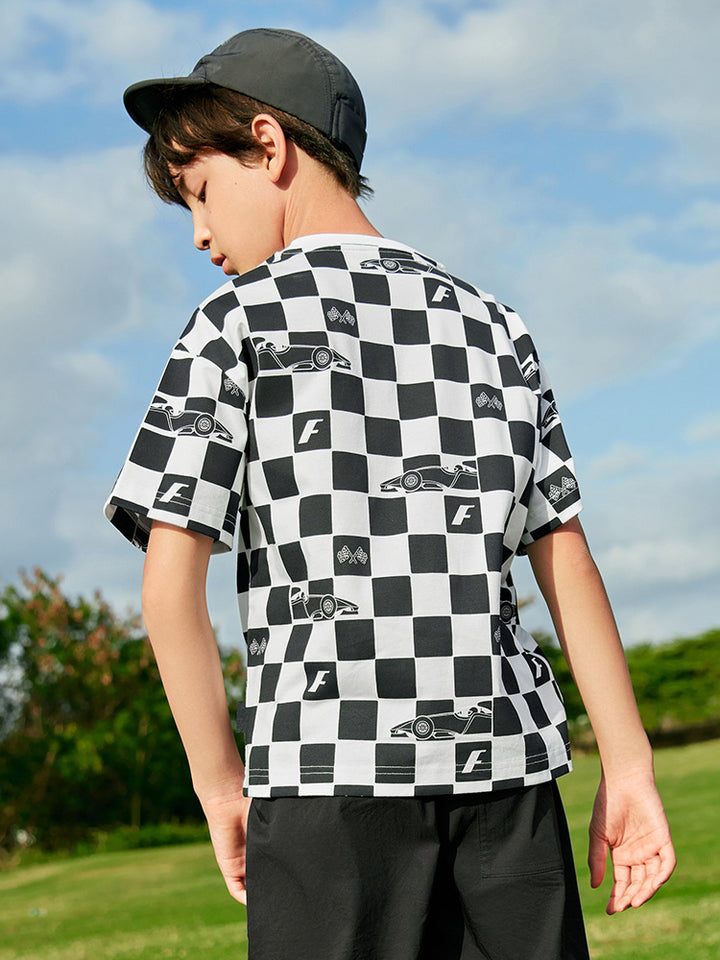 short sleeves t-shirt decorated with a printed pattern and comes with a rounded shape neckline