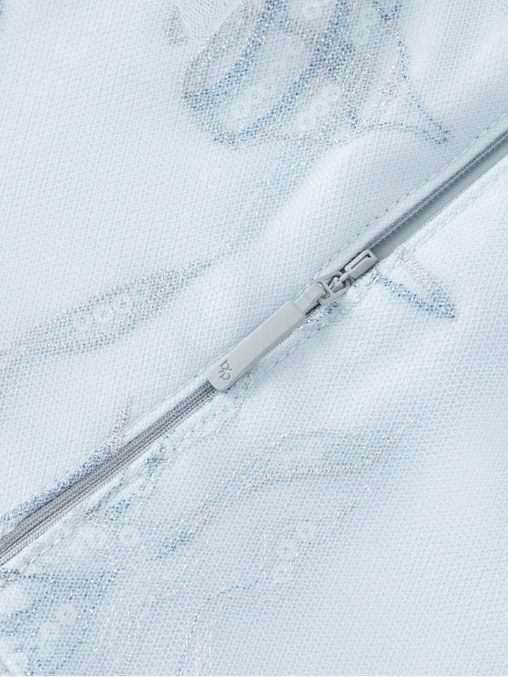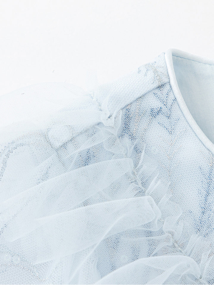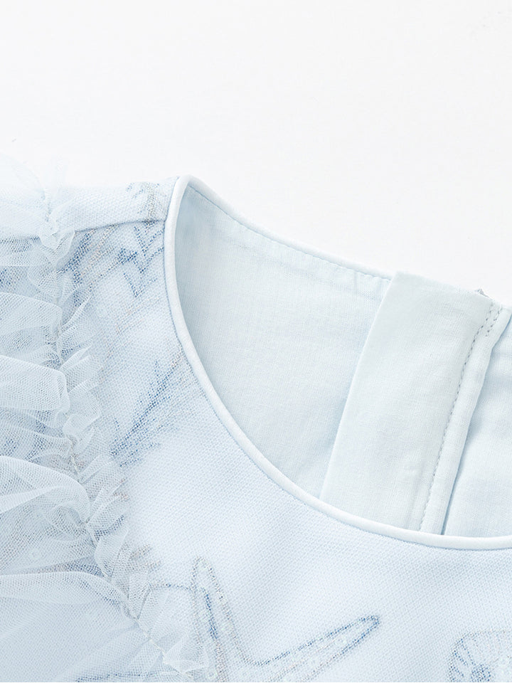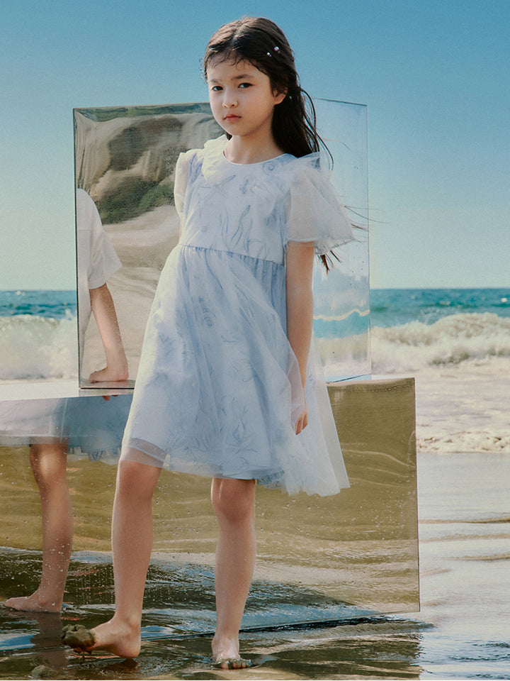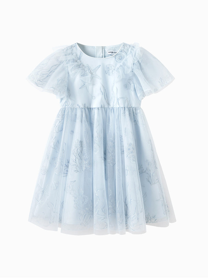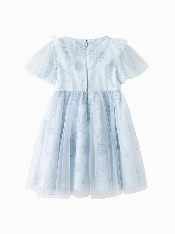 short sleeves girls dress in a flowy style design, decorated with an embroidery and sequinned pattern fabric with a mesh tulled fabric layer, comes with a zipper for closure on the front side and with a rounded shape neckline