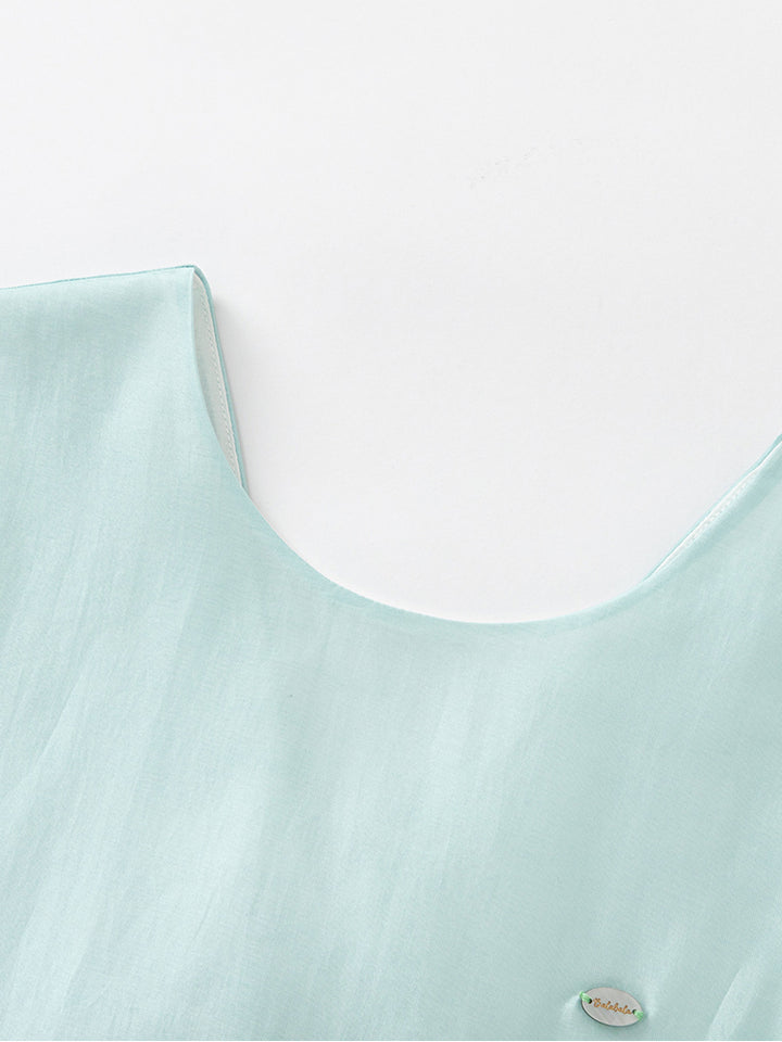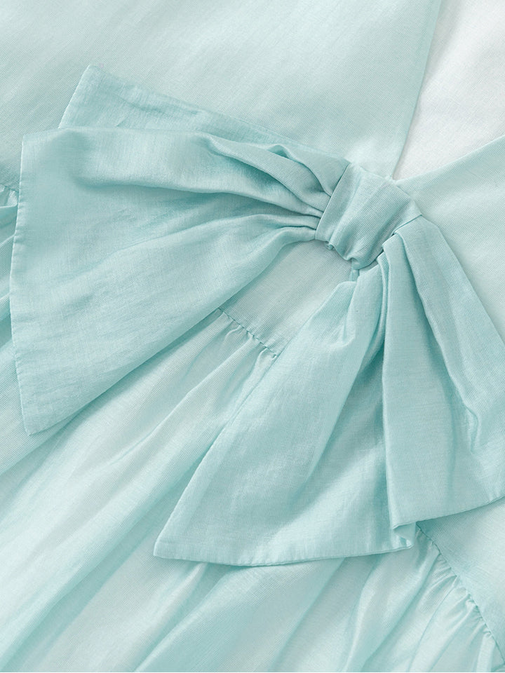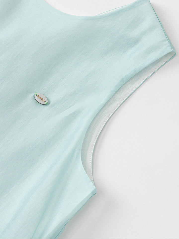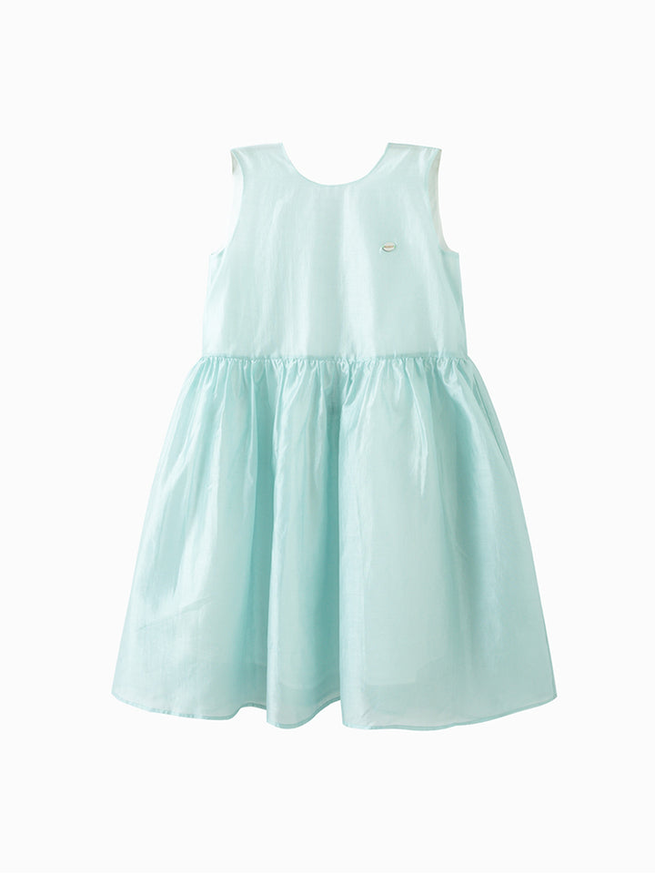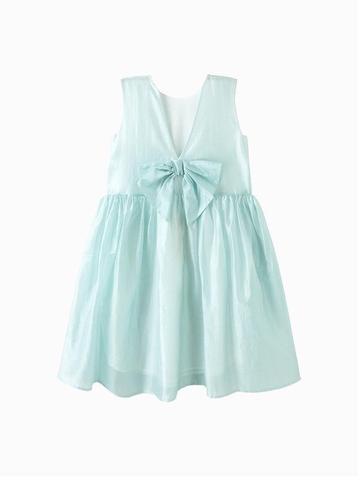 sleeveless flowy girls dress in a solid mono colored pattern, decorated with a bow tie on the back side, and with a rounded shape neckline