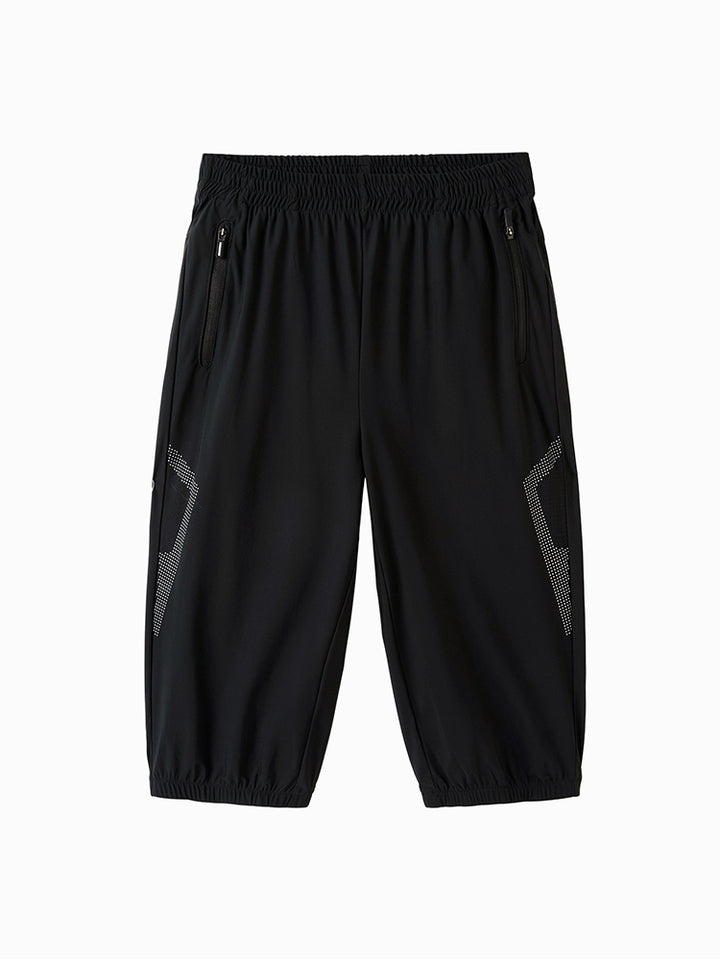 casual boys cropped legs pants, decorated with small dots details on the sides of both legs, comes with zipper pockets on the front side and with a comfy elasticated waistband
