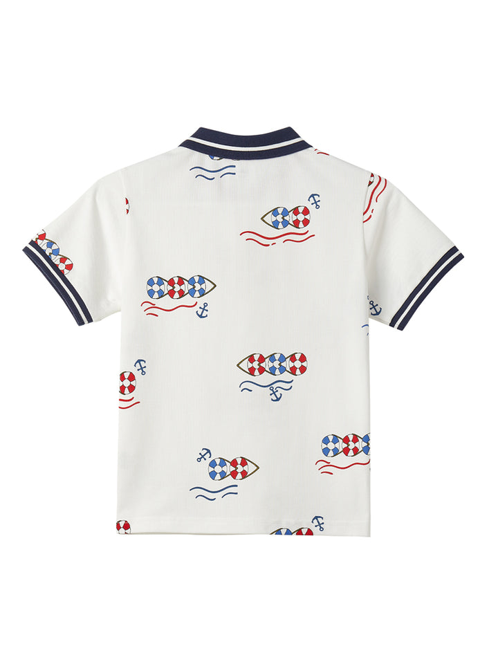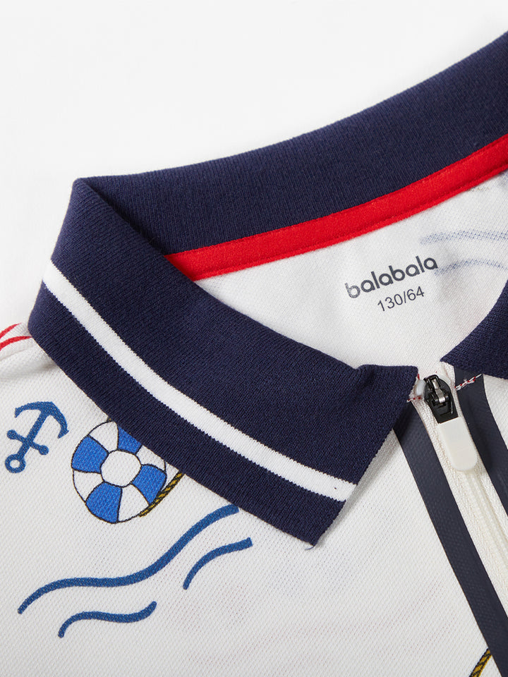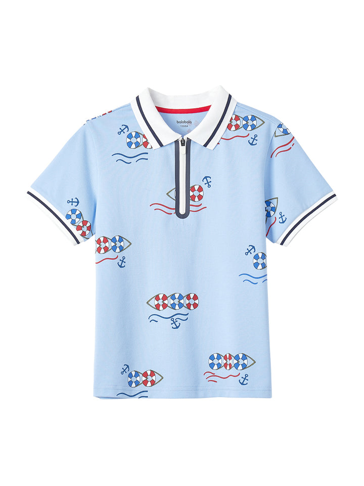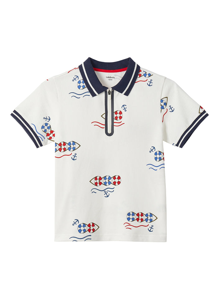 short sleeves casual polo t-shirt, decorated with a colored printed pattern, comes with zipper for closure on the front side and with a classic regular collar