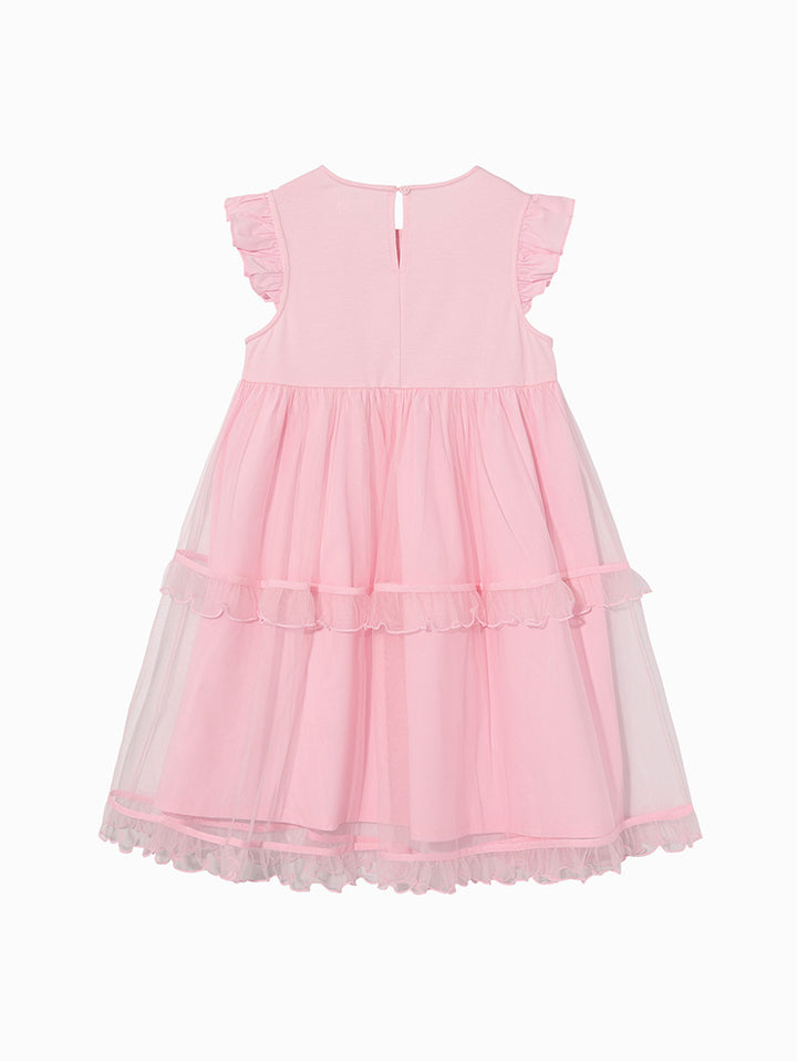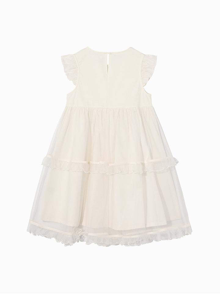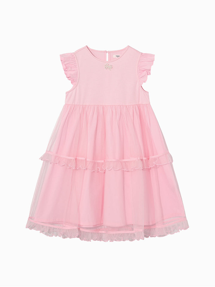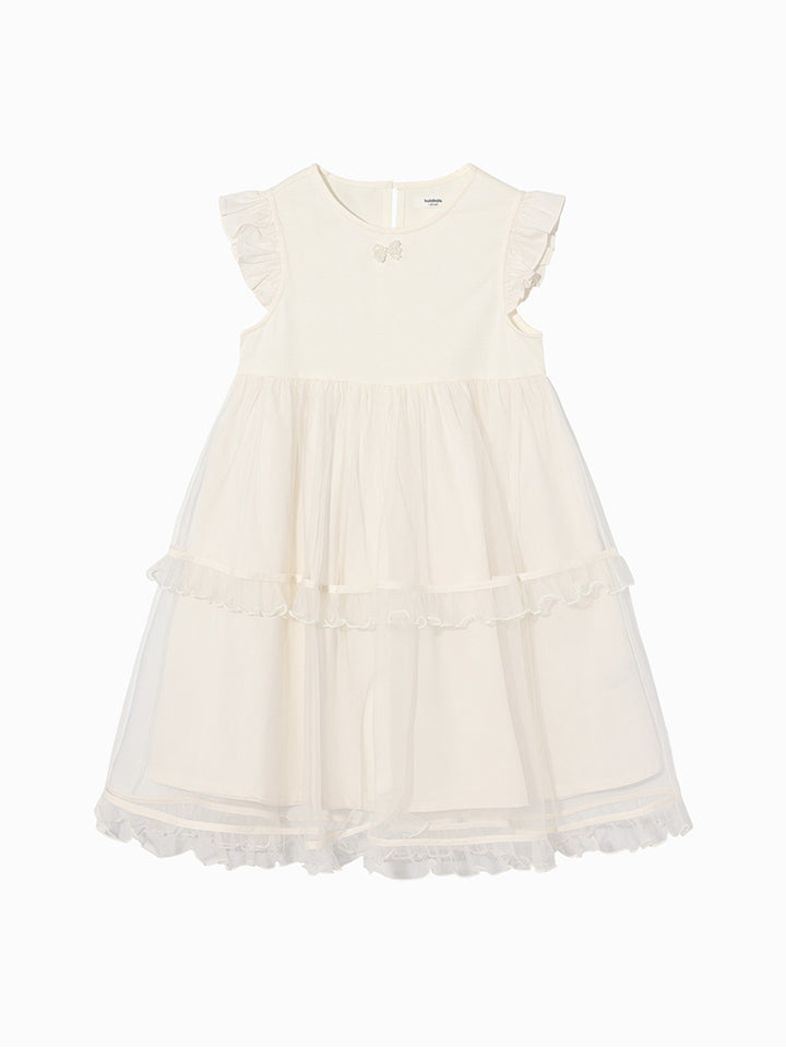 sleeveless dress in a solid mono colored pattern, decorated with layered ruffles on lower side, comes with back button for closure and a rounded neckline