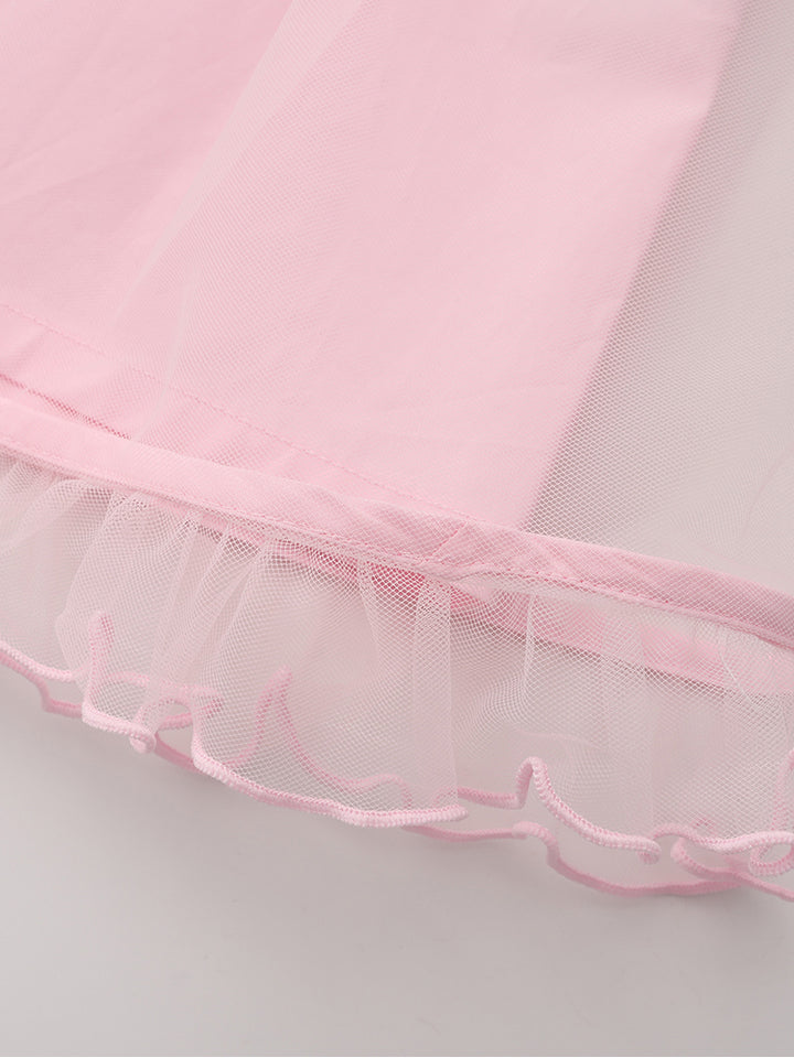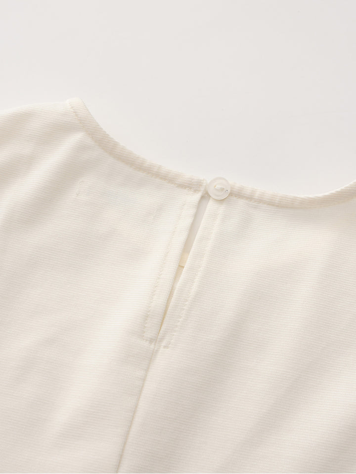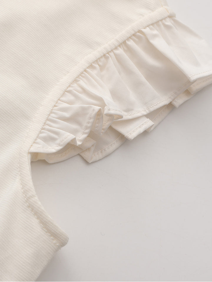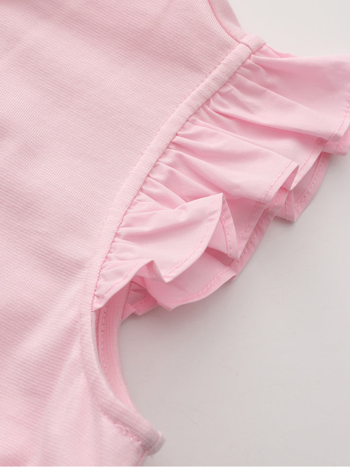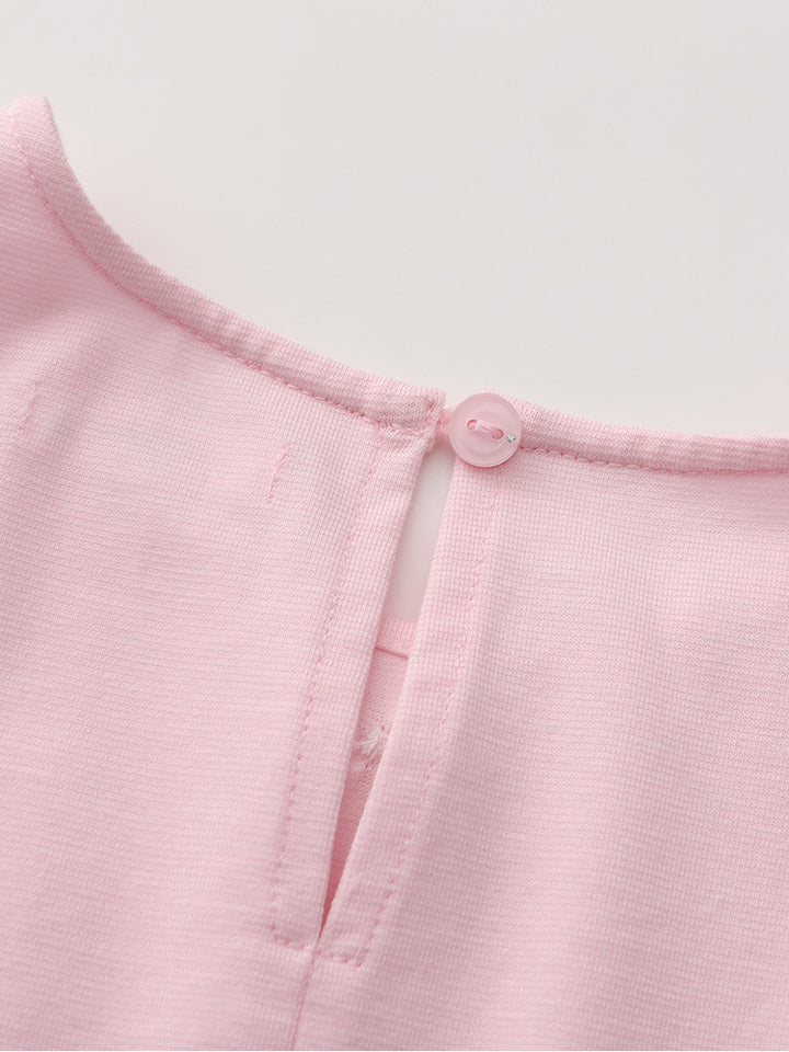 sleeveless dress in a solid mono colored pattern, decorated with layered ruffles on lower side, comes with back button for closure and a rounded neckline