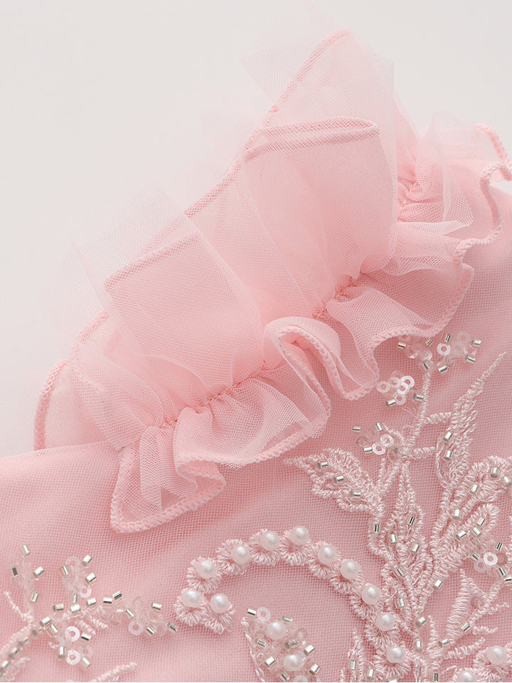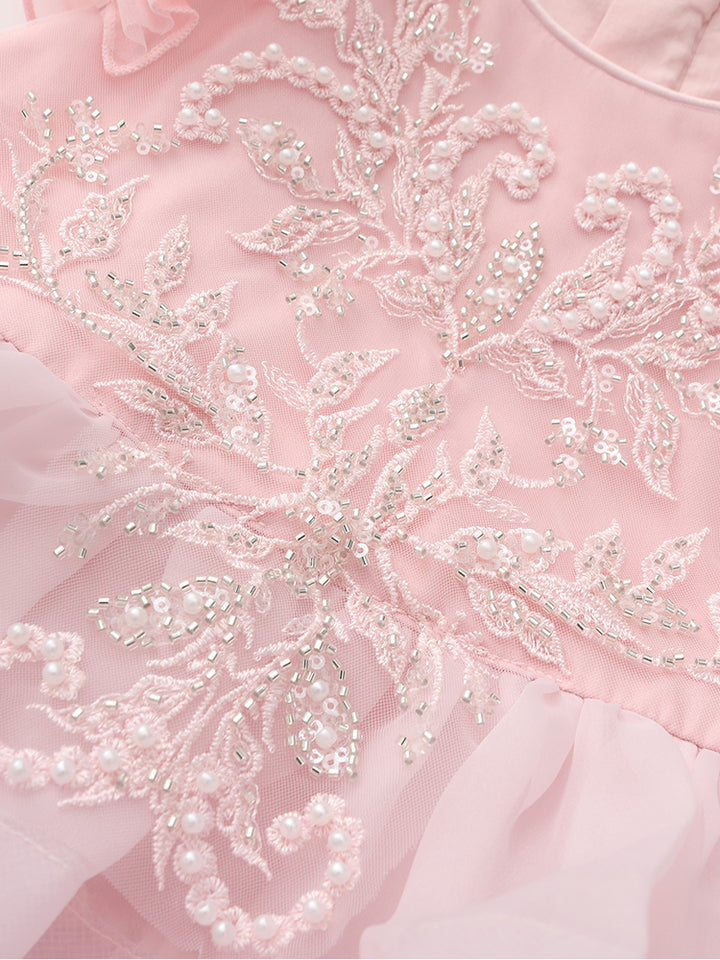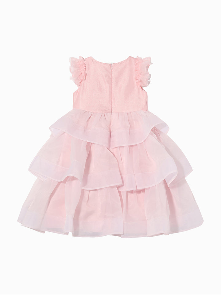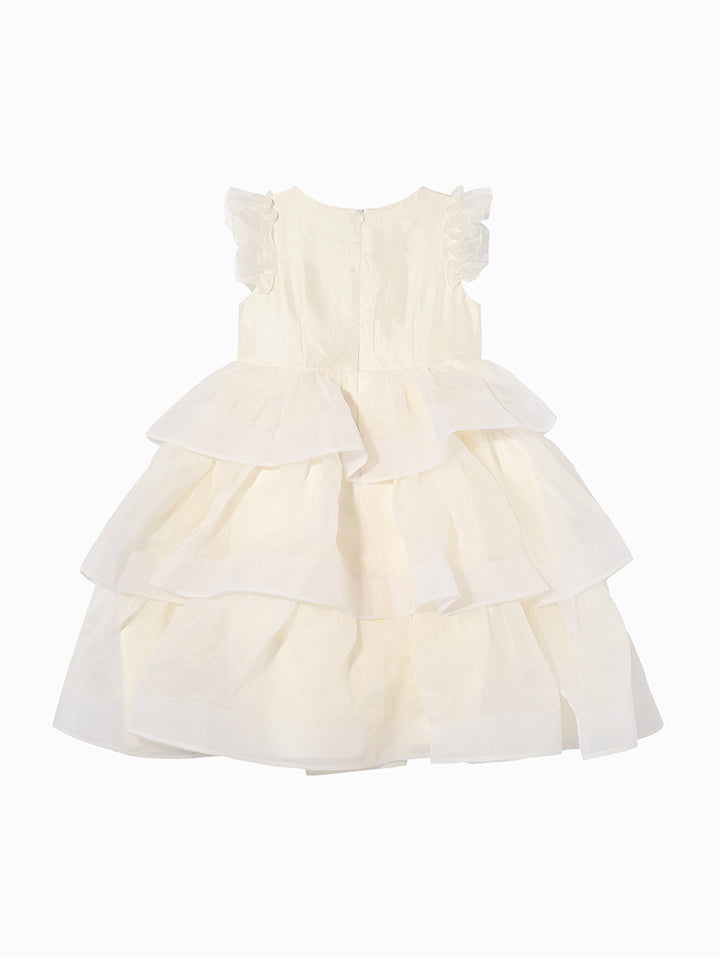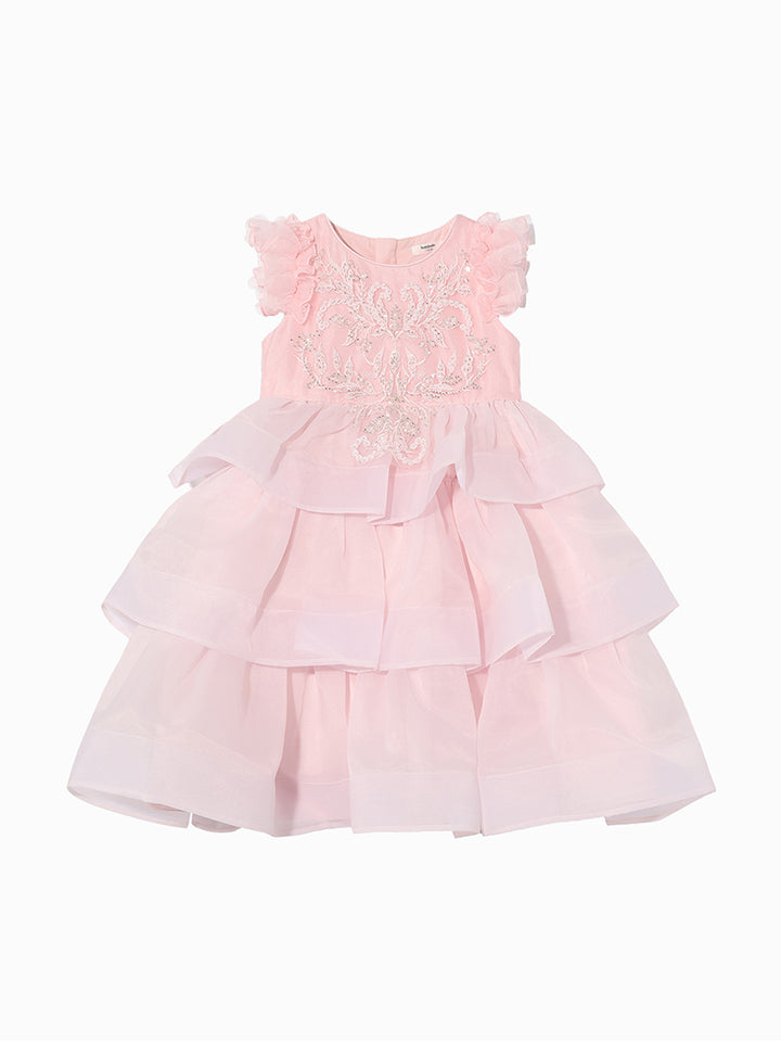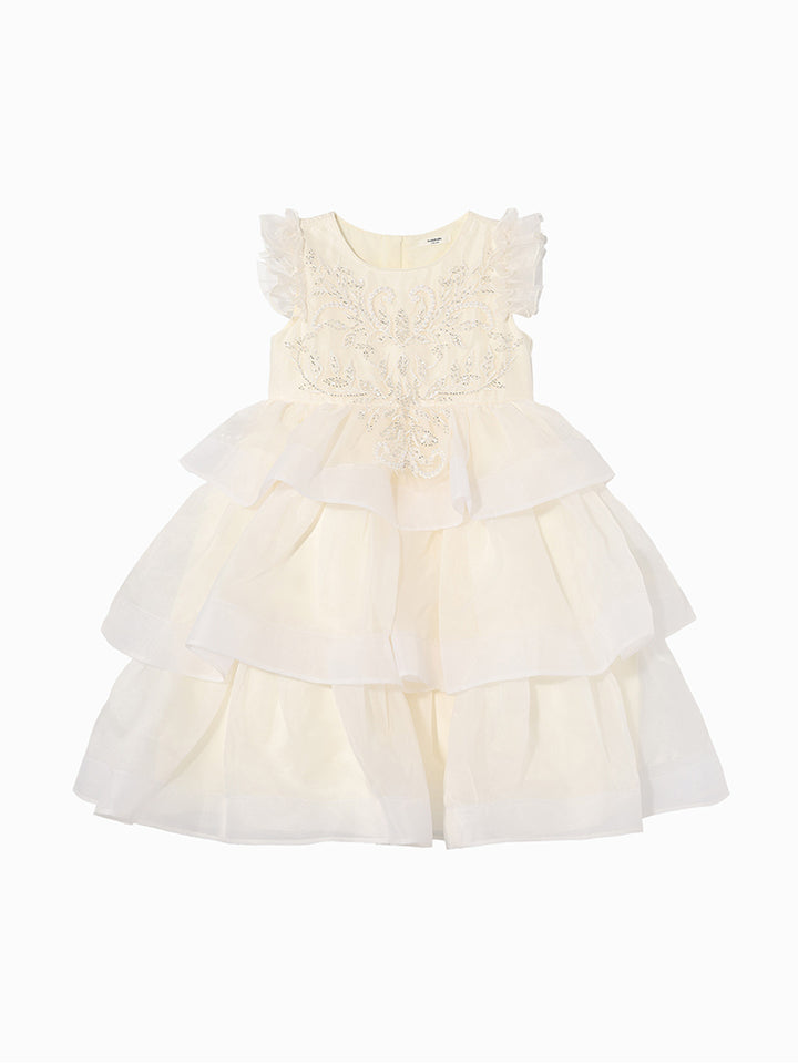 sleeveless dress with in a solid mono colored pattern, decorated with layered ruffles and embroidery details, comes with back zipper for closure and a rounded neckline