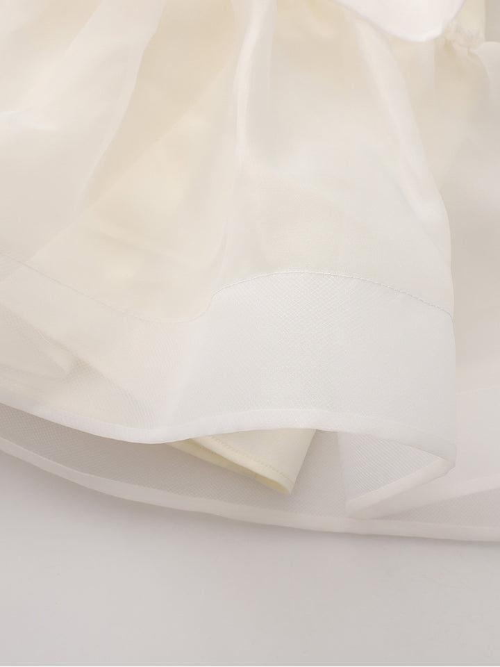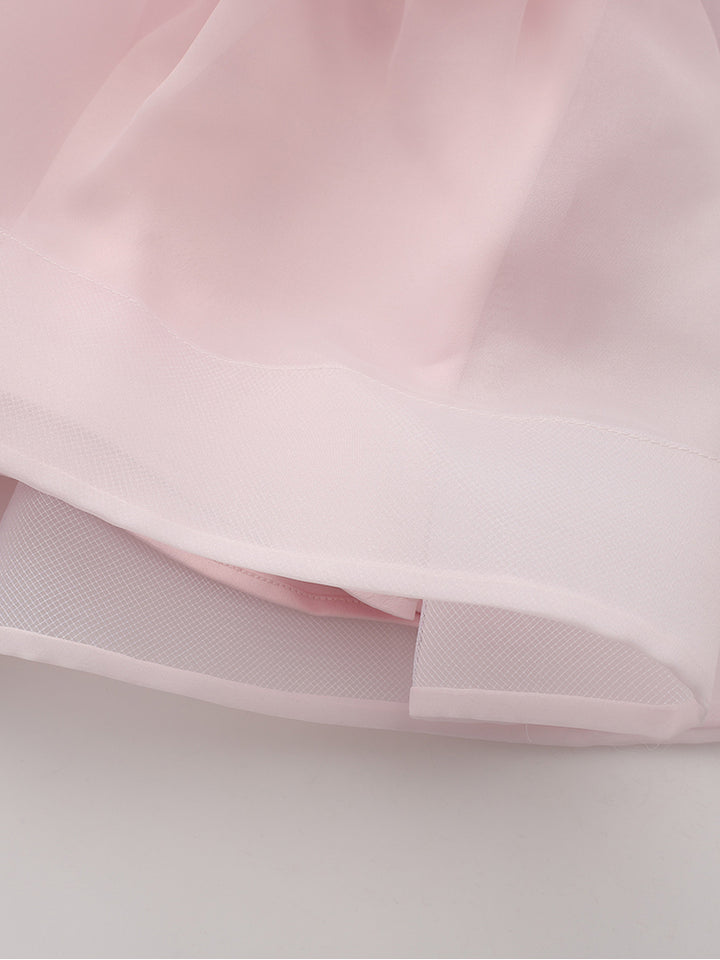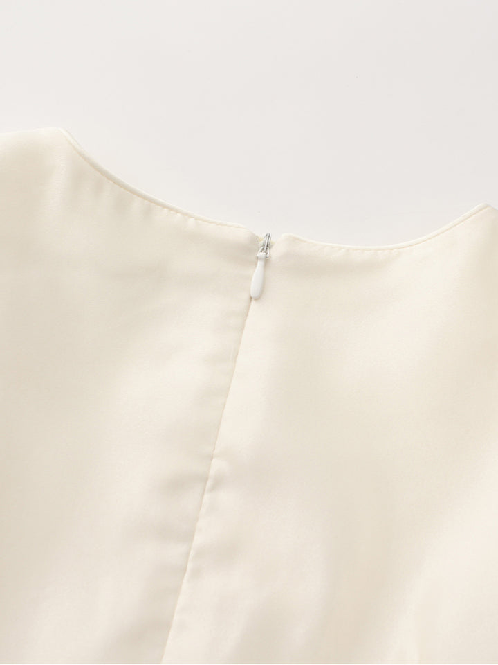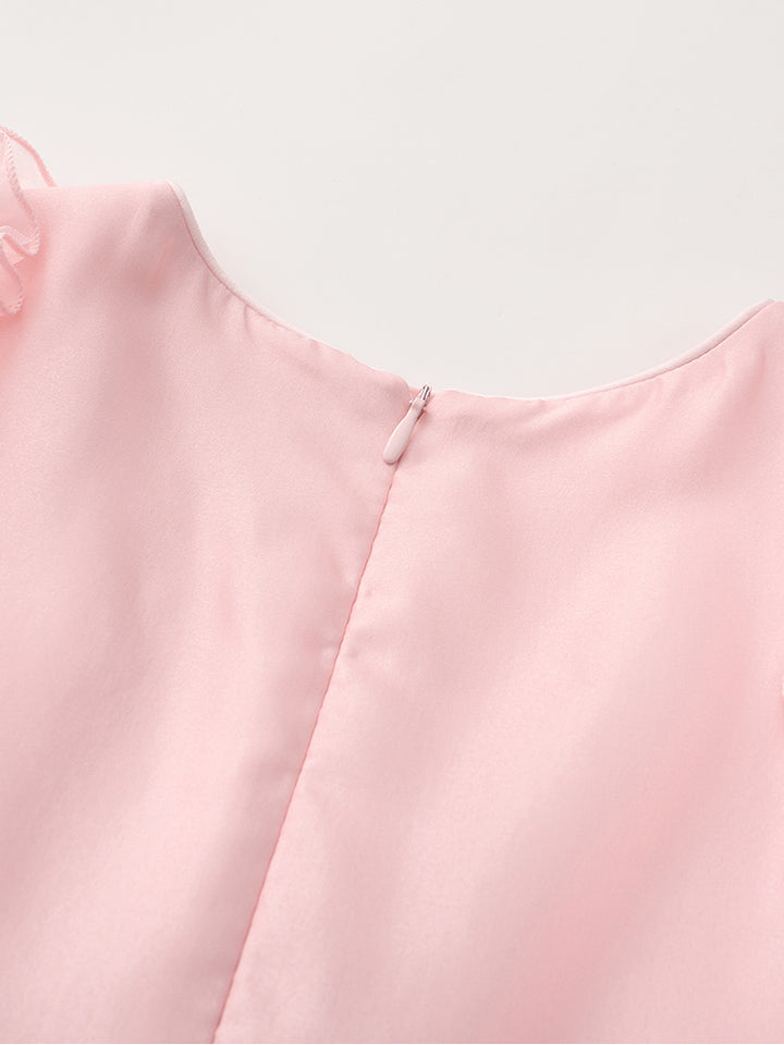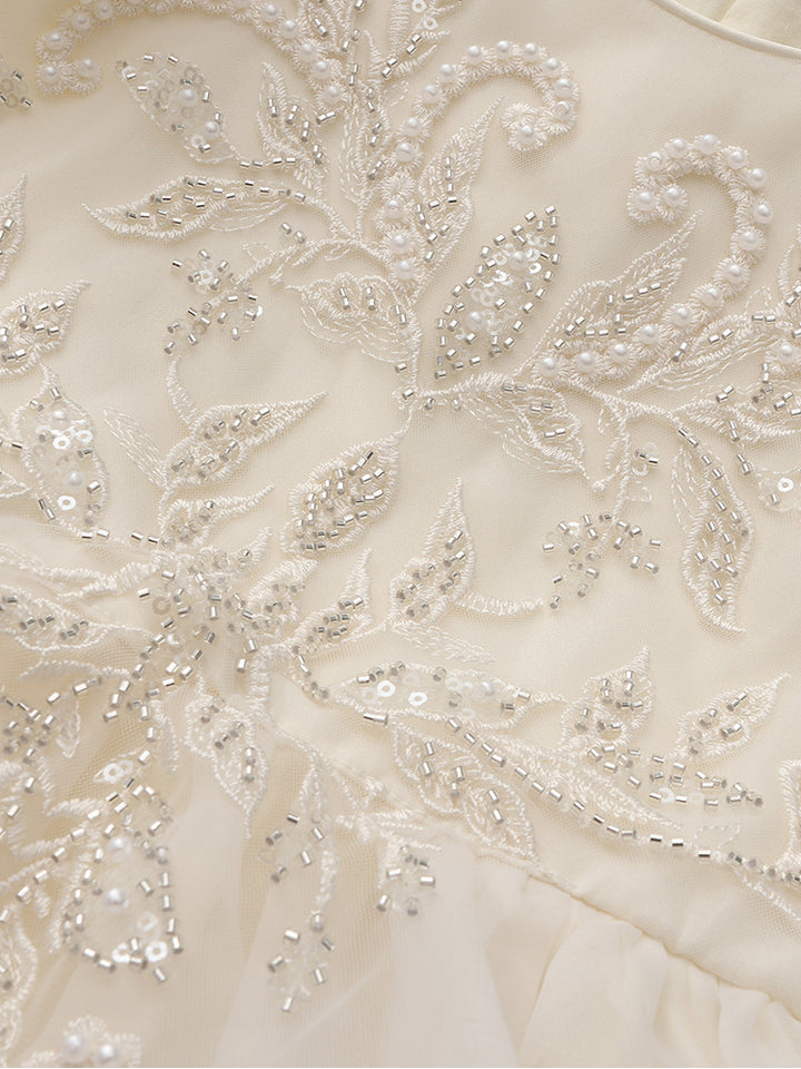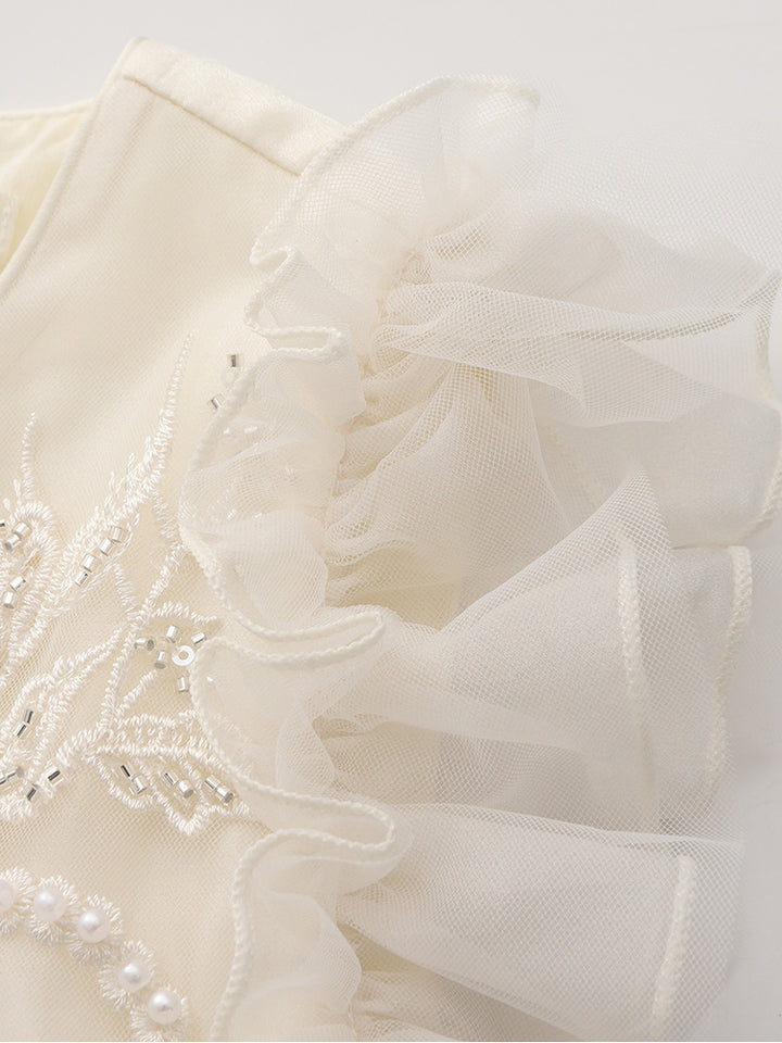 sleeveless dress with in a solid mono colored pattern, decorated with layered ruffles and embroidery details, comes with back zipper for closure and a rounded neckline