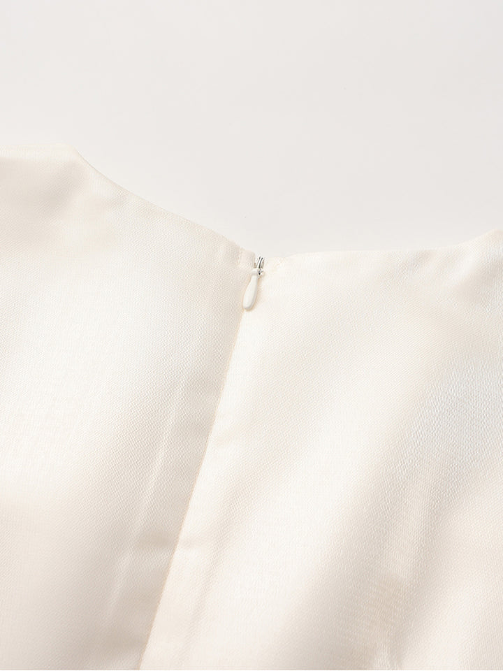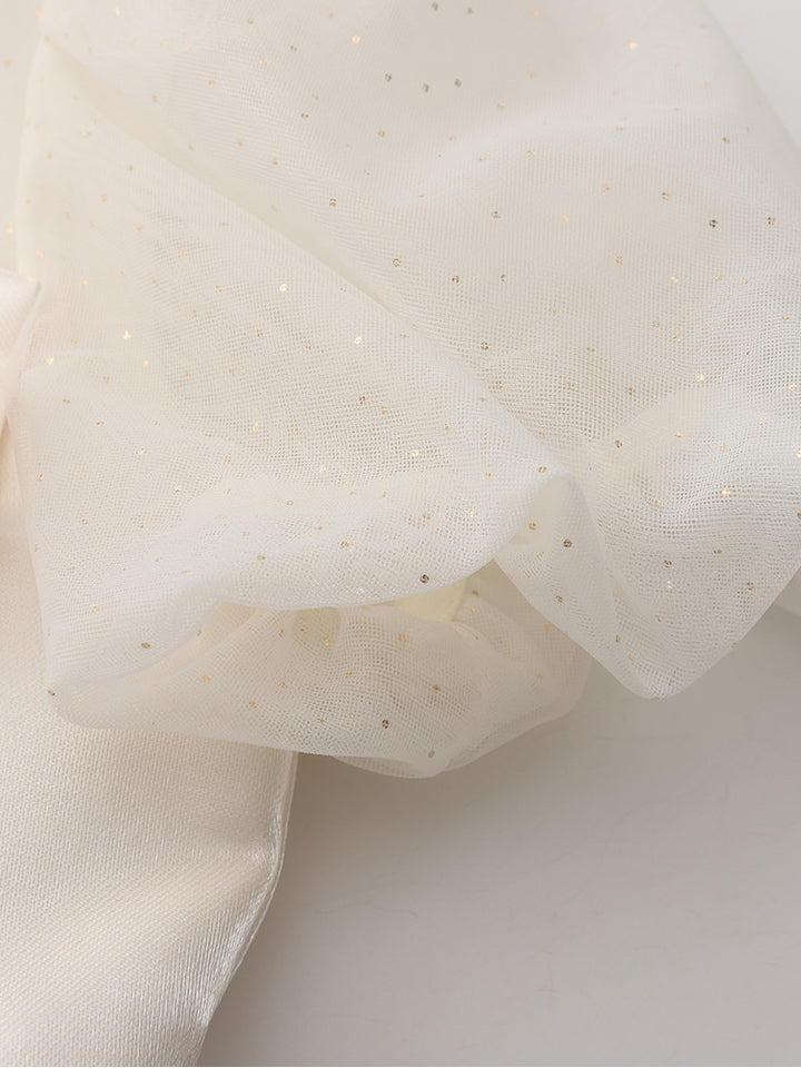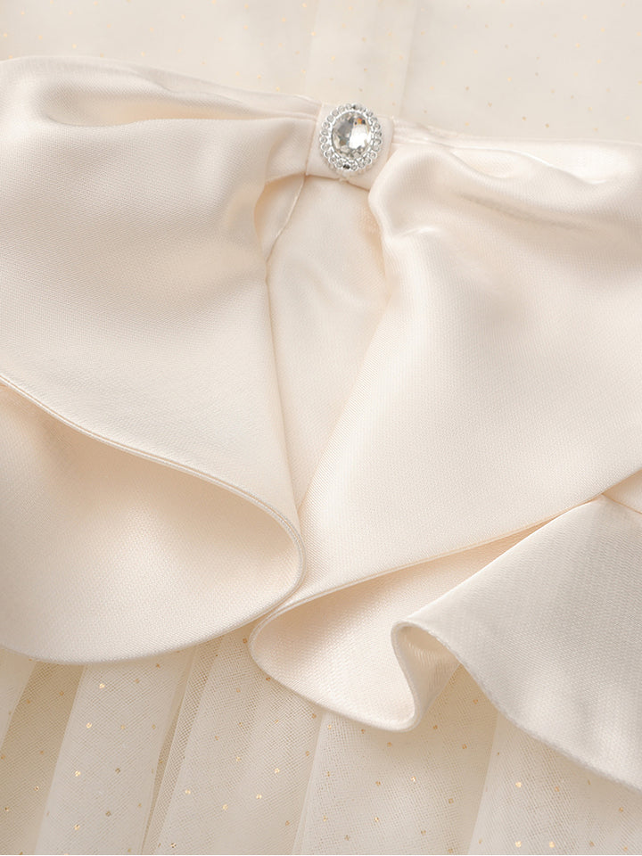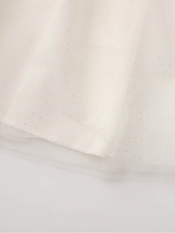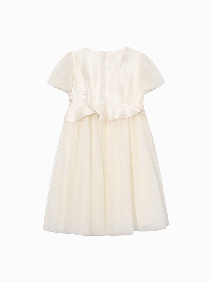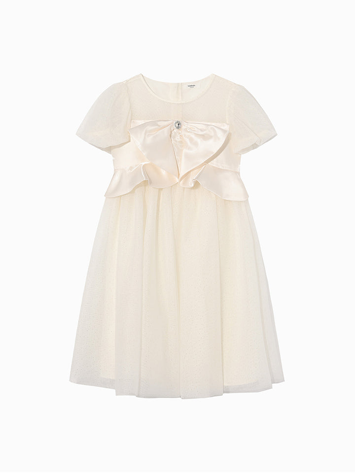short sleeves dress in a tulle fabric, decorated with spots printed details and bow, comes with back zipper for closure and a rounded neckline