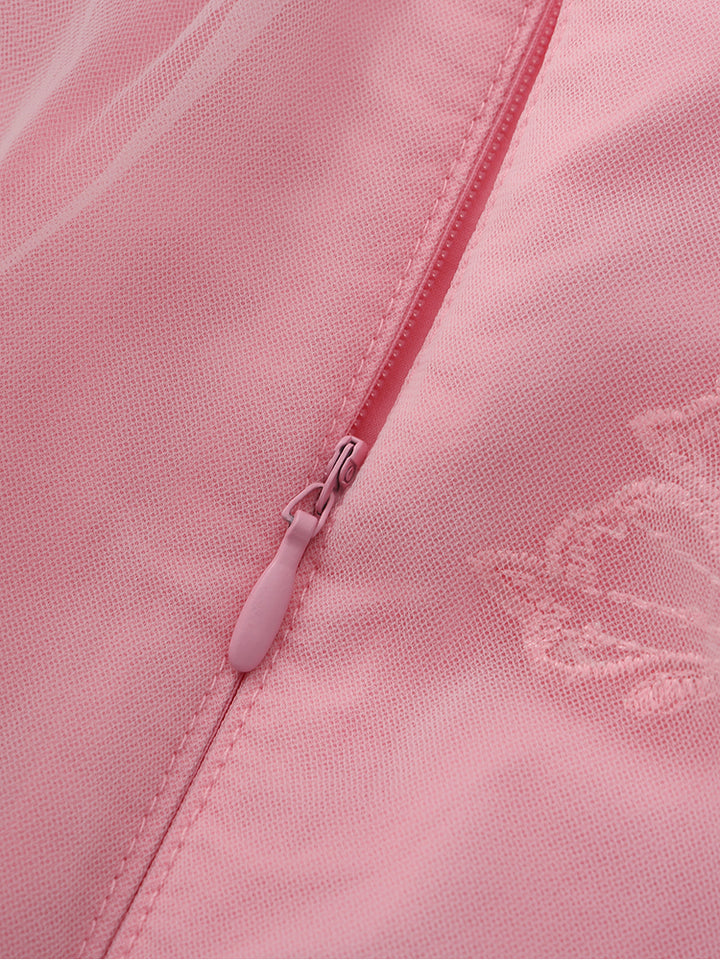 short sleeves dress in a tulle fabric, decorated with embroidery pattern, comes with back zipper for closure and a rounded neckline