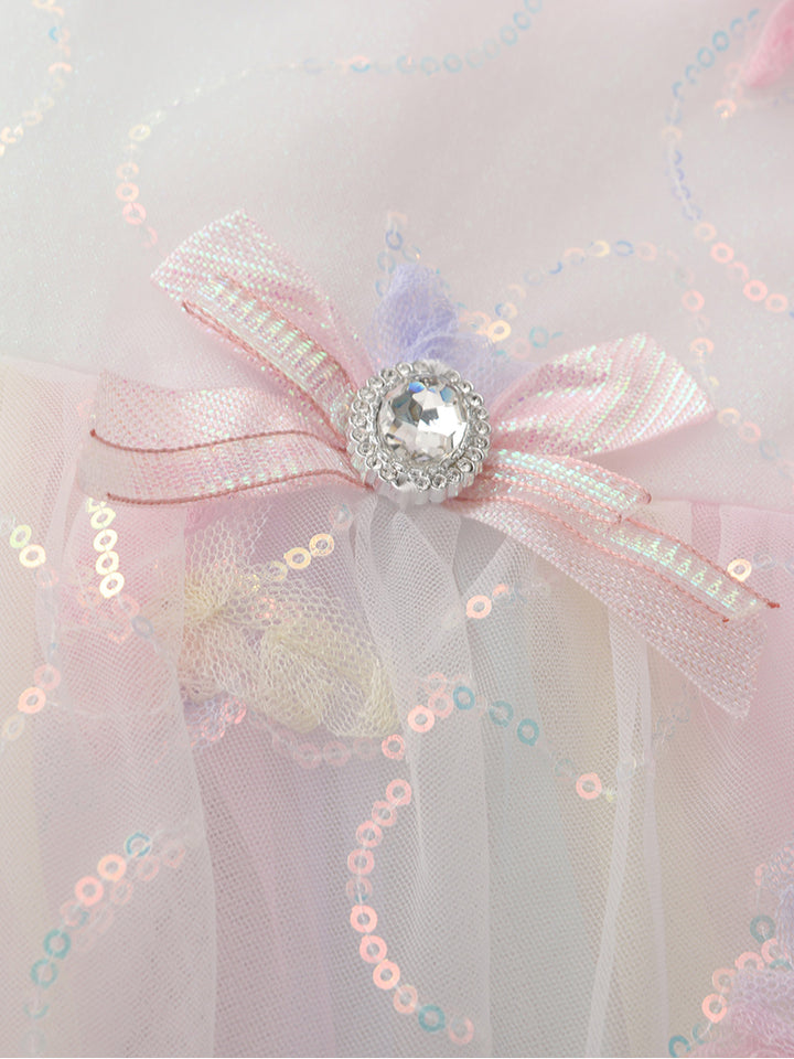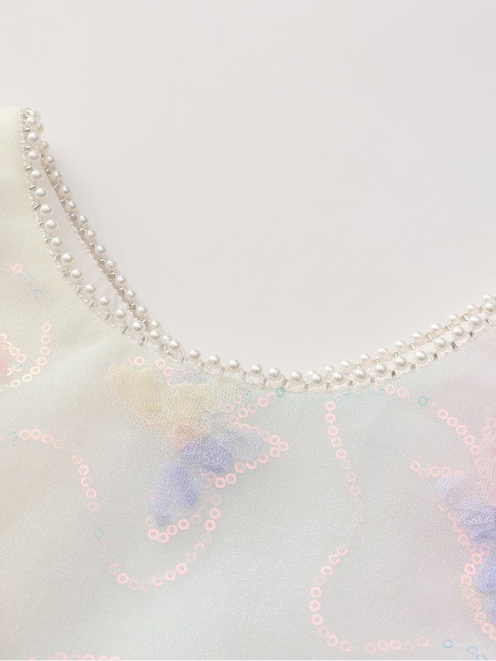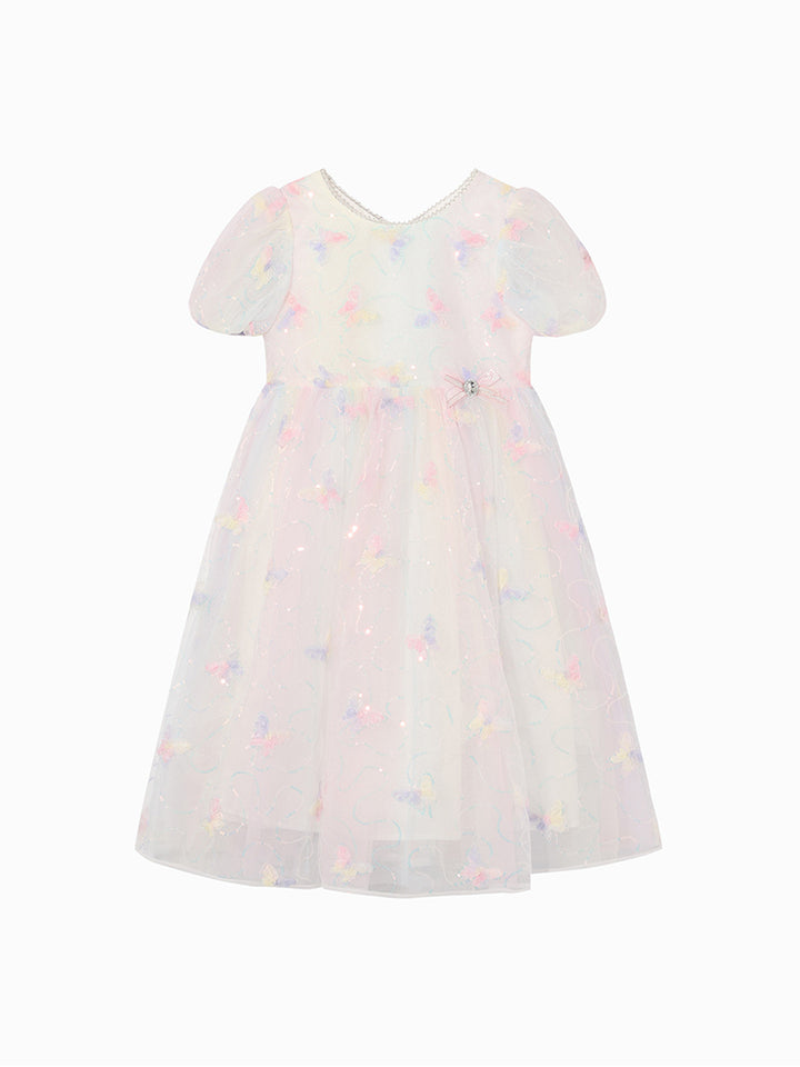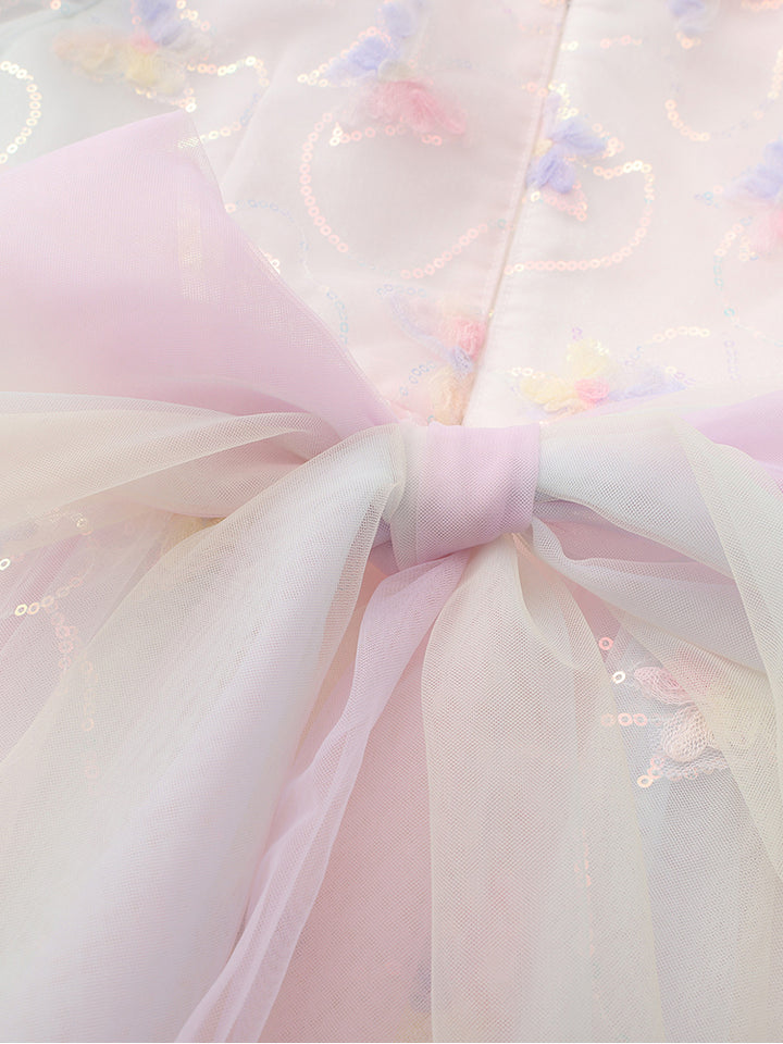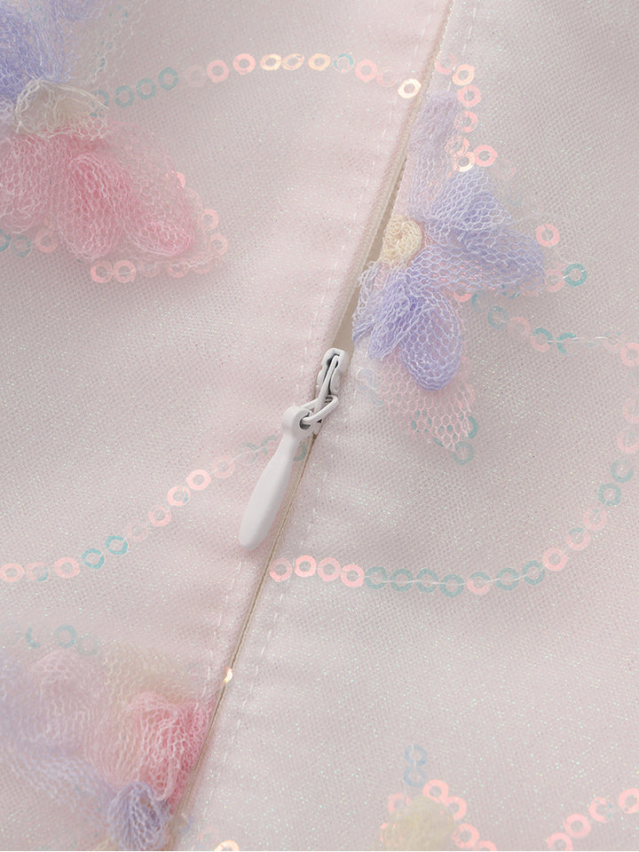 short sleeves dress in a tulle fabric, decorated with colored sequins pattern, comes with waist belt, back zipper for closure and a rounded neckline