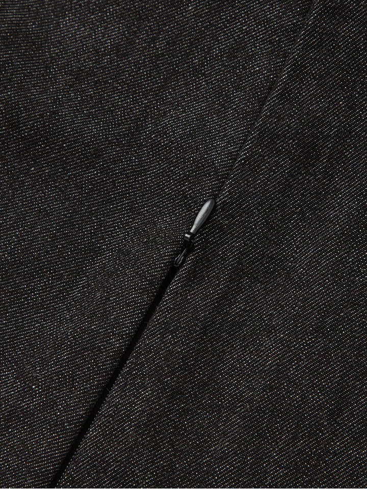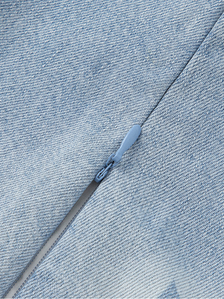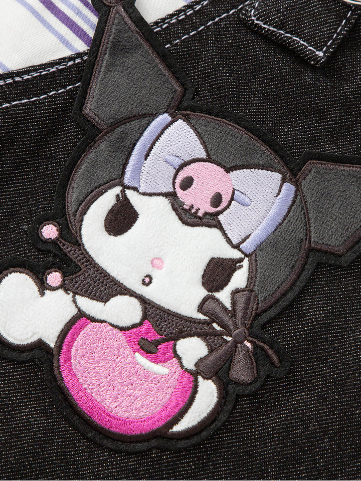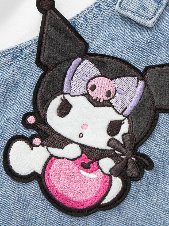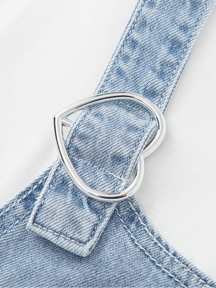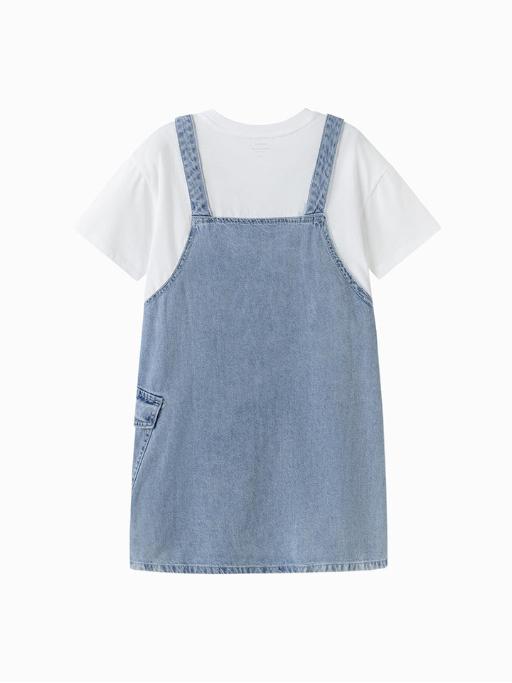 short sleeves denim dress with contrast pattern and fabric as on upper side with a striped t-shirt pattern and on lower side a denim dress with shoulder straps decorated with prints on the front side, comes with side pocket and a rounded shape neckline