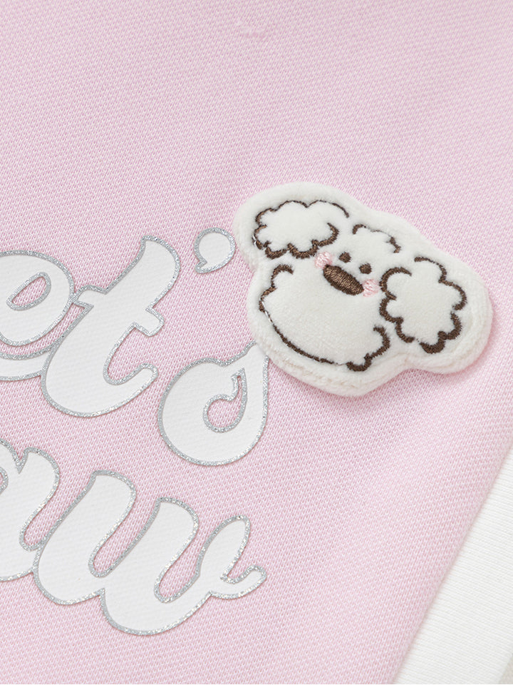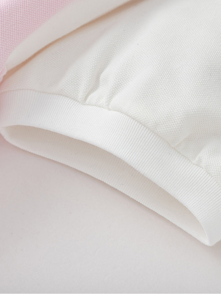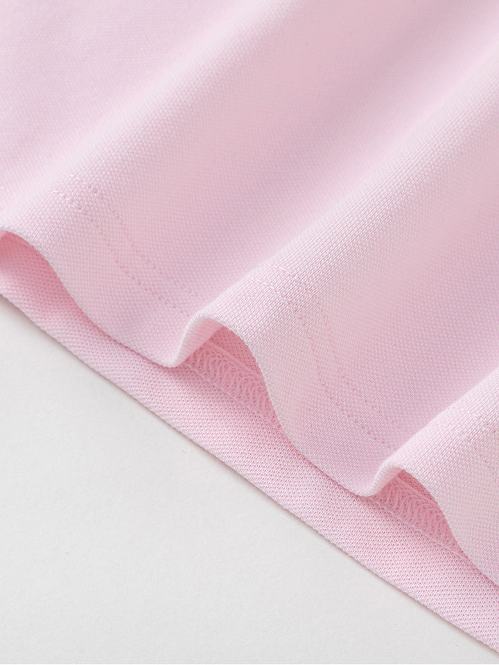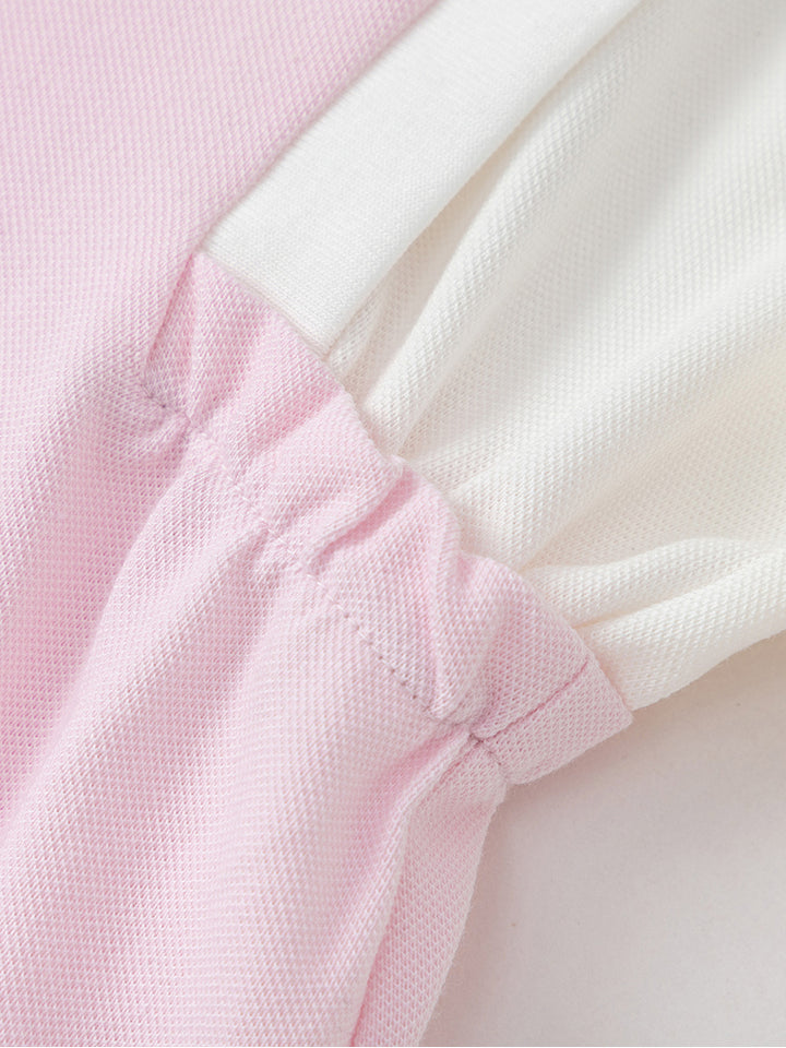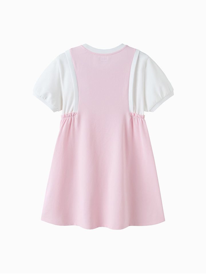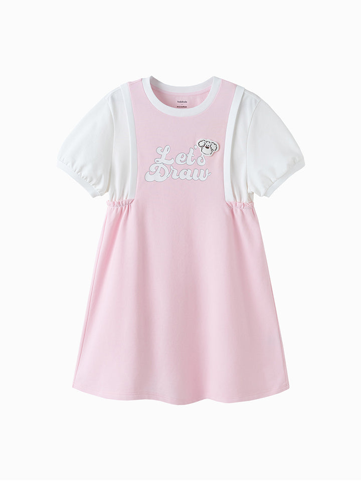 short sleeves flowy dress, decorated with a contrast colored pattern and a print on the front side, comes with a rounded shape neckline