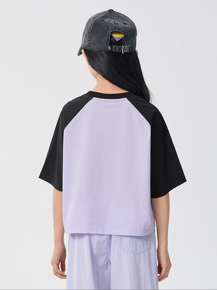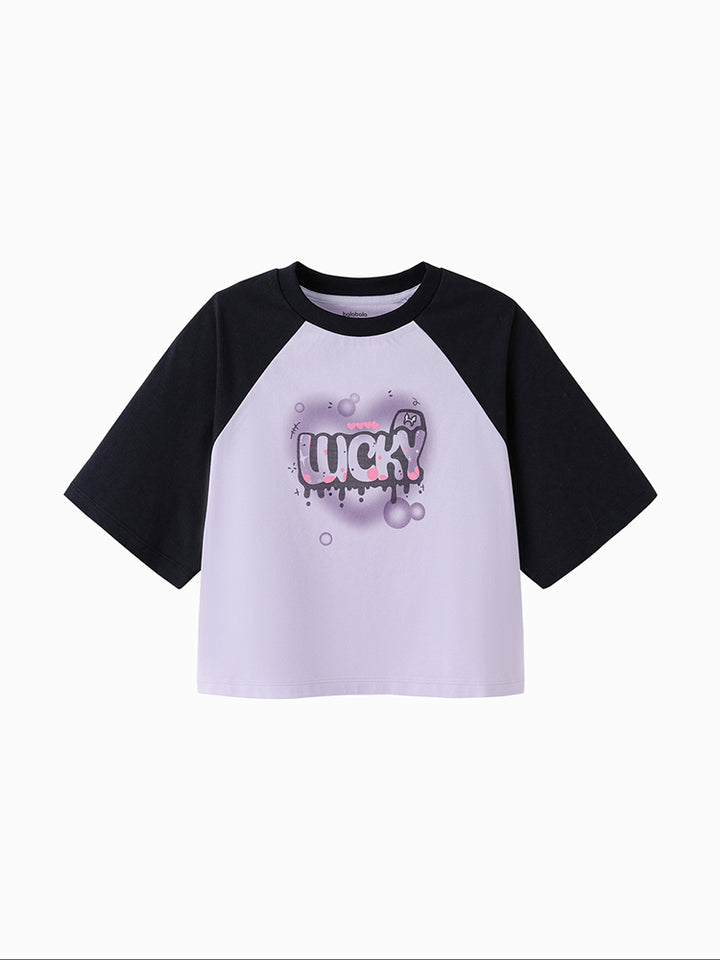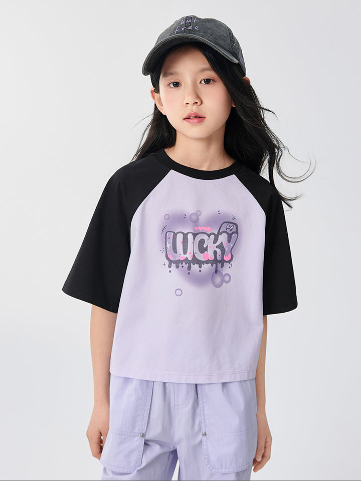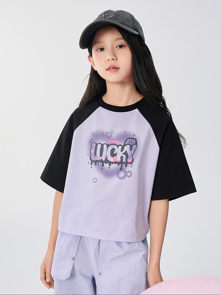 A stylish kids t-shirt with short sleeves and contrast color sleeves. Features a bold front print and a comfortable round neck, perfect for everyday wear