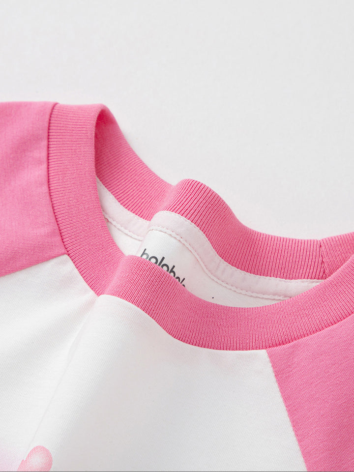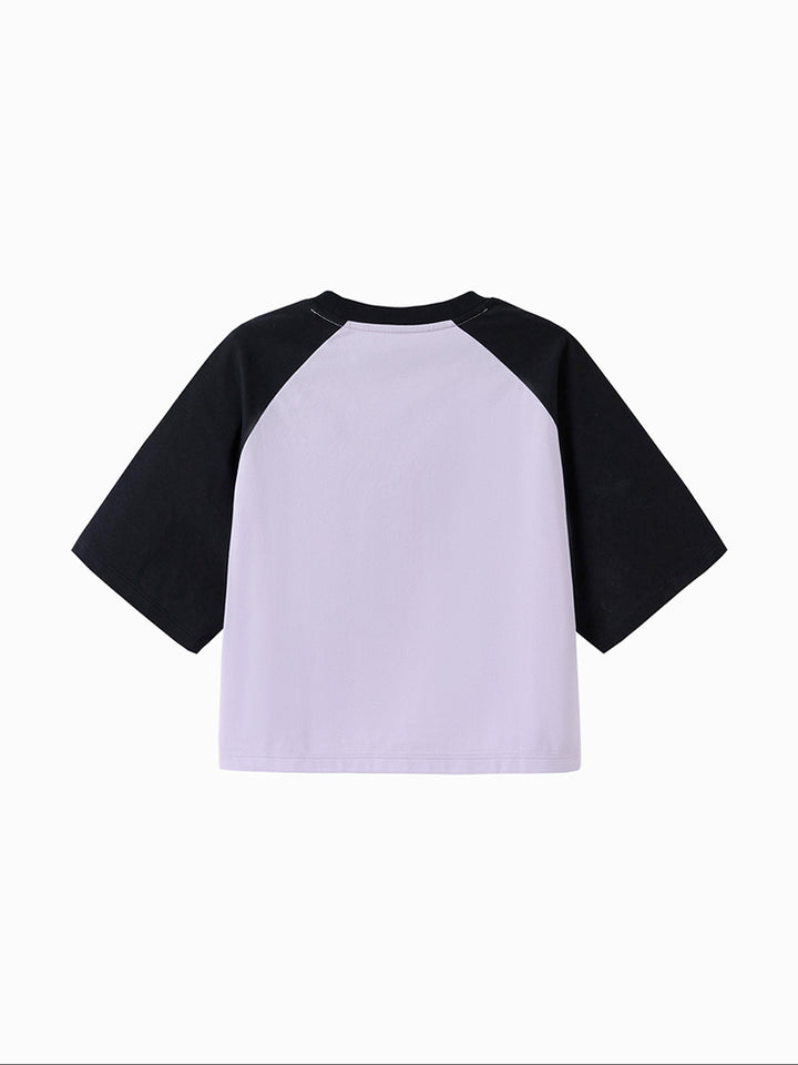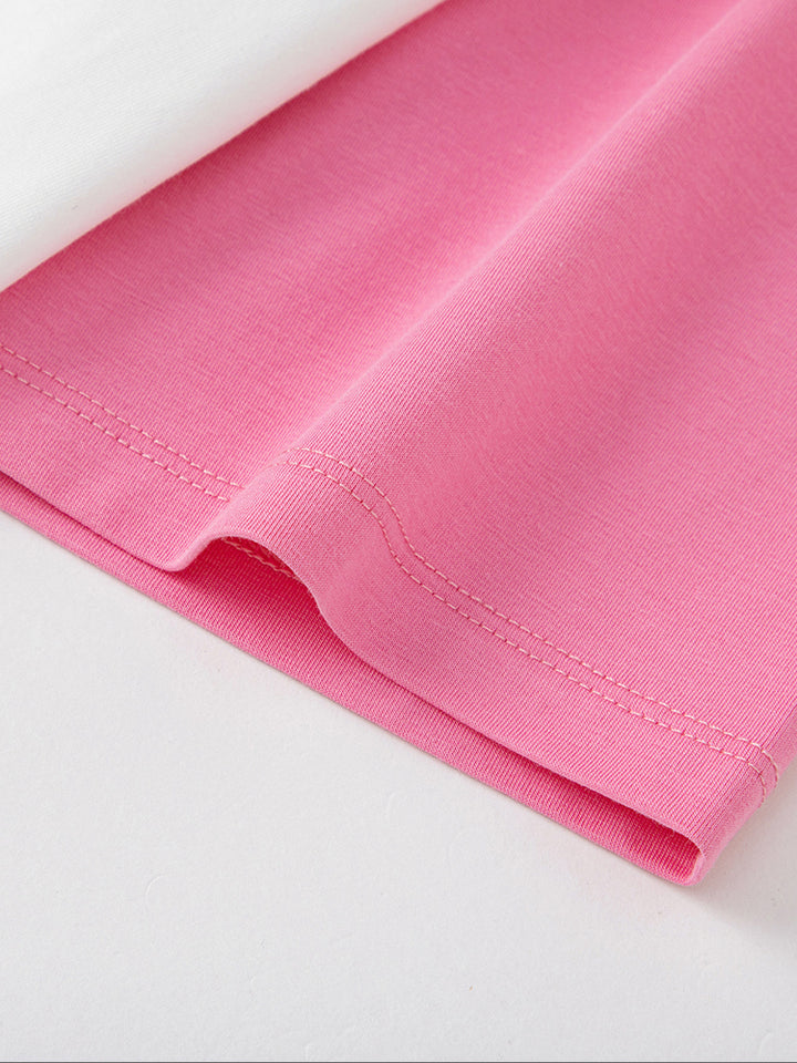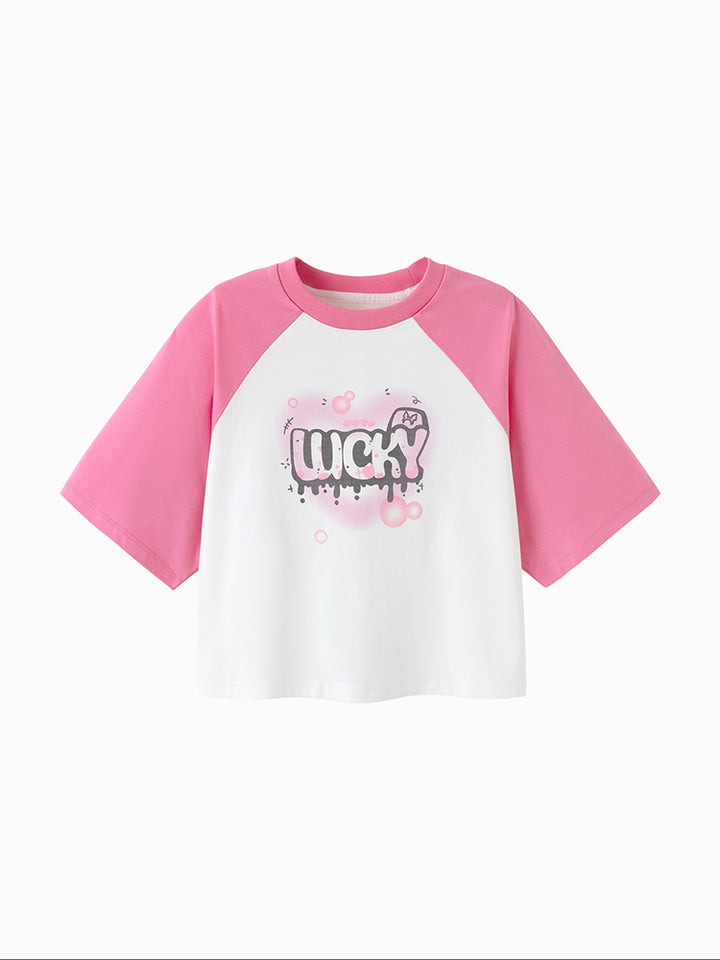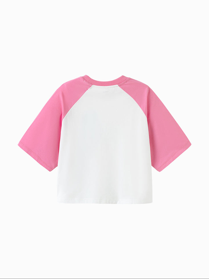 A stylish kids t-shirt with short sleeves and contrast color sleeves. Features a bold front print and a comfortable round neck, perfect for everyday wear