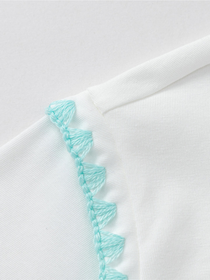 This short sleeve t-shirt adds a charming touch with delicate embroidery on the front and sleeves. Designed with a classic crew neck, its perfect for everyday comfort with a stylish twist.