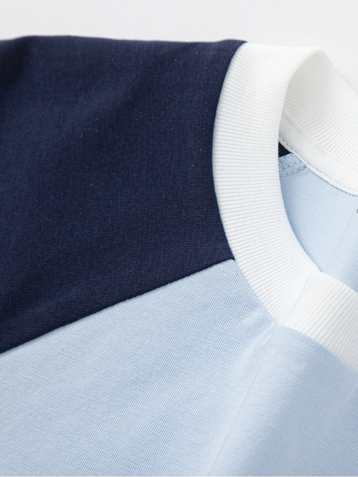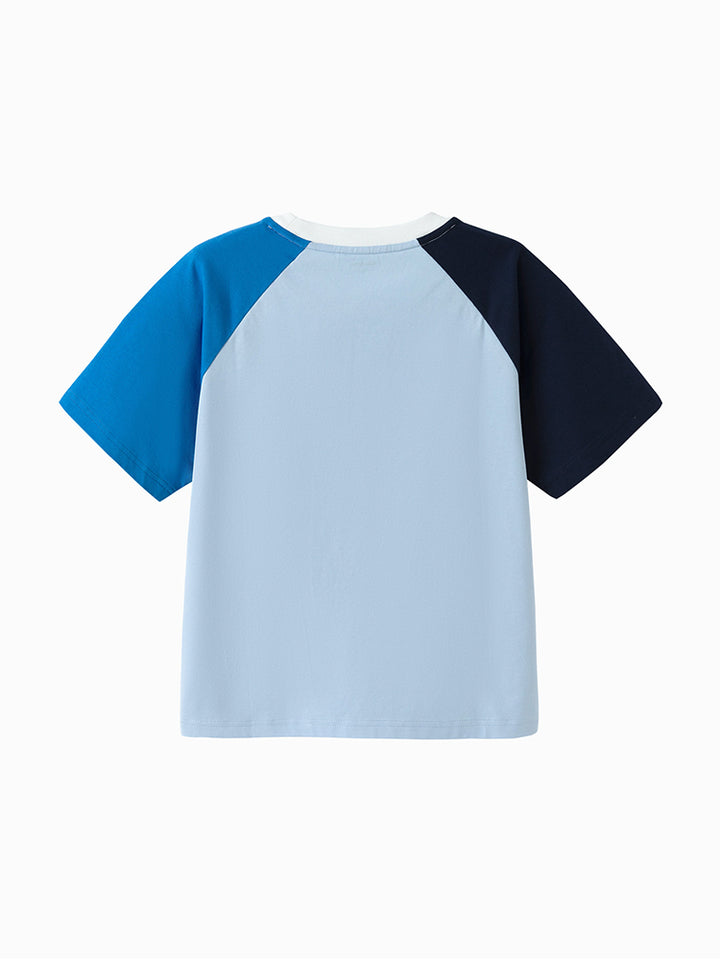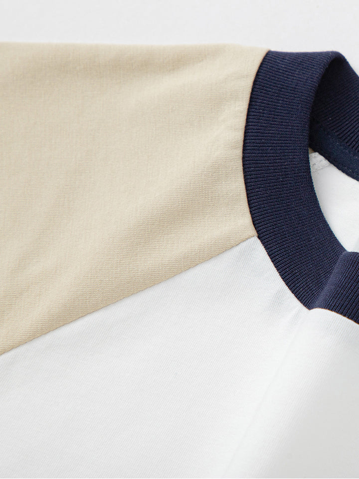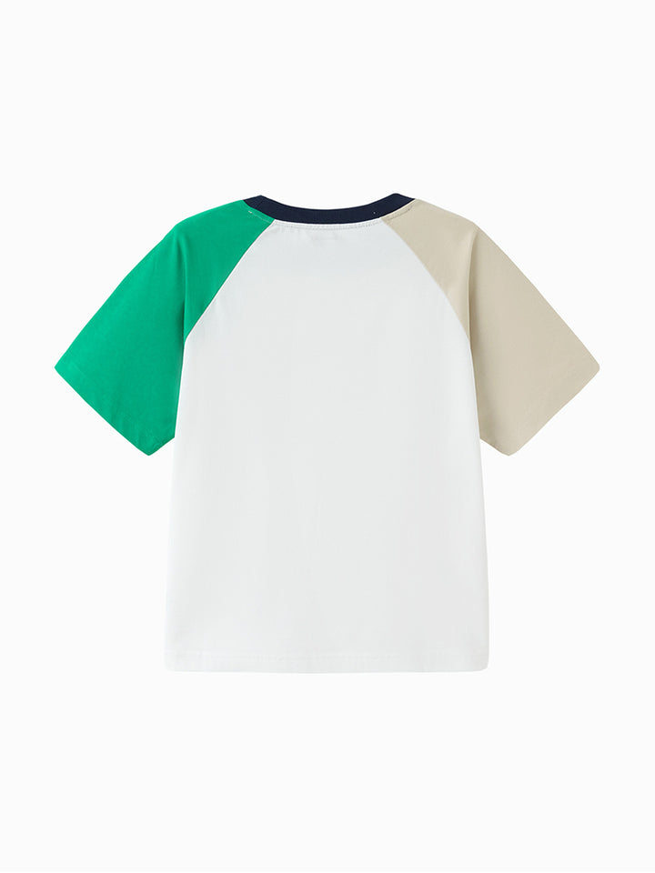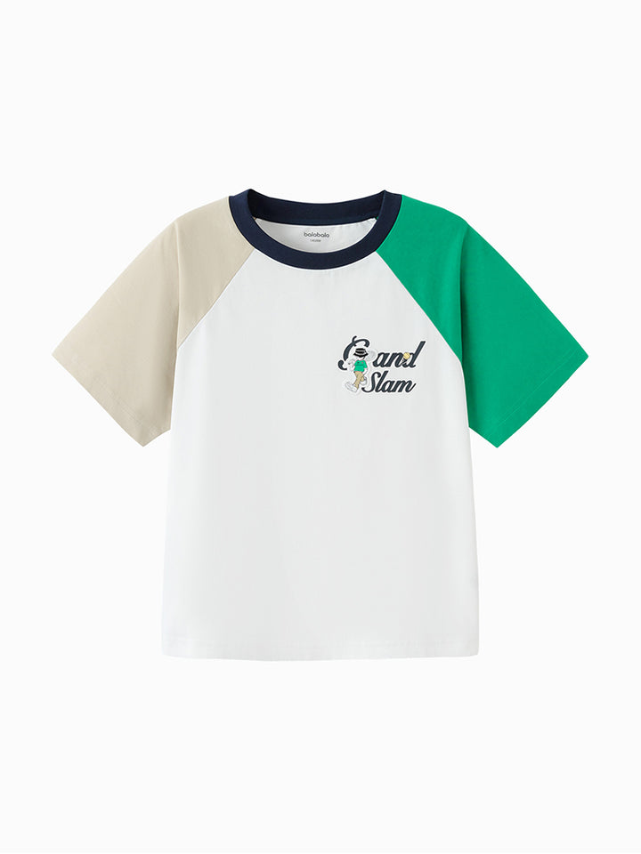 short sleeves casual t-shirt with contrast colored sleeves, decorated with a print on the front side, and comes with a rounded shape neckline