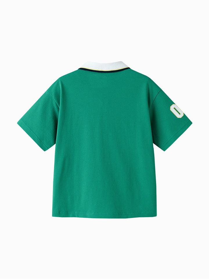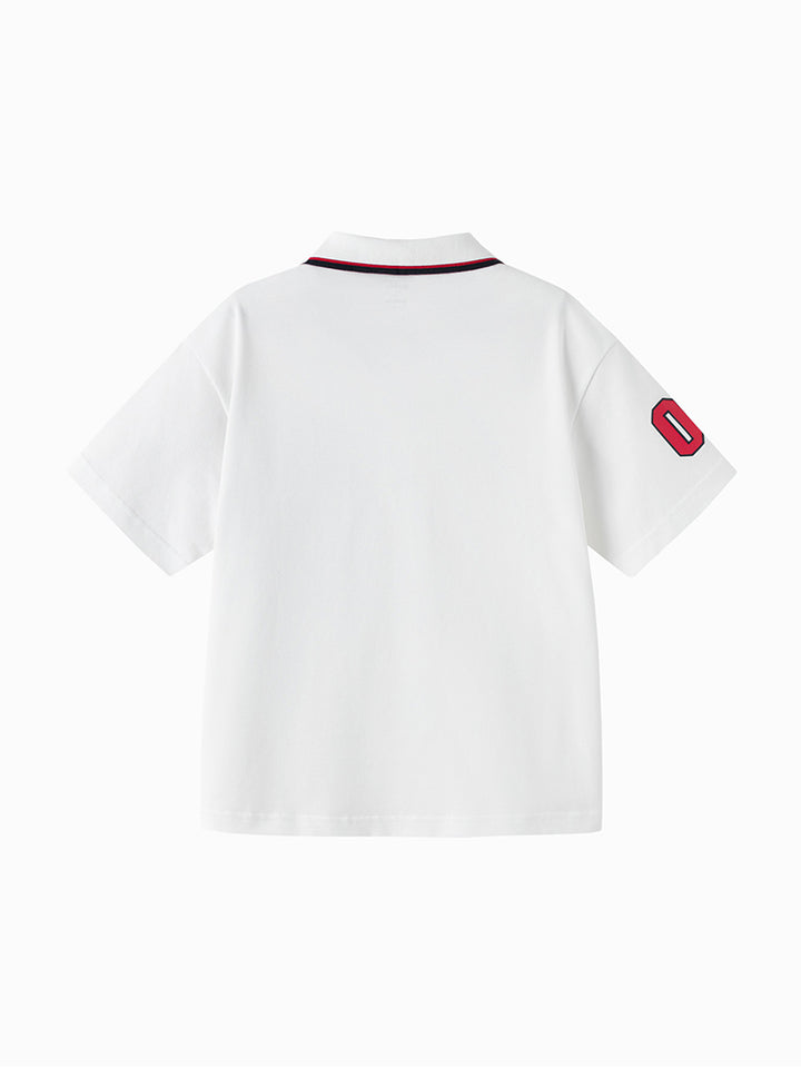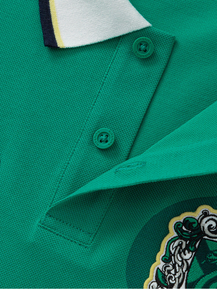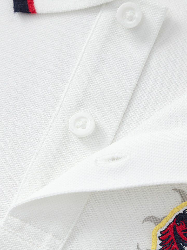 short sleeves casual polo t-shirt, decorated with embroidery patches on the front side and on one sleeve, comes with front buttons and a classic regular collar