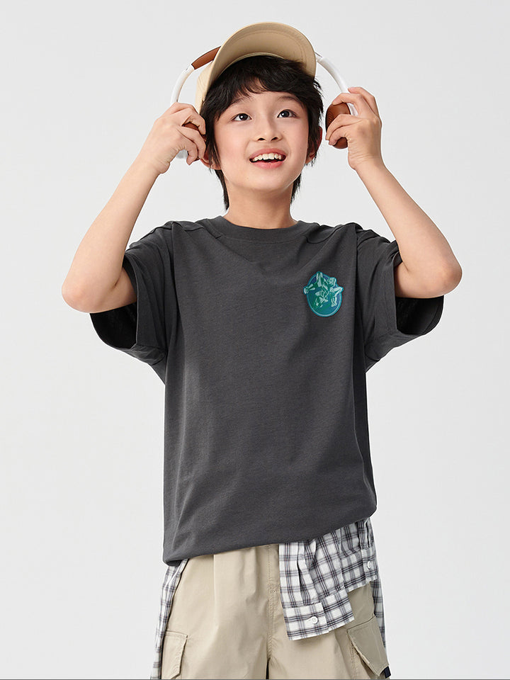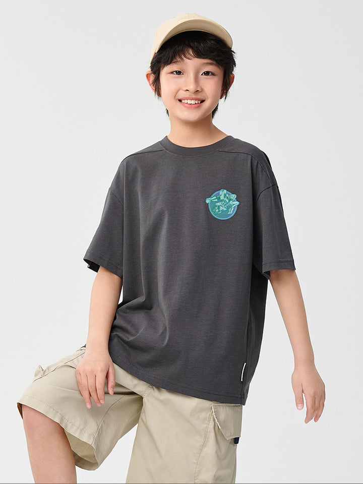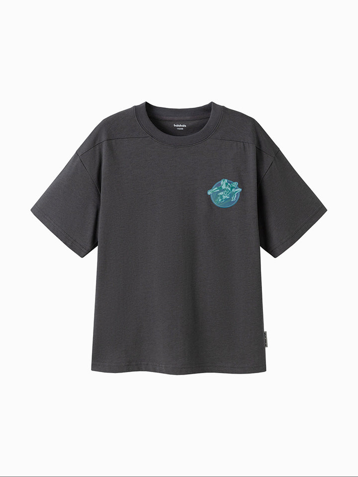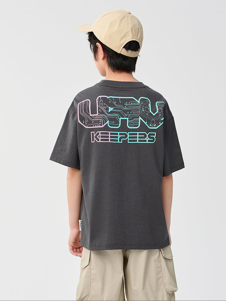 A stylish kids t-shirt with short sleeves and eye-catching prints on the front and back. Featuring a comfortable round neck, its perfect for casual wear and adds a fun touch to any outfit