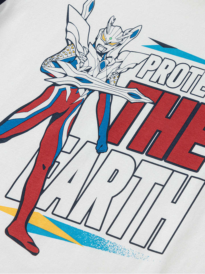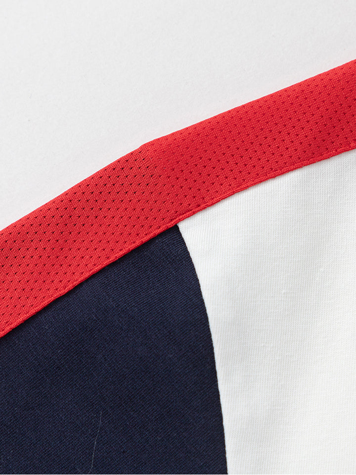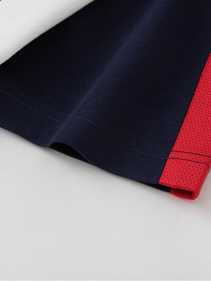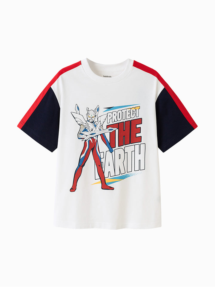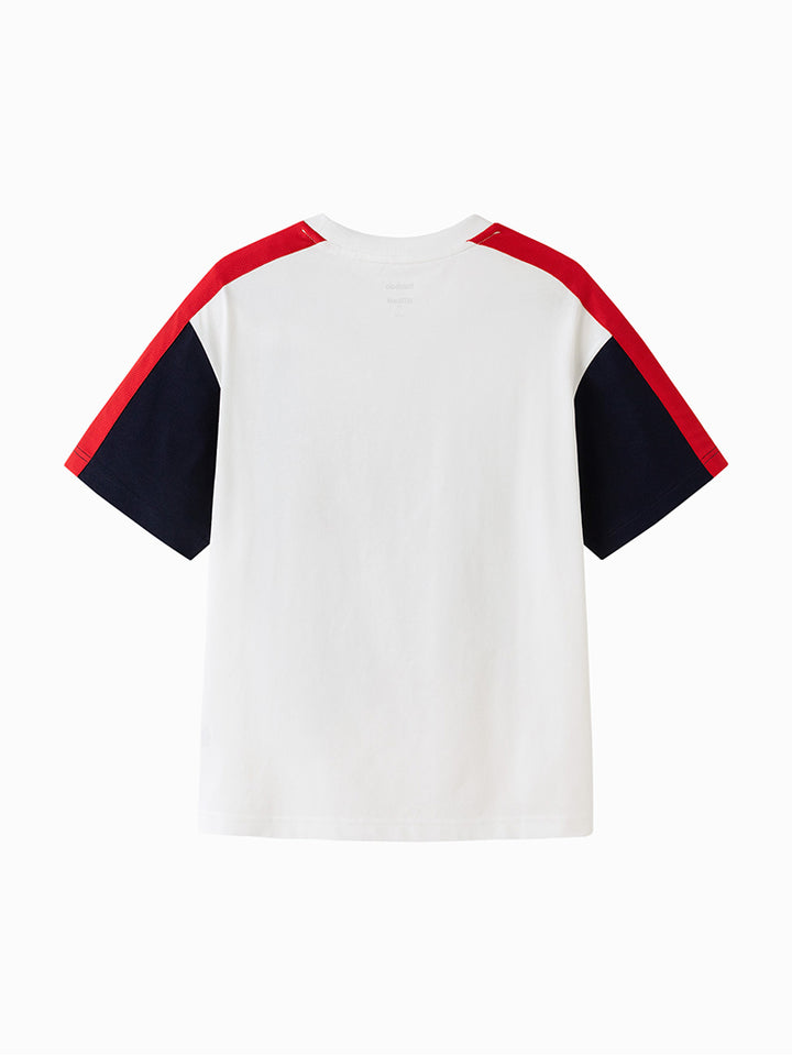 short sleeves casual t-shirt with contrast colored sleeves, decorated with a print on the front side, and comes with a rounded shape neckline
