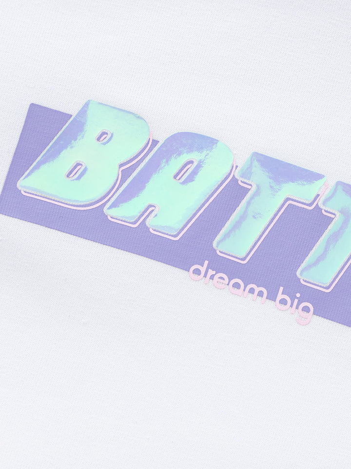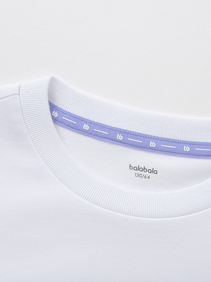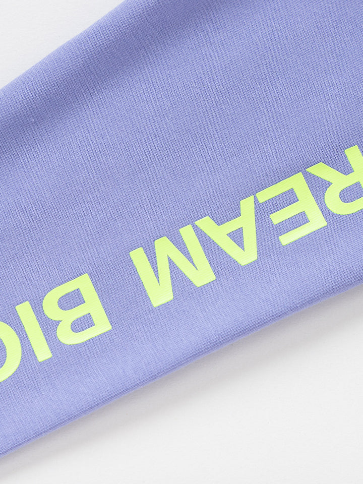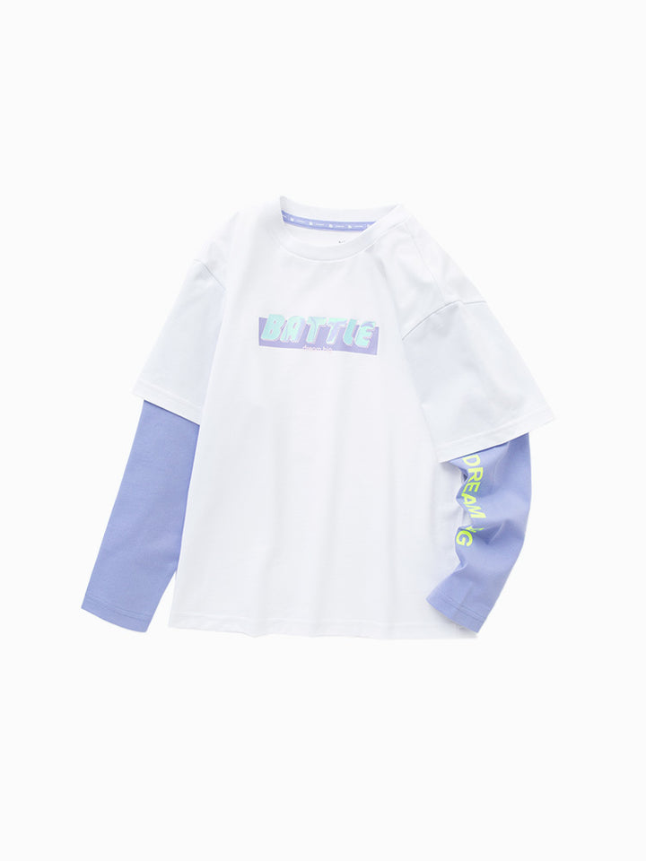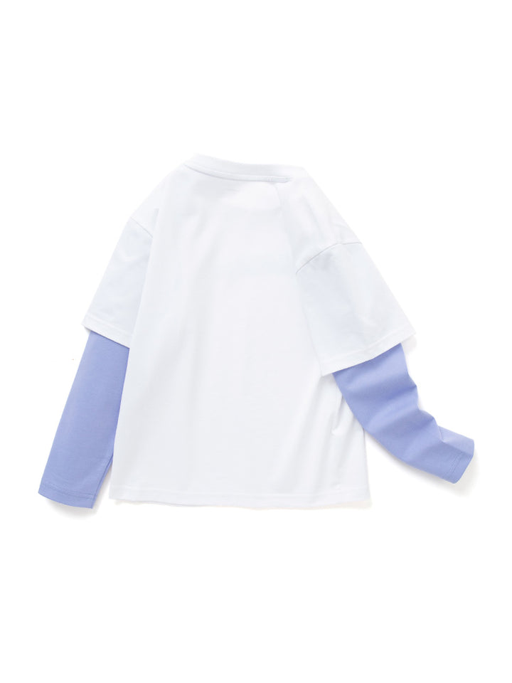 long sleeves girl t-shirt, decorated with a print on the front side and on one sleeve and with contrast colored sleeves, comes with a rounded shape neckline