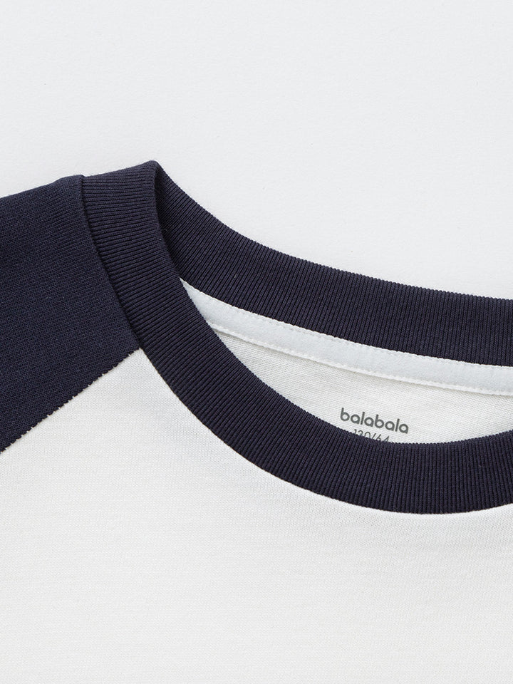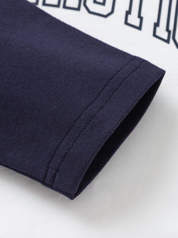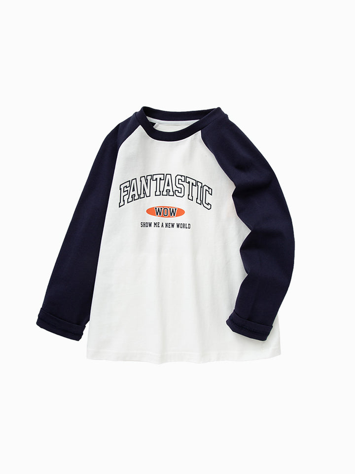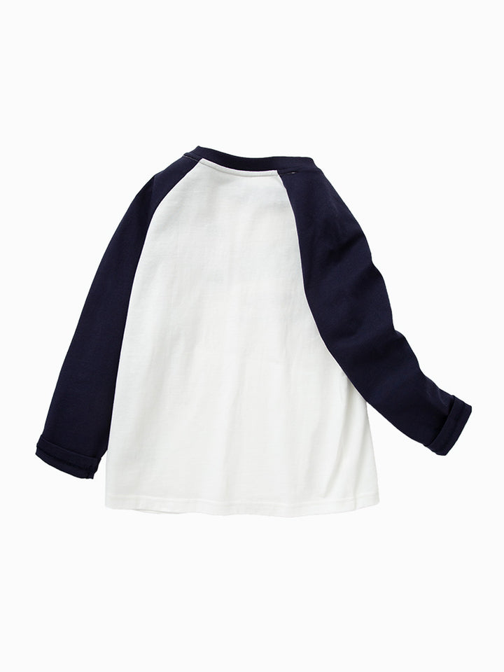 long sleeves boy t-shirt, decorated with a print on the front side and with contrast colored sleeves, comes with a rounded shape neckline