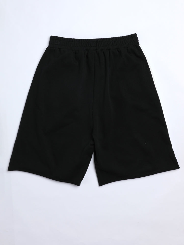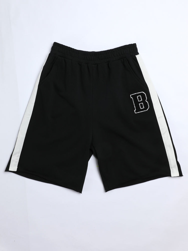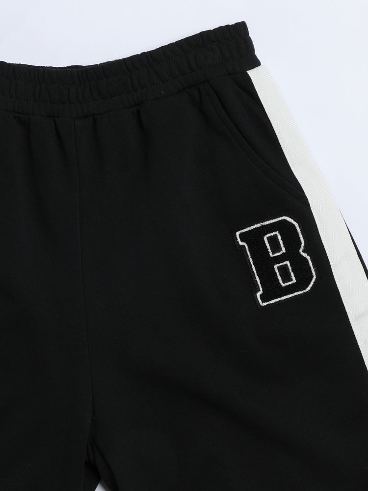 Sporty kids’ shorts designed with an elastic waistband, side stripes, and a front patch detail for a trendy look.