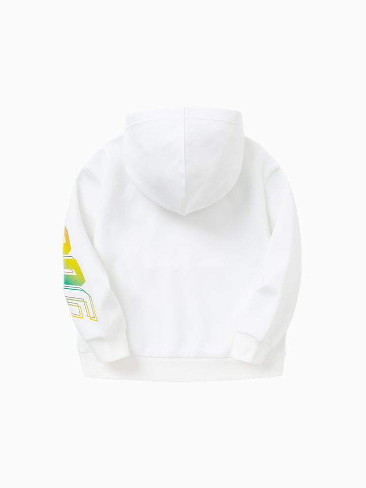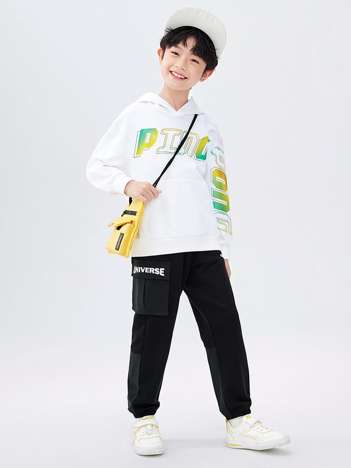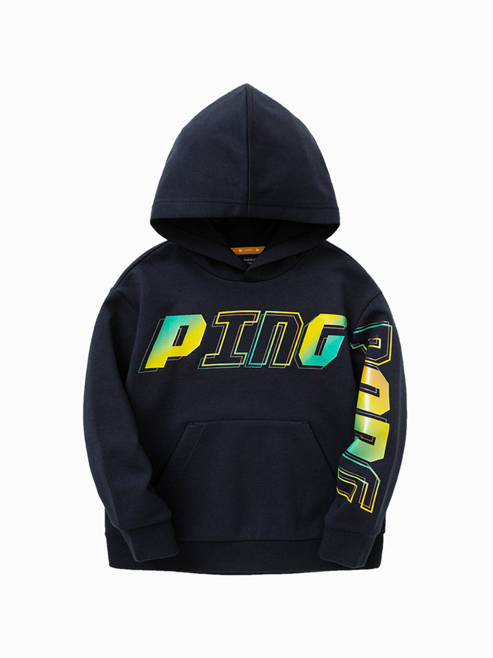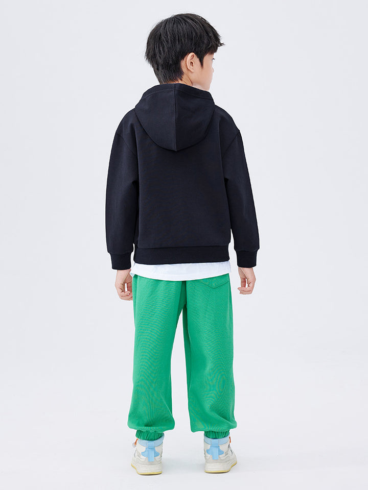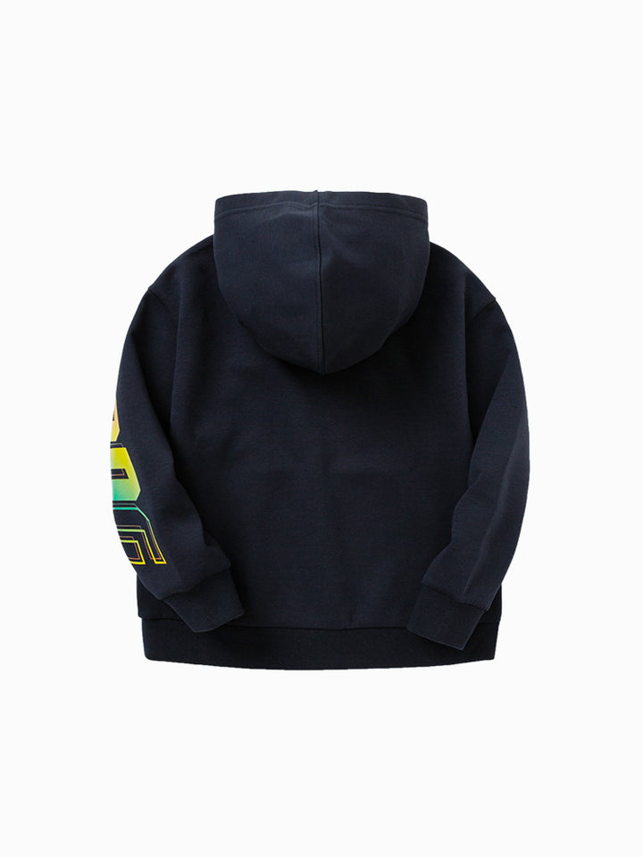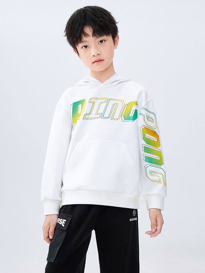 long sleeves casual boy hoodie sweatshirt, decorated with prints on the front side and on one sleeve, comes with a pocket on the front side and an attached hoodie collar