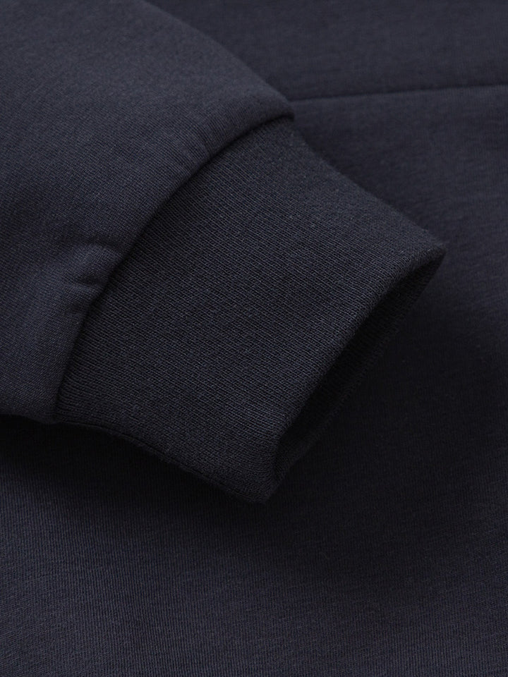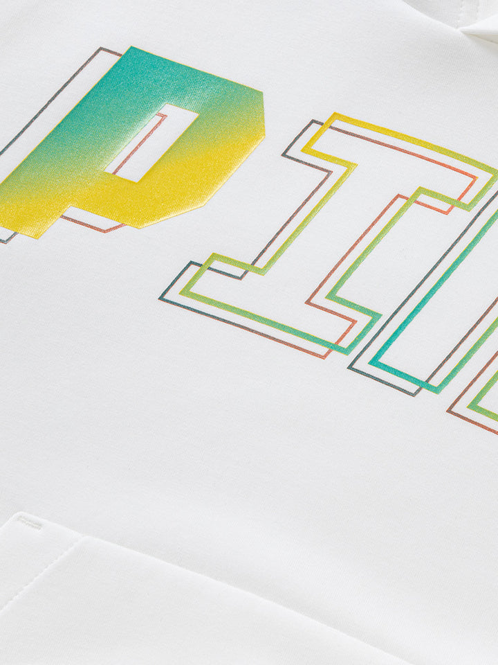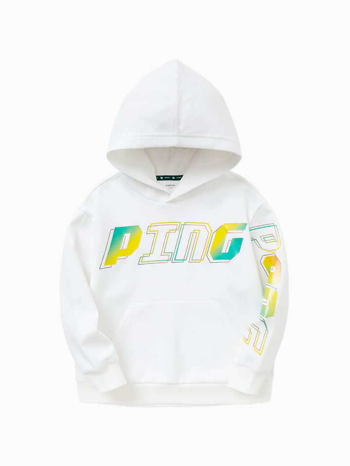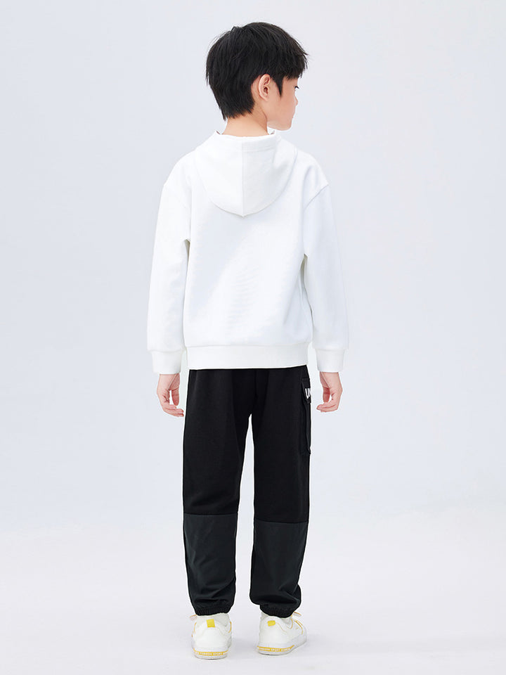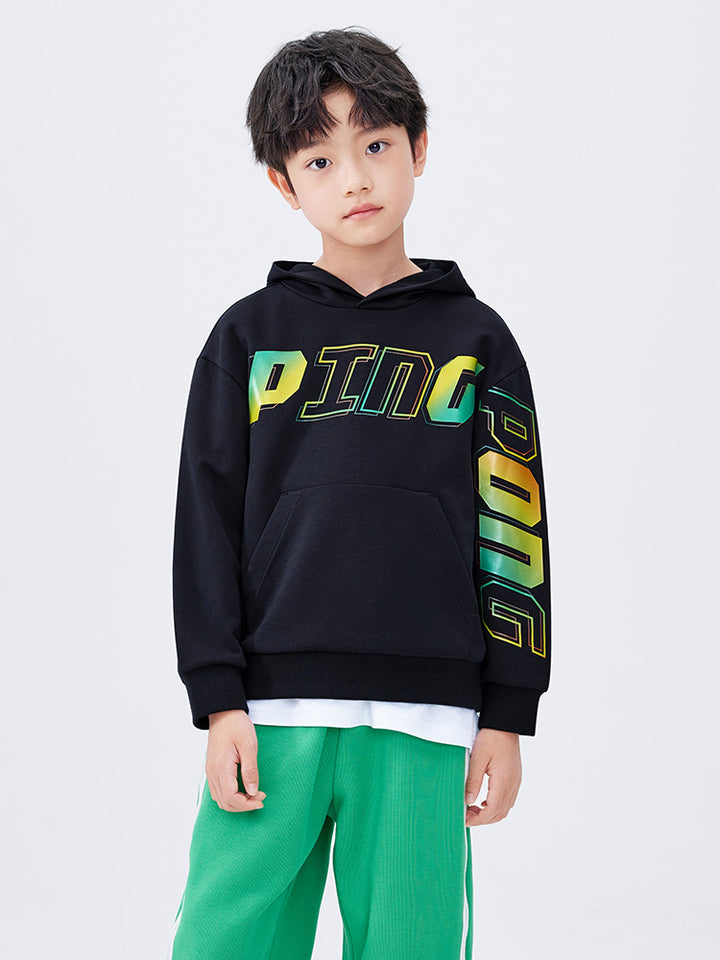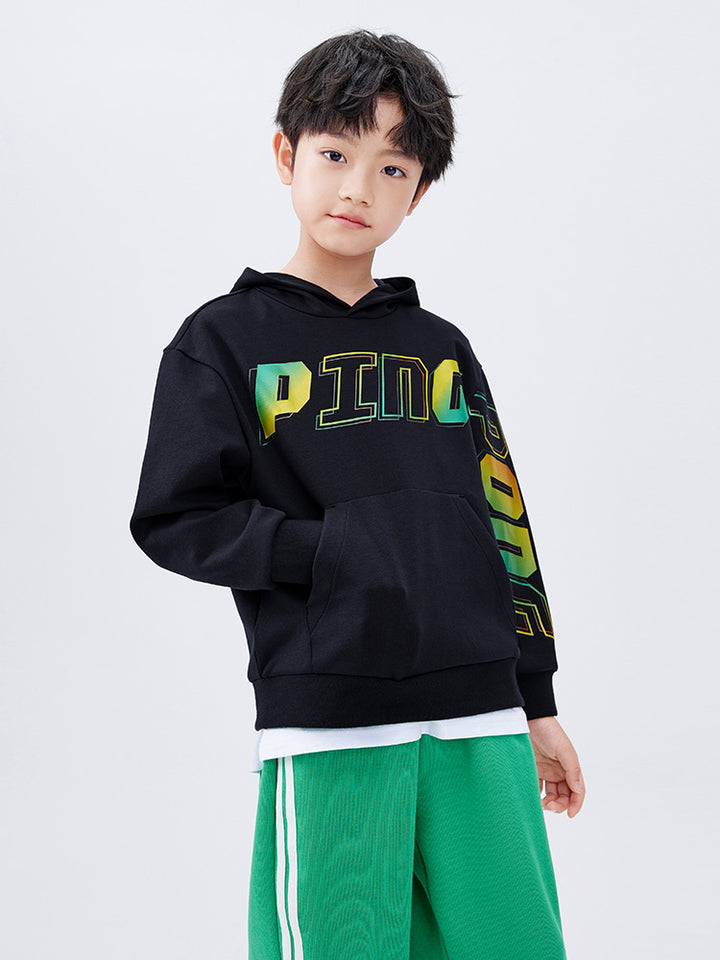 long sleeves casual boy hoodie sweatshirt, decorated with prints on the front side and on one sleeve, comes with a pocket on the front side and an attached hoodie collar