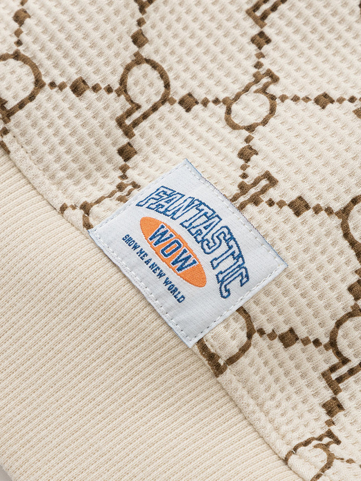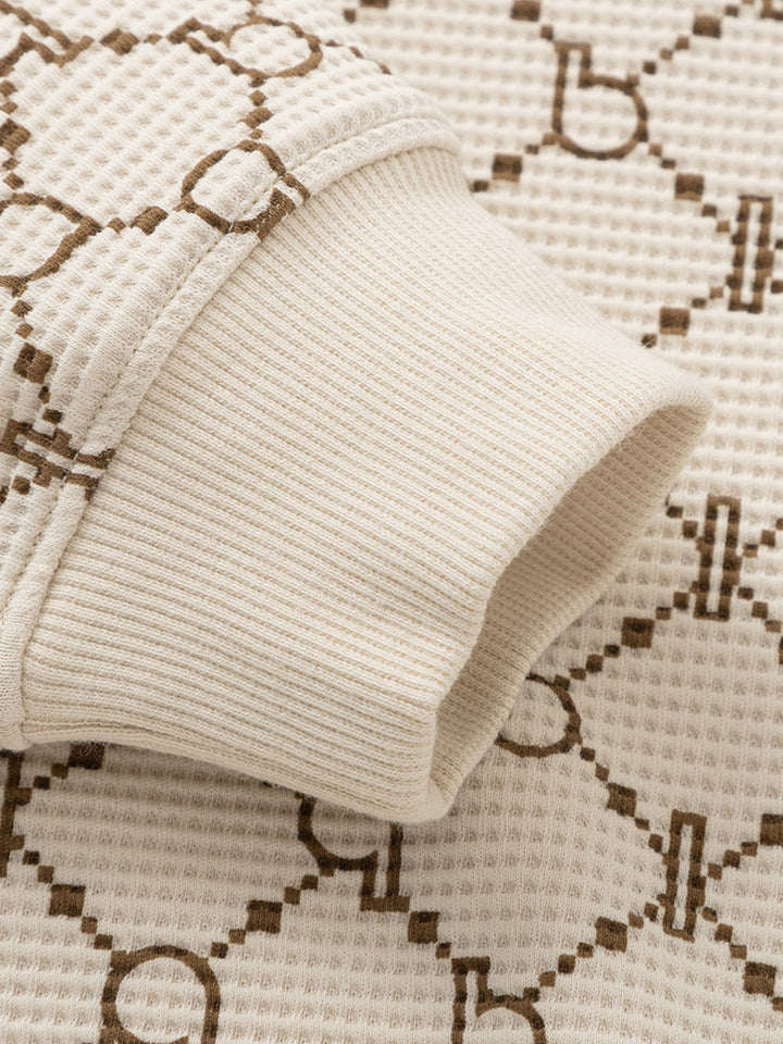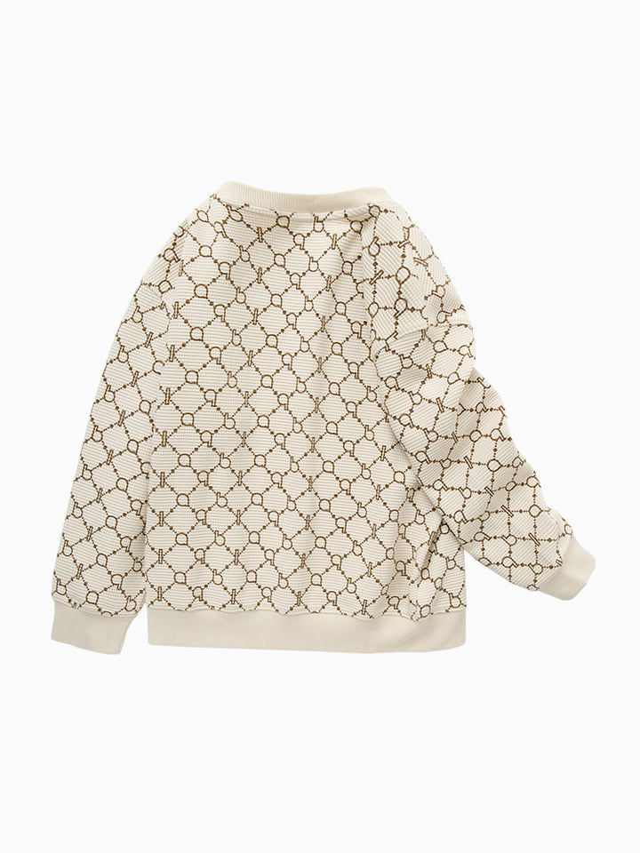 long sleeves casual sweatshirt in a textured pattern fabric, decorated with printed pattern on full design, comes with a rounded shape neckline