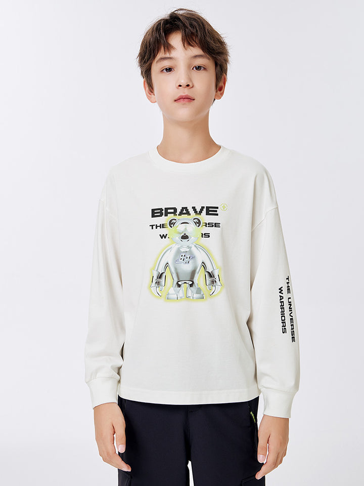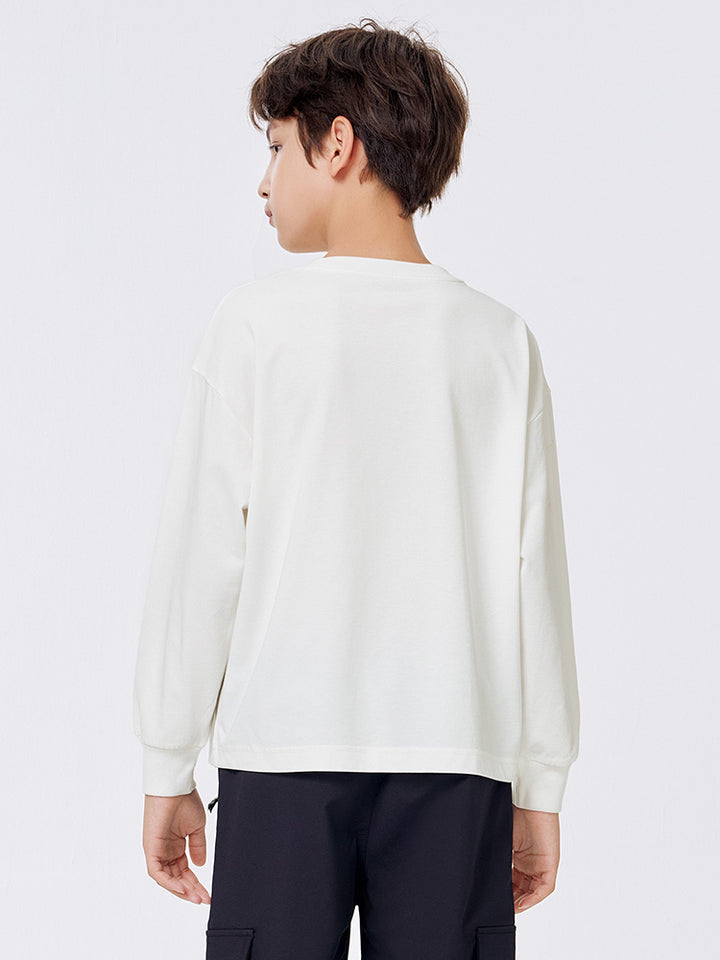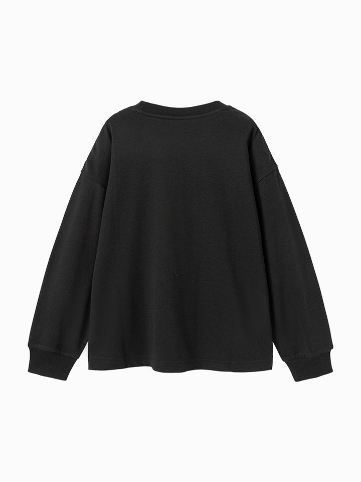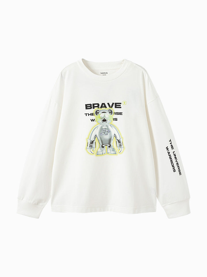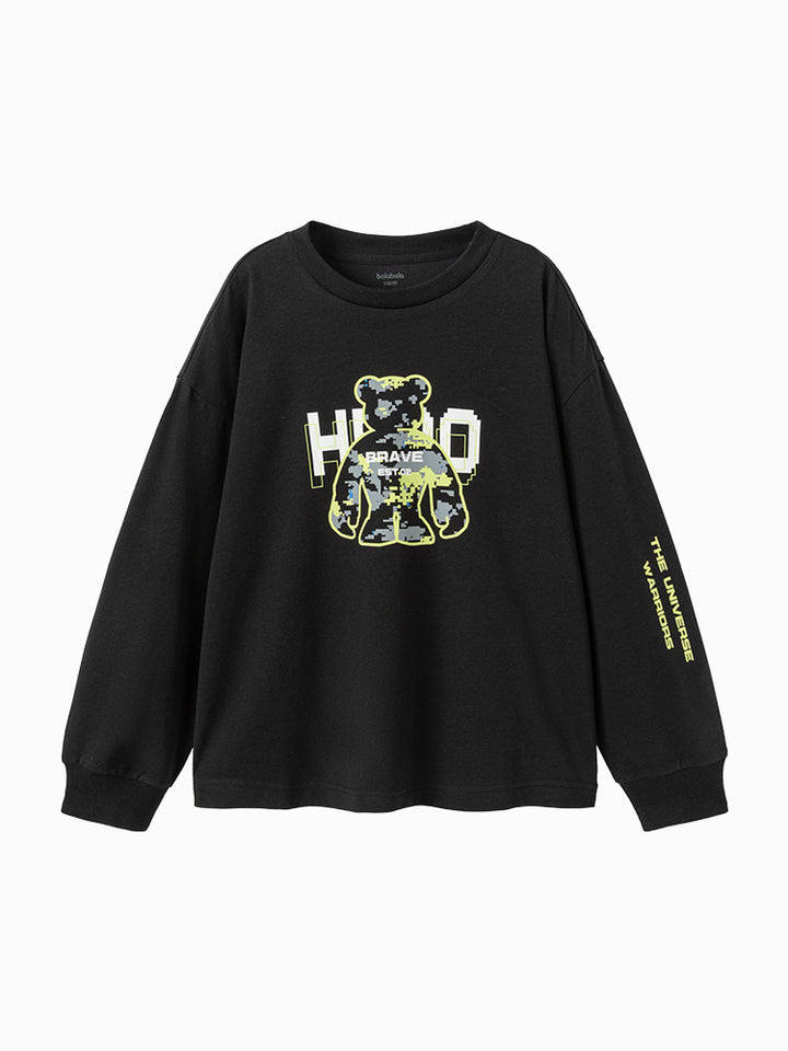 long sleeves casual t-shirt, decorated with prints on the front side and on one sleeve, comes with a rounded shape collar