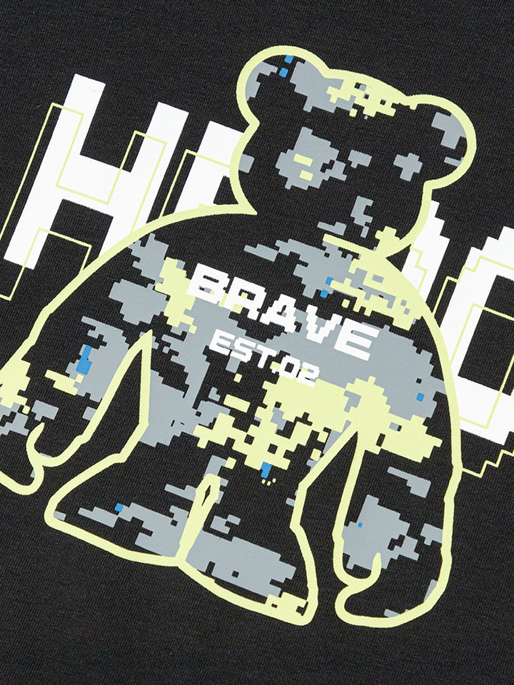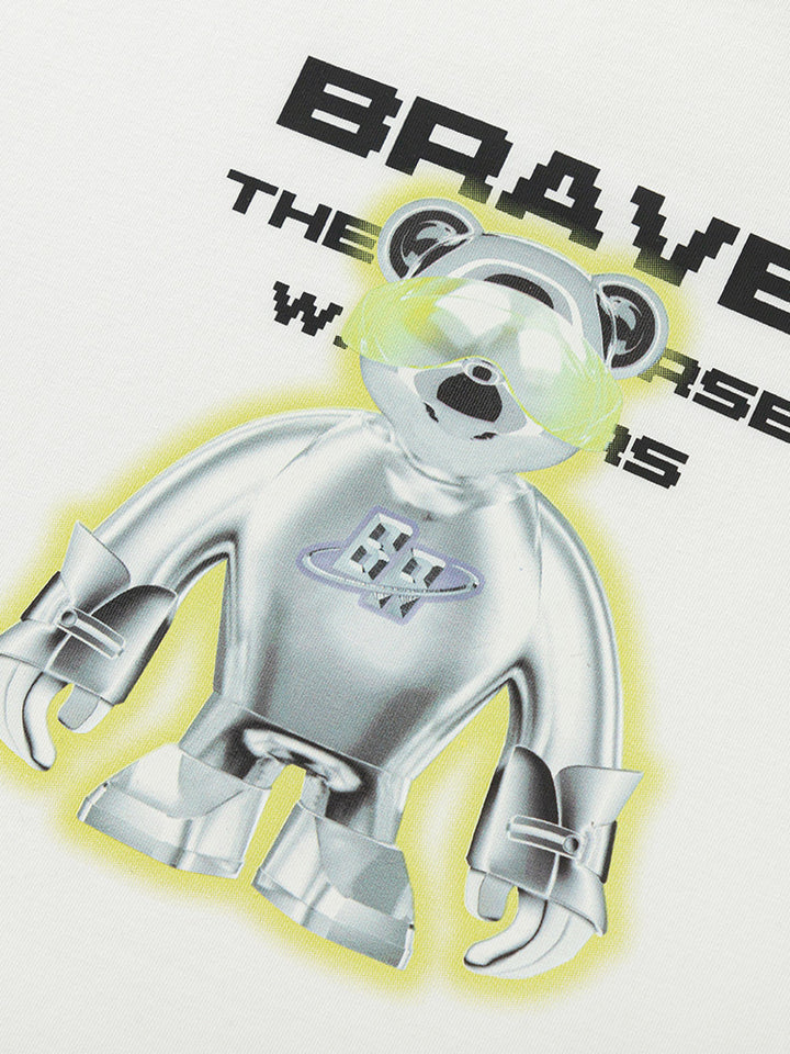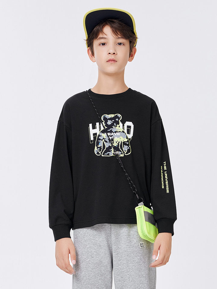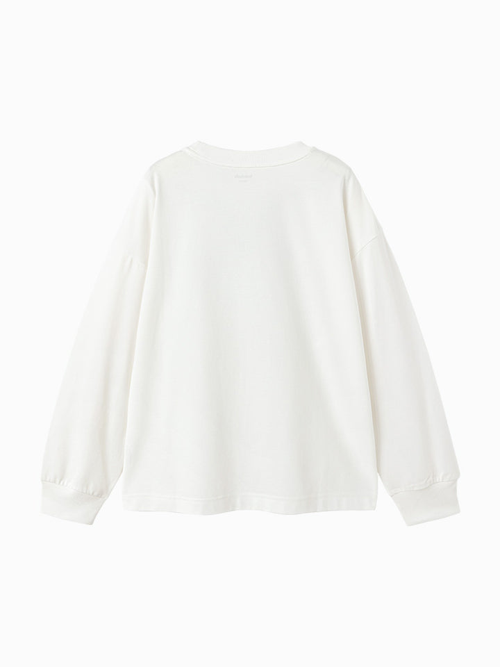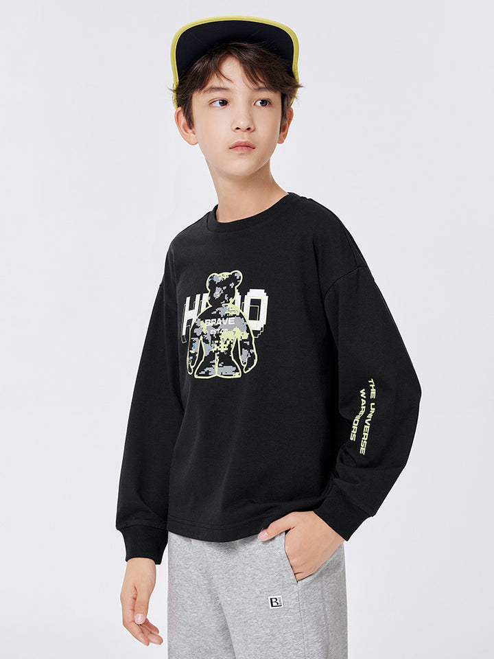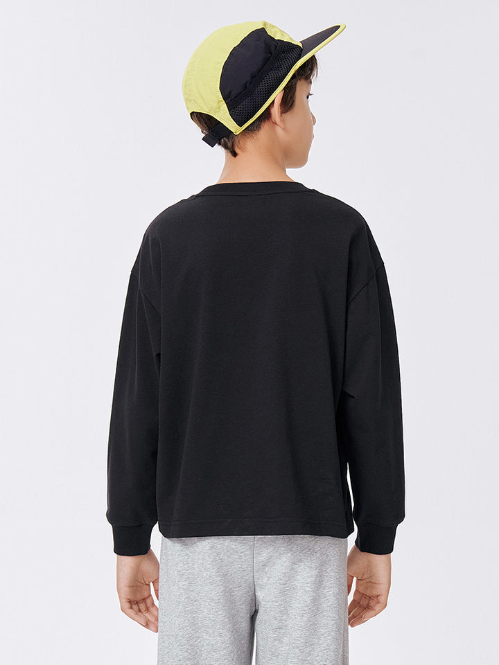 long sleeves casual t-shirt, decorated with prints on the front side and on one sleeve, comes with a rounded shape collar
