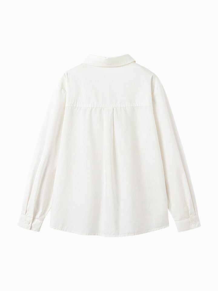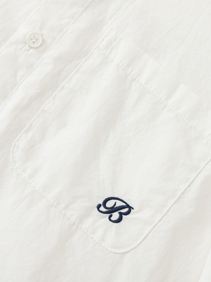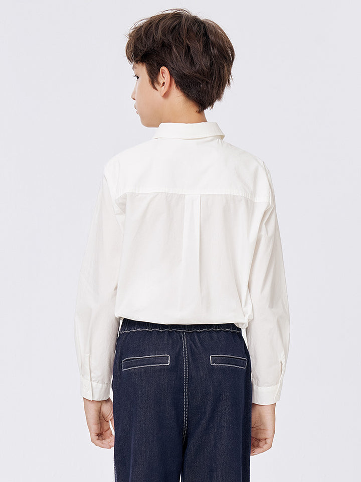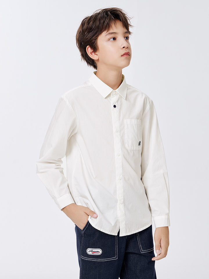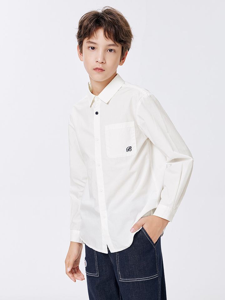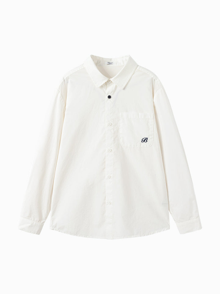 long sleeves casual shirt in a solid mono colored pattern, decorated with a small embroidery on chest frotn side, comes with front pocket, buttons for closure on the front side and with a classic collar