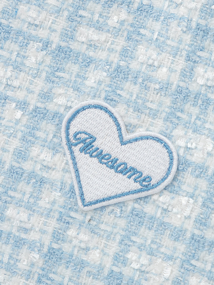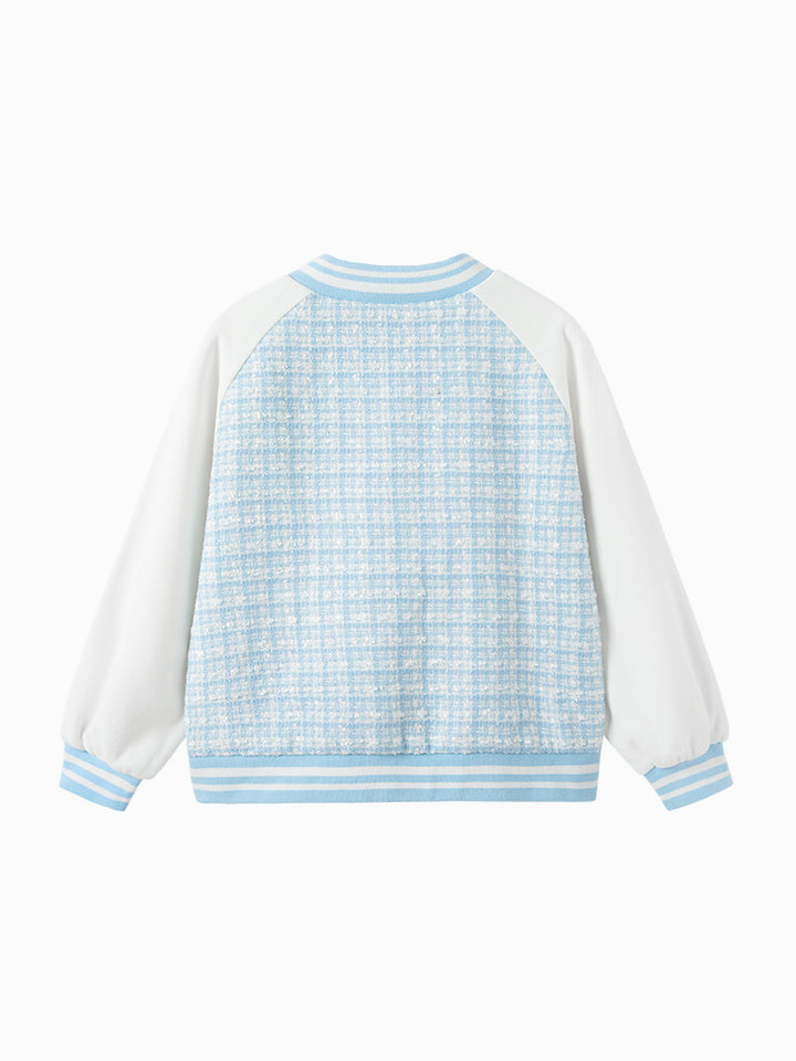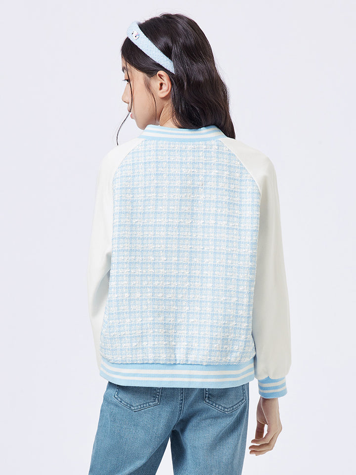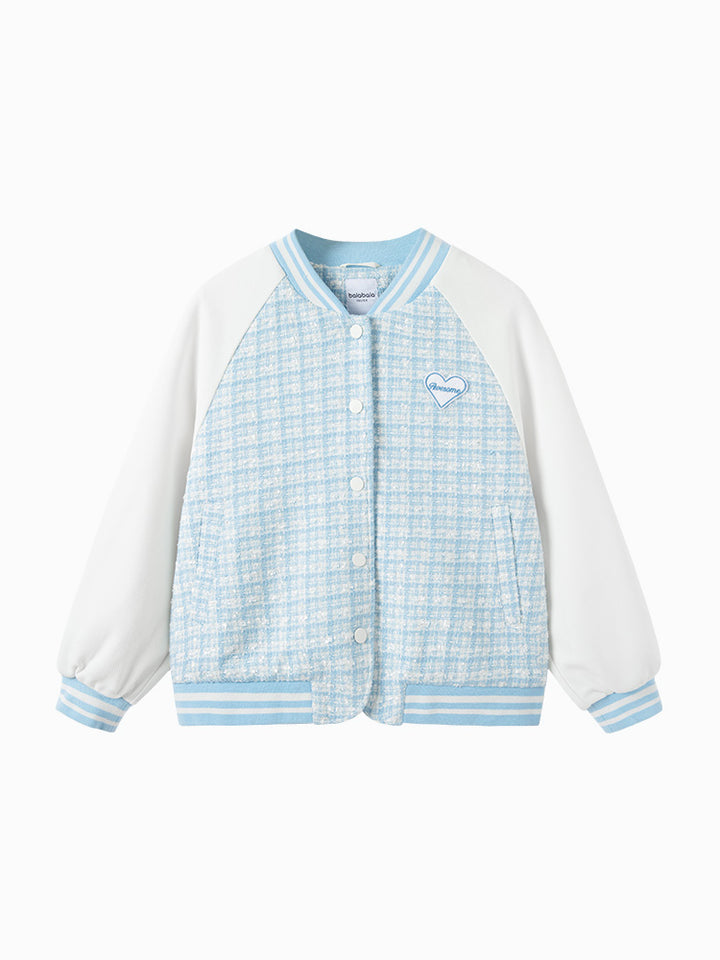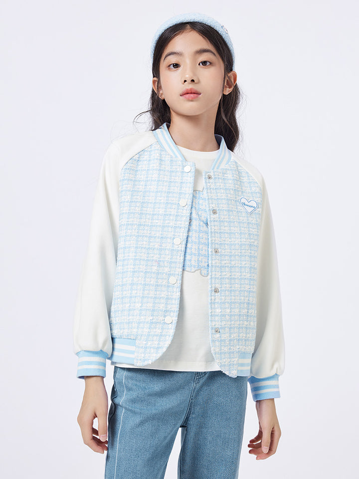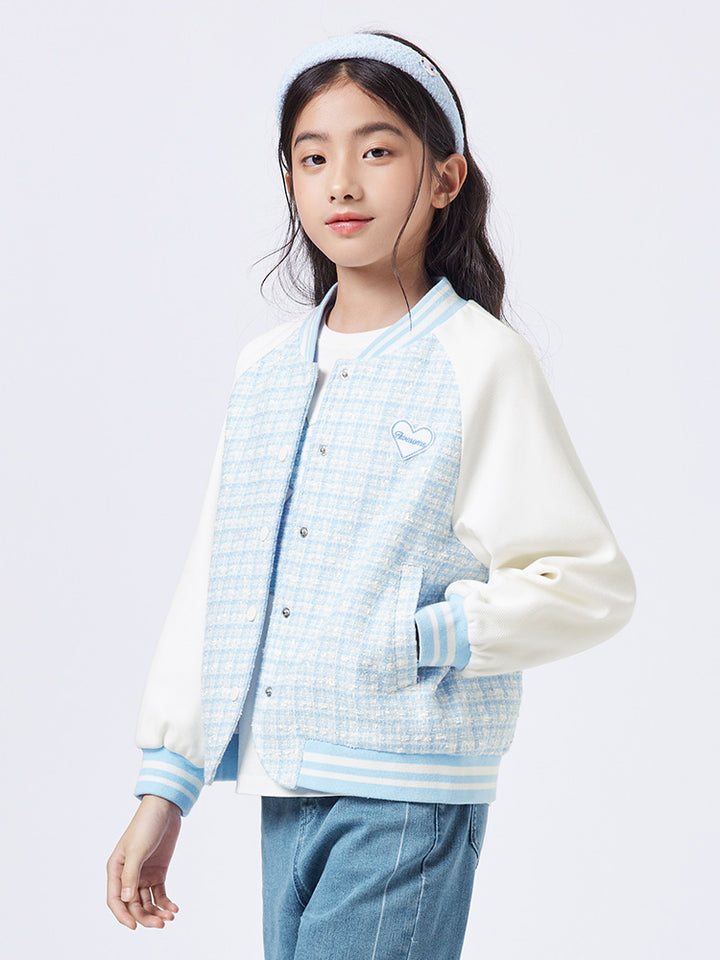 long sleeves casual jacket, decorated with a tued knitted fabric and a small embroidery detail onc hest front side, comes with front pockets, push buttons for closure on the front side and a rounded shape collar