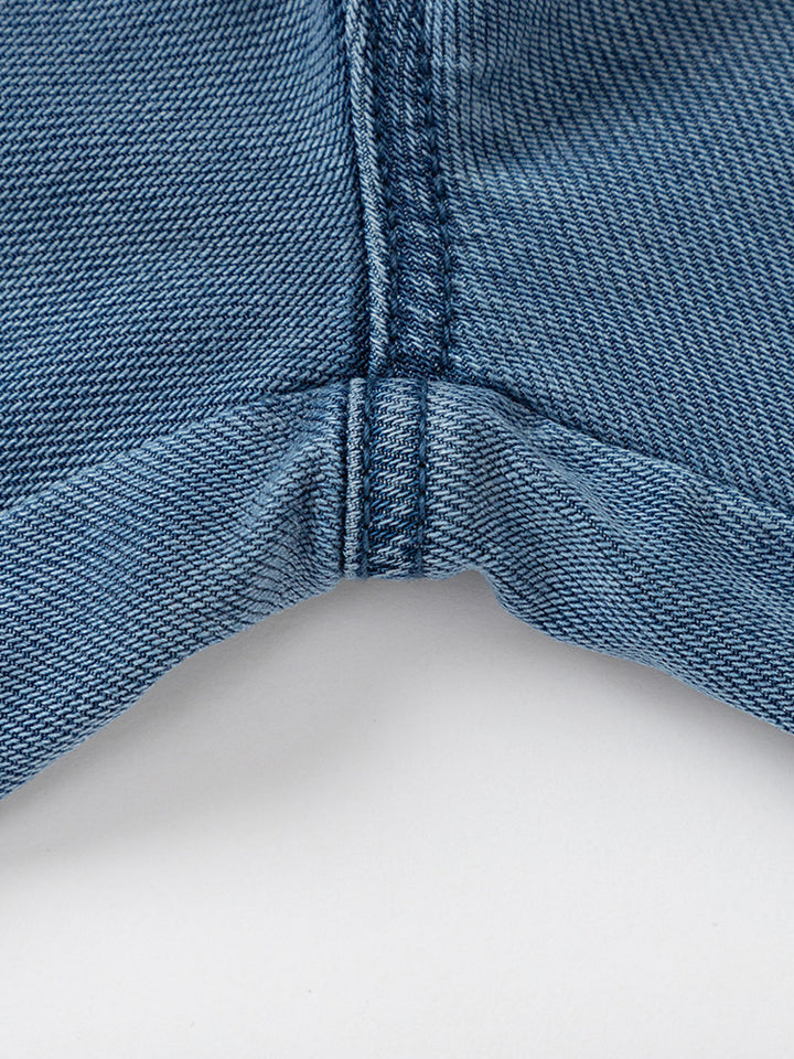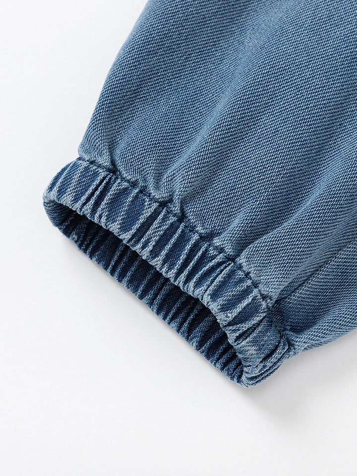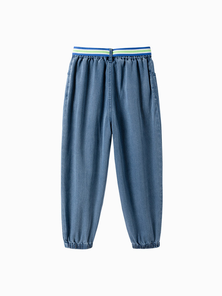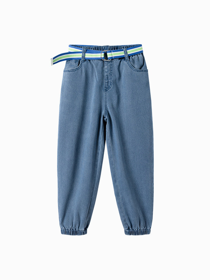 casual denim pants in a solid mono colored pattern, comes with pockets on the front side, comfy elasticated waistband and a buckled belt on waistline