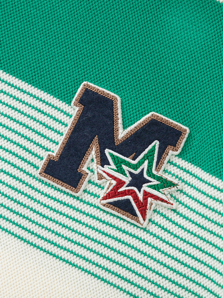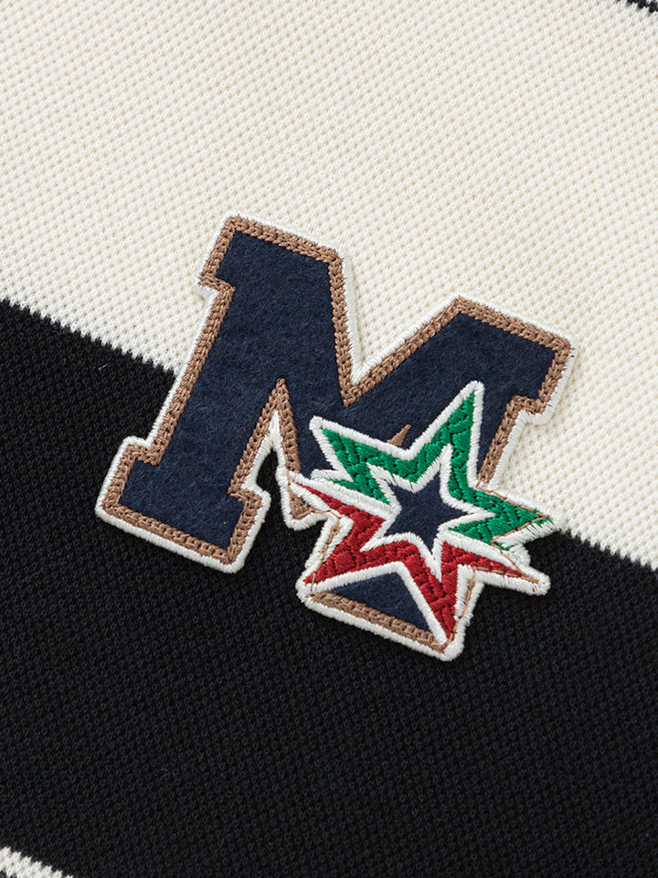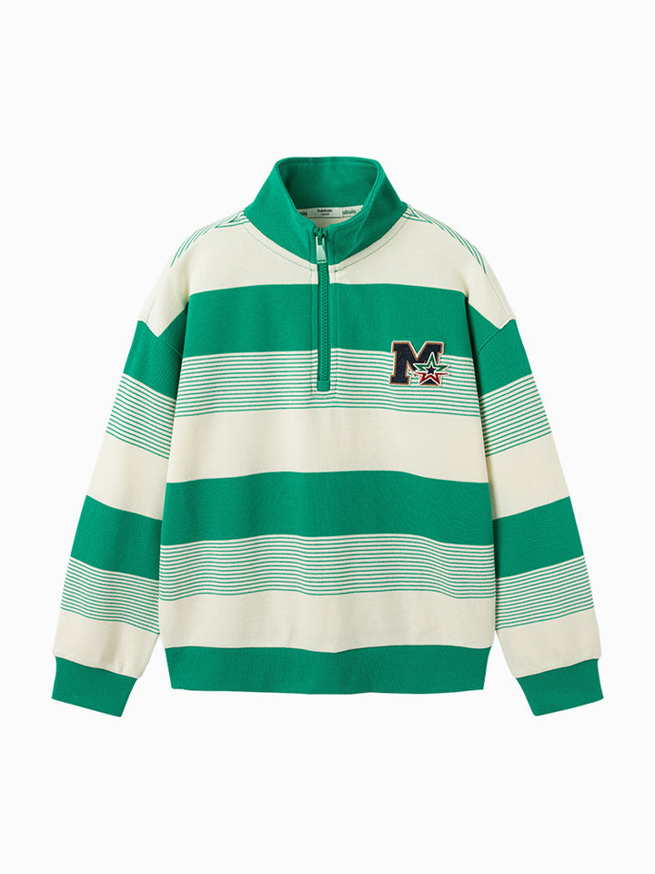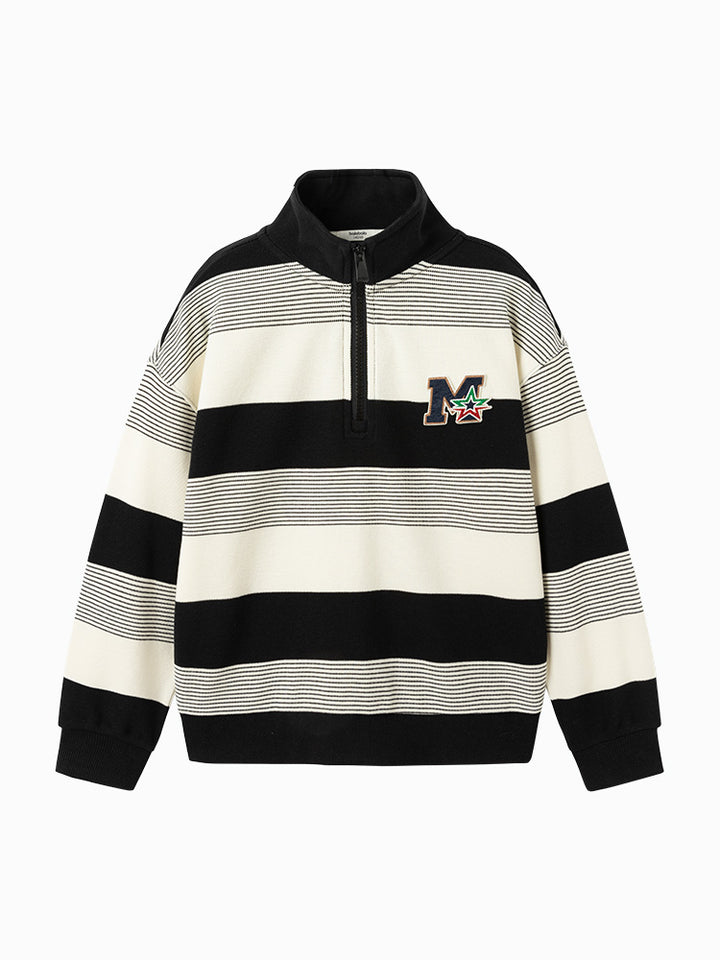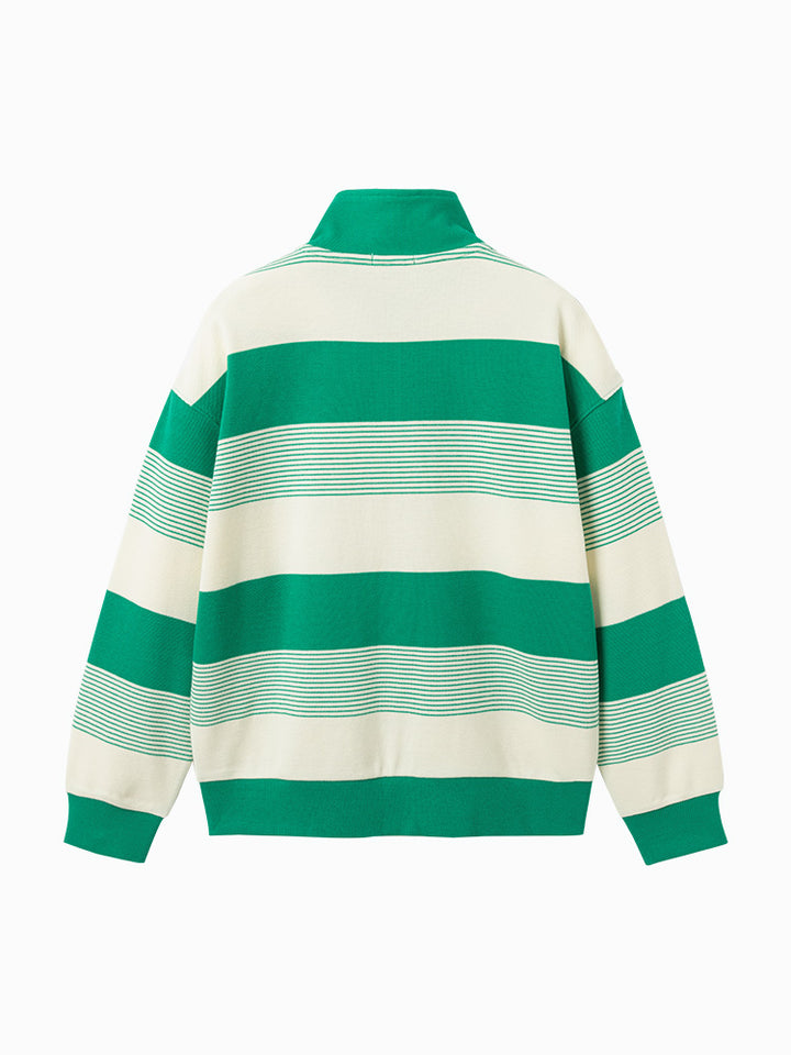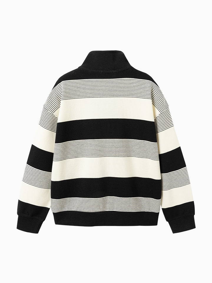 long sleeves casual blouse, decorated with a striped pattern and a knitted print on chest front side, comes with a zipper for closure on the front side and with a high collar