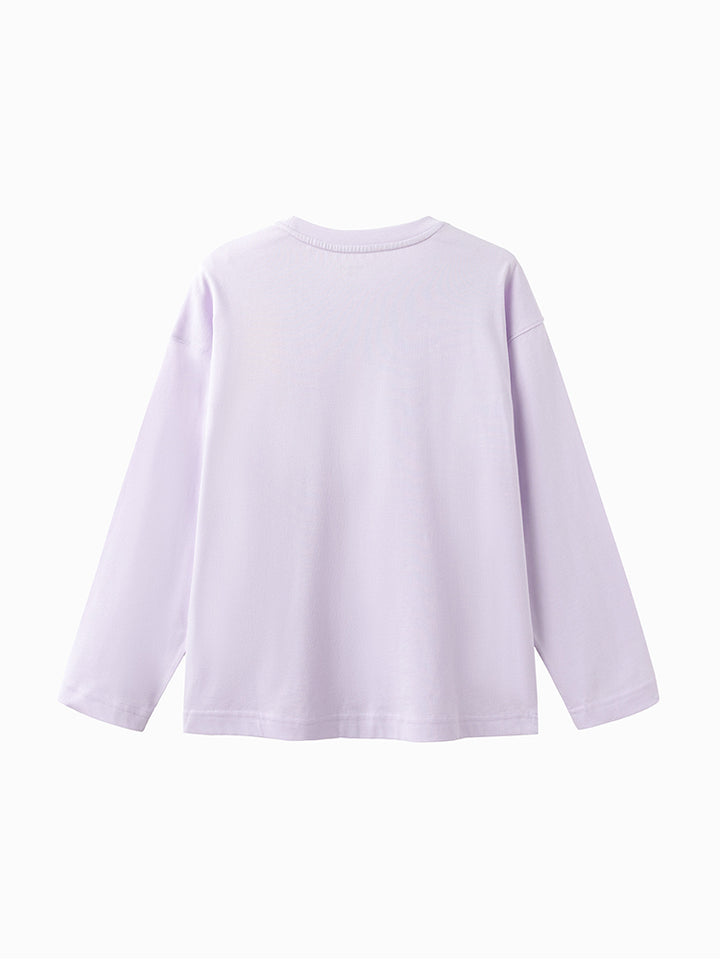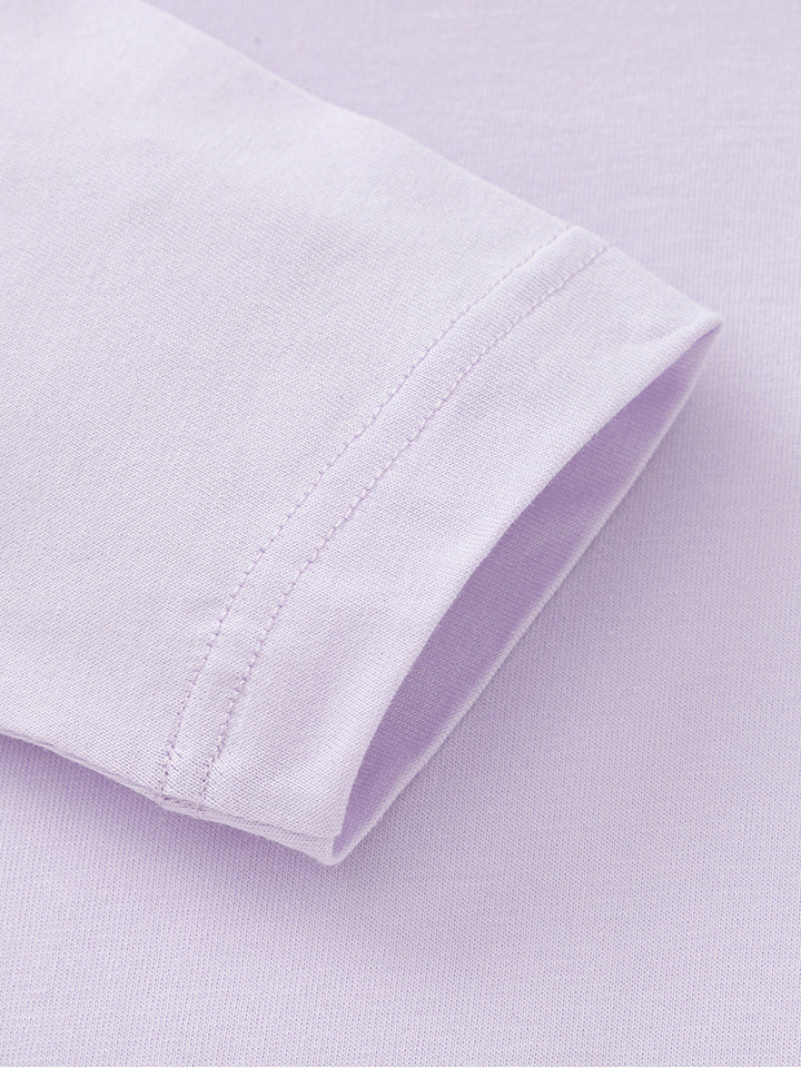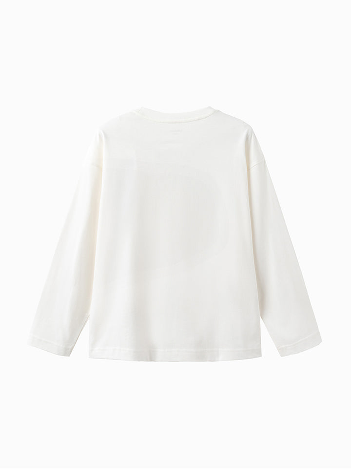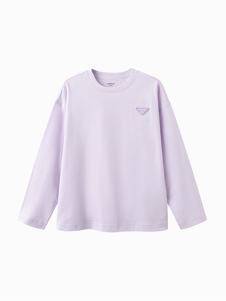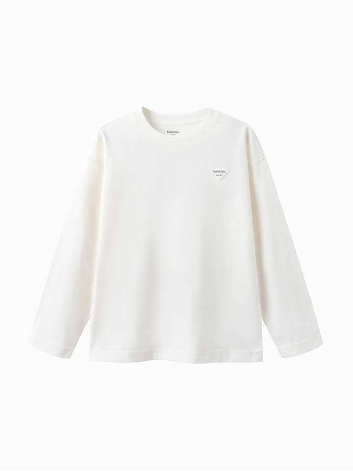 long sleeves casual unisex top in a solid mono colored pattern, decorated with a small patch on the front side, comes with a rounded shape neckline