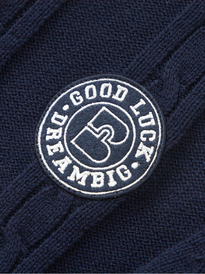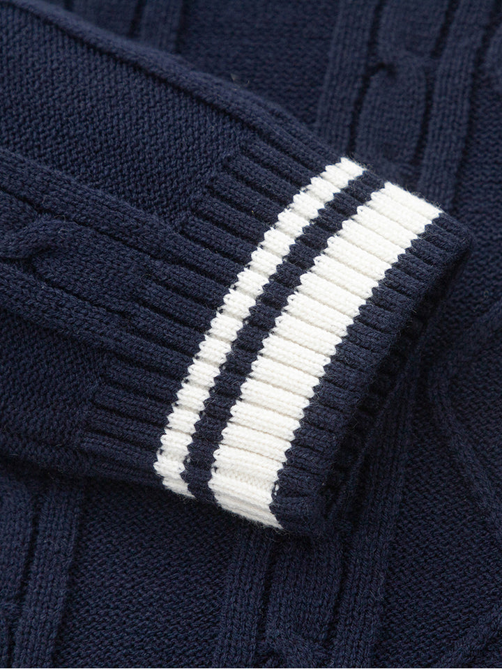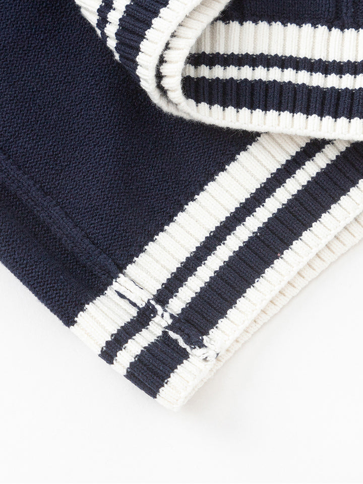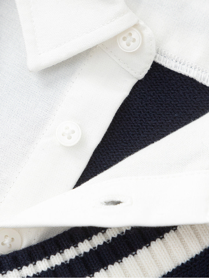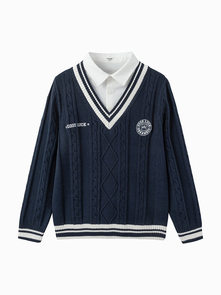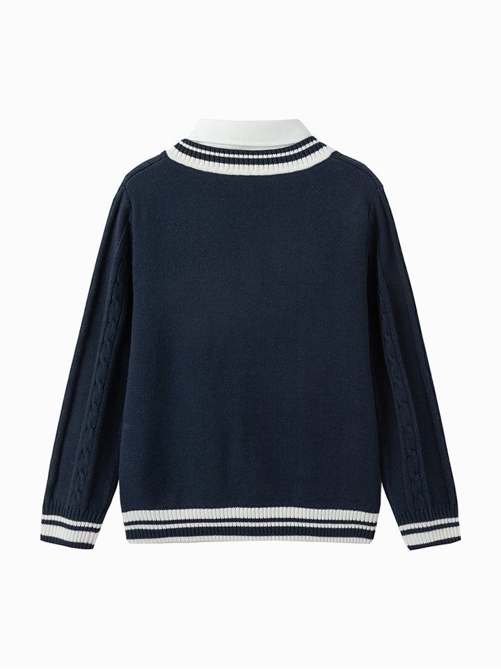 long sleeves boy sweater in a textured pattern knitted fabric, decorated with a contrast colored details and shirt collar design, comes with buttons for closure on the front side and with a classic regular collar