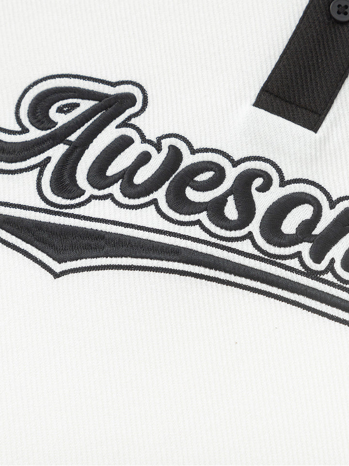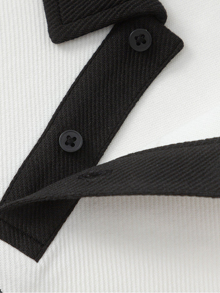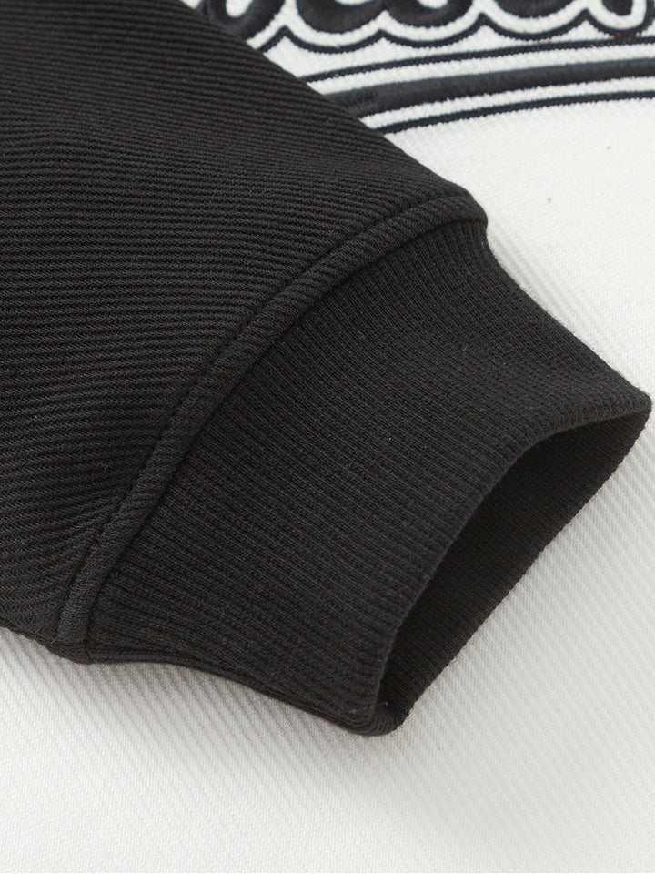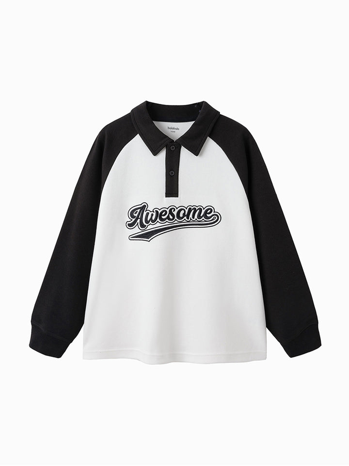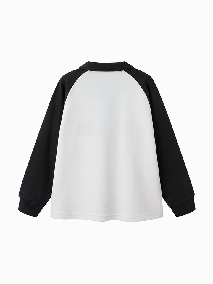 long sleeves girl swetshirt, decorated with print and contrast colored sleeves, comes with buttons for closure and a regular collar