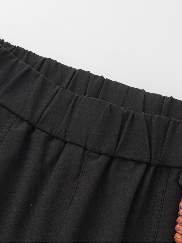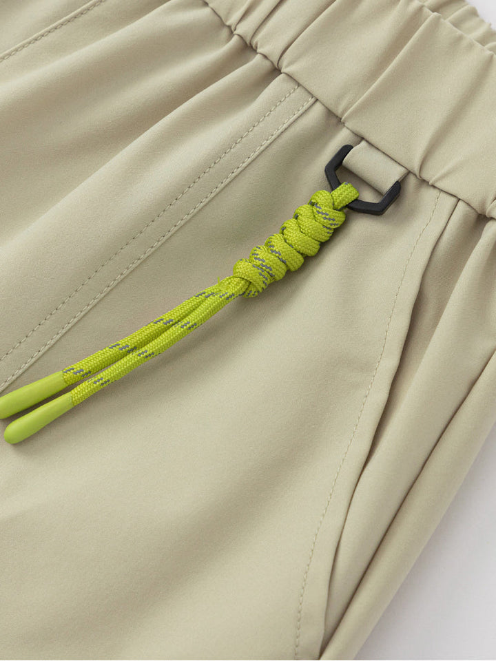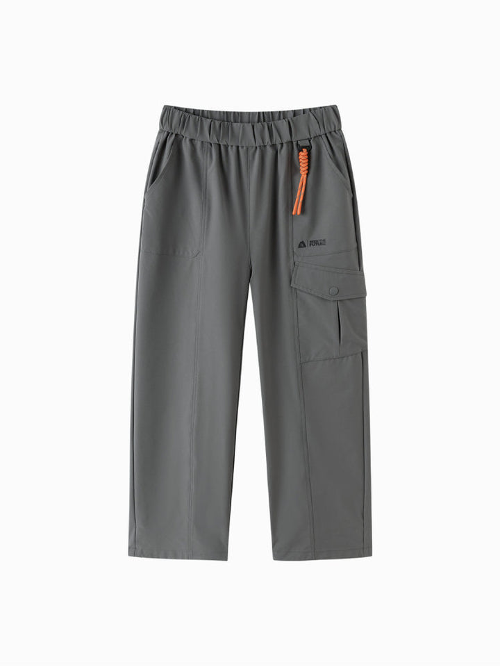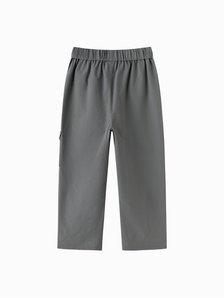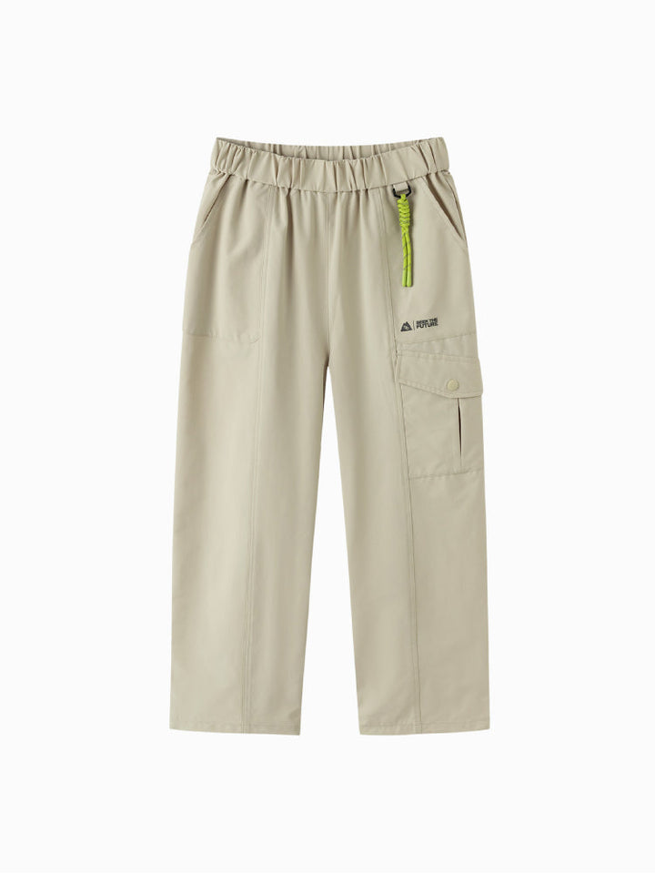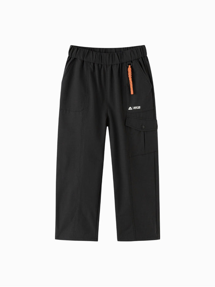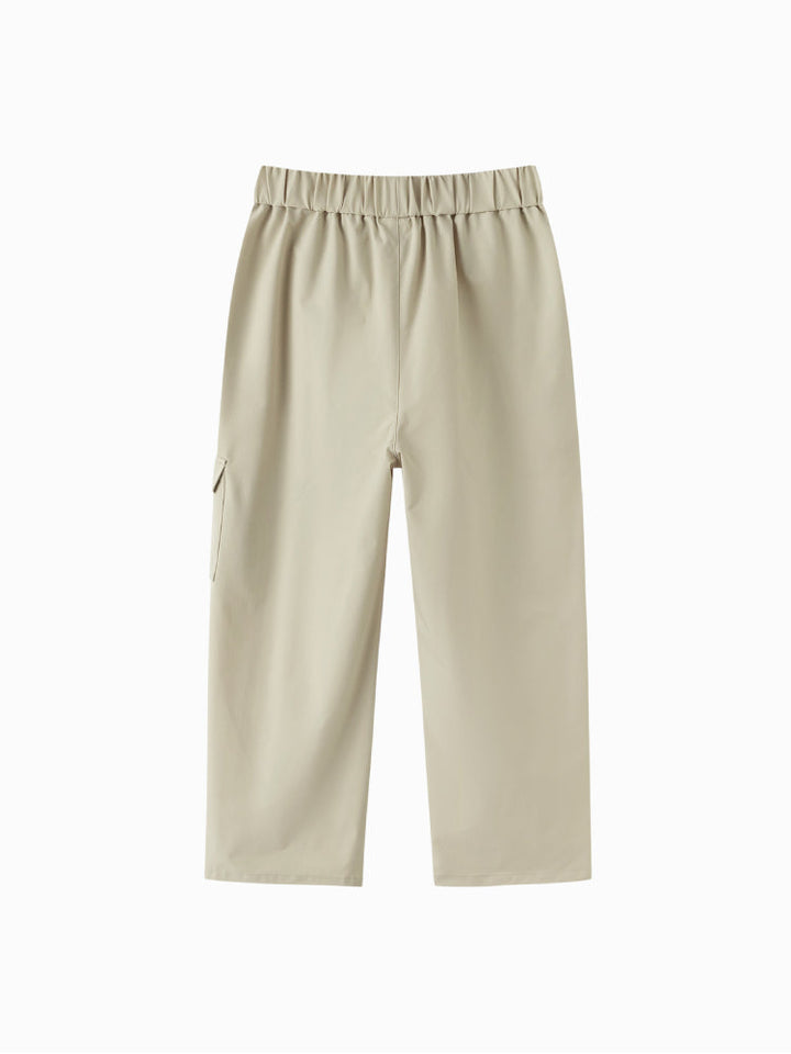 Relaxed-fit cargo pants with an elastic waistband, side pockets, and a large flap pocket on one leg for a functional, adventurous style.