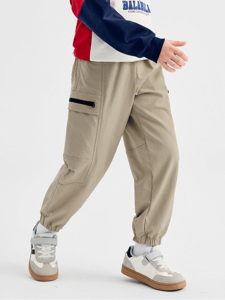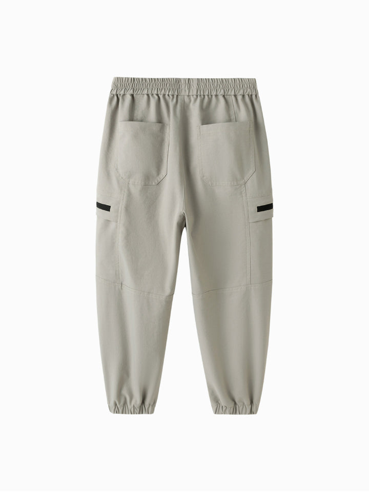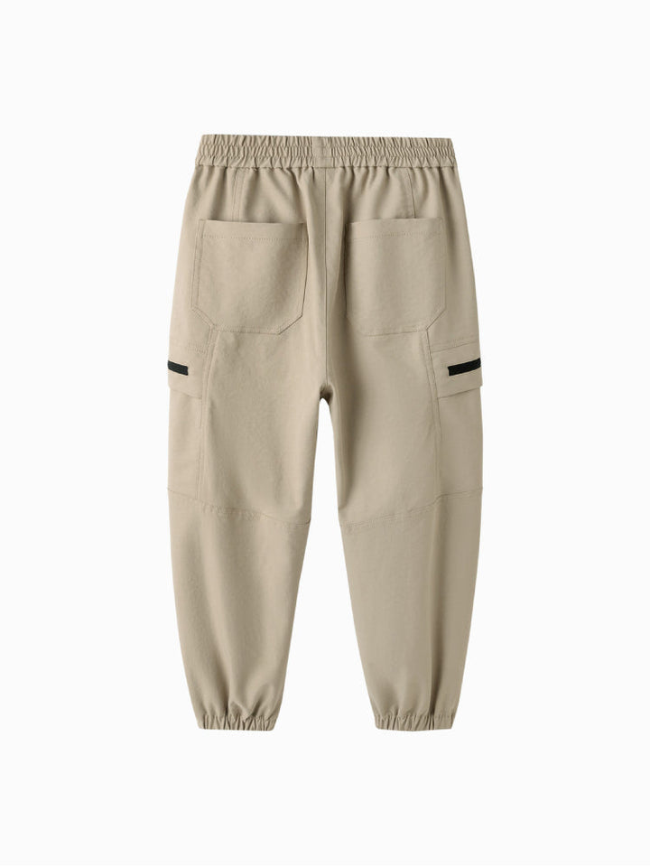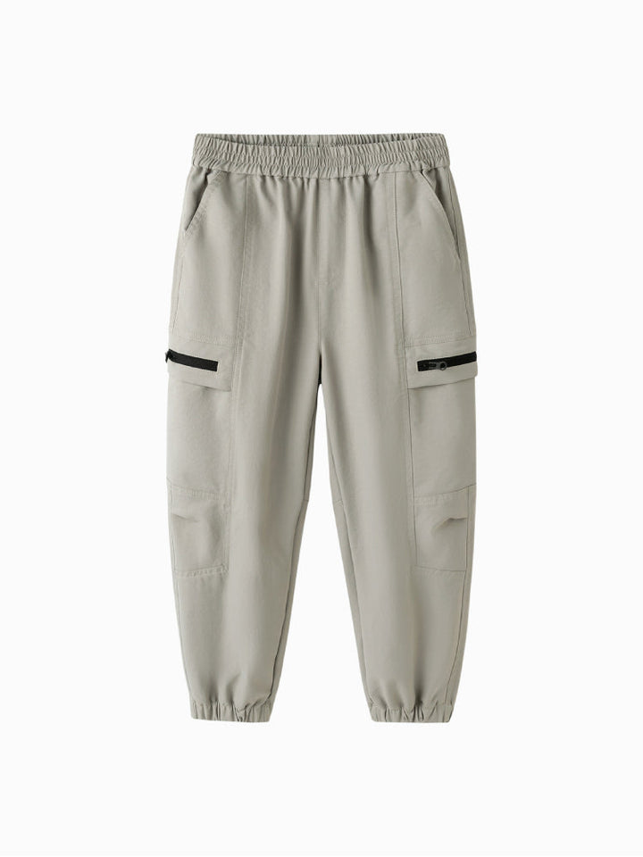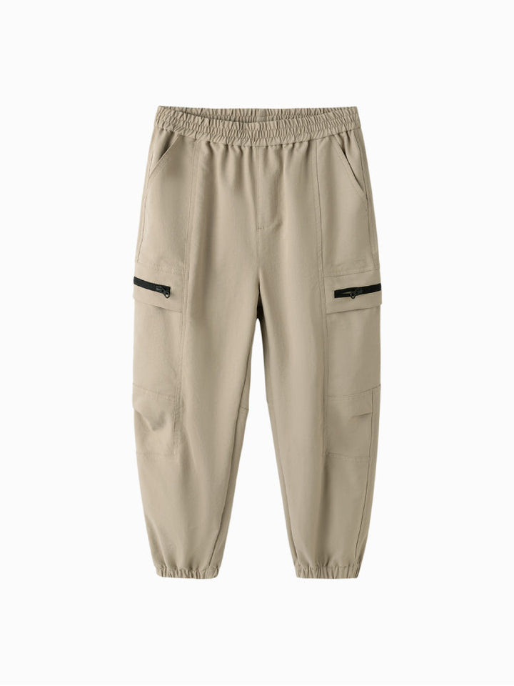Functional jogger cargo pants with an elastic waist, side pockets, and zippered pockets on the legs for secure storage.