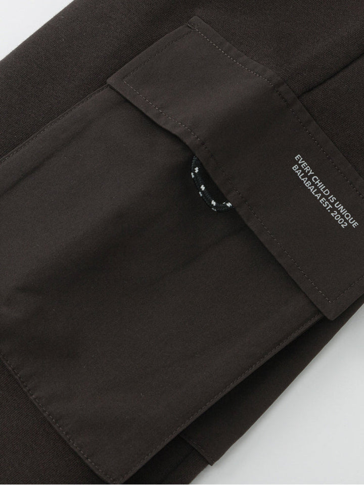 Jogger cargo pants with an elastic waist, side pockets, and oversized flap pockets on the legs for a bold utilitarian feel.