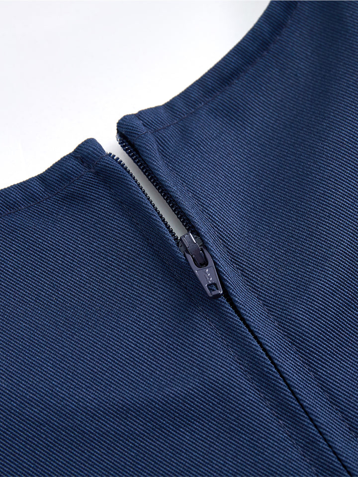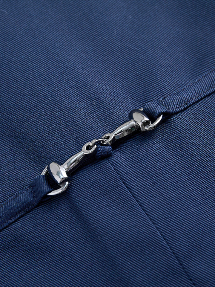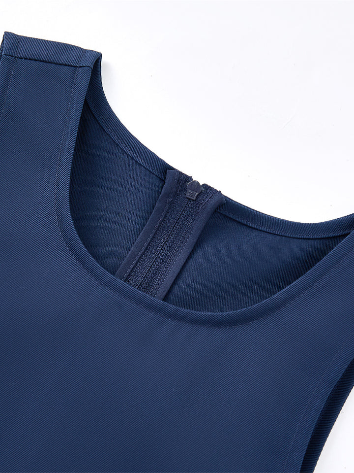 This elegant sleeveless dress features a solid color design with a stylish metal buckle detail at the front waist. It includes a back zipper closure and a classic round neckline, perfect for chic and sophisticated looks.